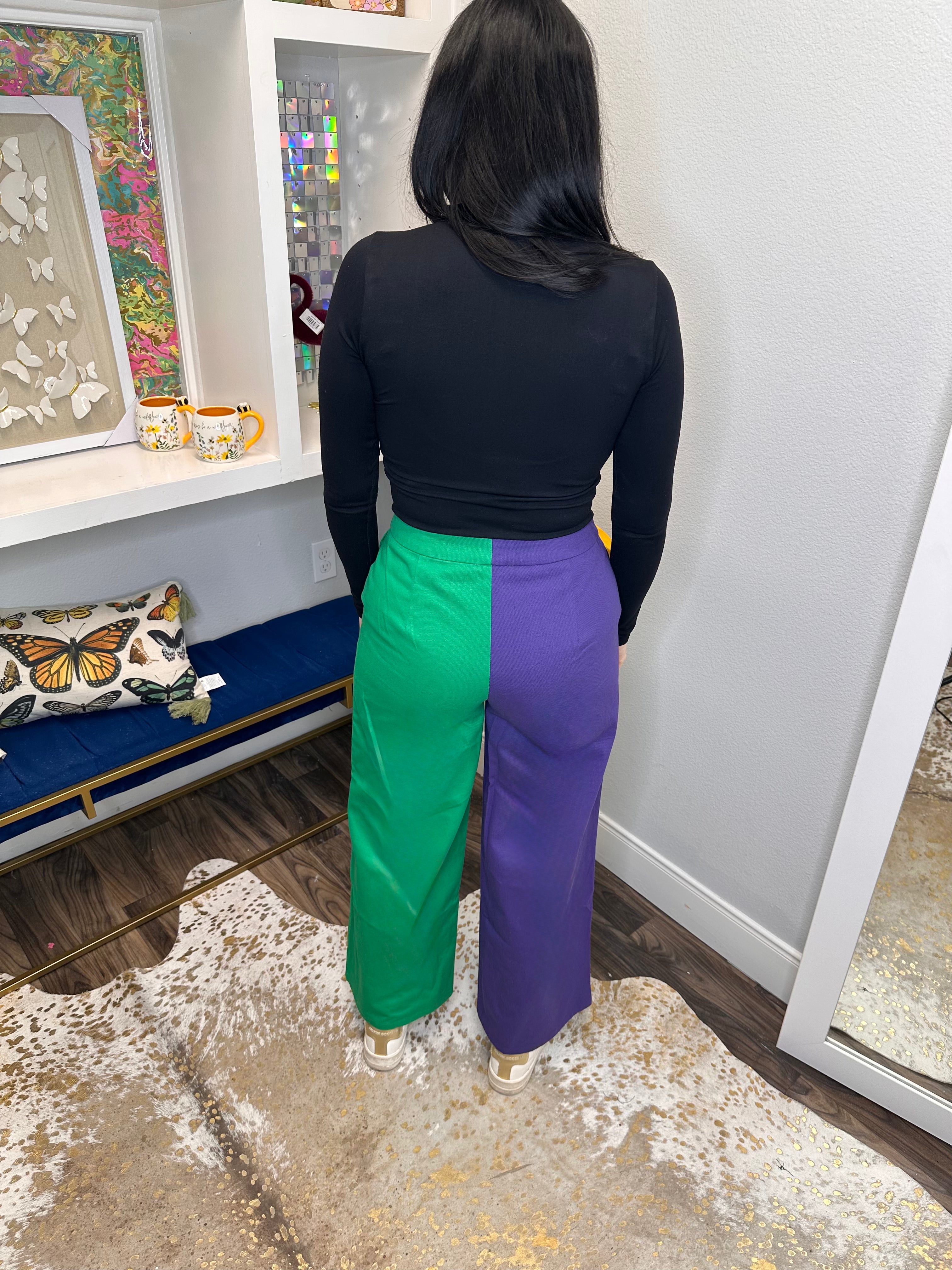 Celebrate in style with these vibrant Mardi Gras Symphony Side Bow Pants, featuring bold color blocking that captures the spirit of the season. The playful satin bow accent on the side adds a touch of elegance and movement to your look. Perfect for parties, parades, or anyone ready to bring festive flair to their wardrobe. These statement pants blend comfort with eye-catching design, making them an instant conversation starter at any celebration.