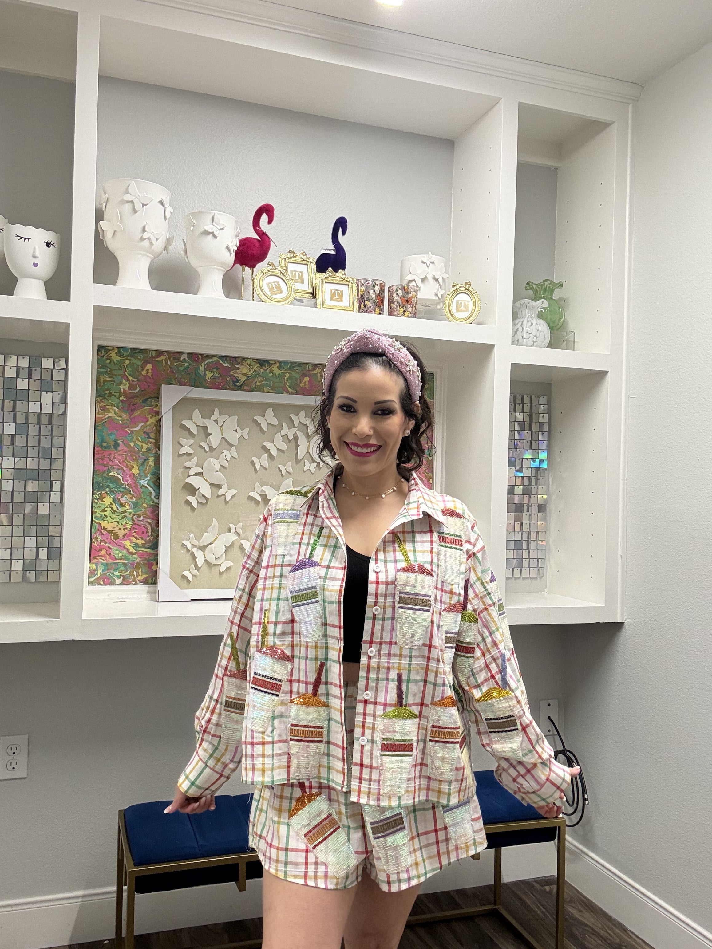 Bring the party wherever you go in this vibrant rainbow plaid button-up! Crafted from soft cotton, this long-sleeve top features a bold daiquiri-inspired color palette that's impossible to ignore. Perfect for mixing prints, layering over your favorite tee, or making a statement all on its own. Whether you're channeling your inner sparkle queen or just want to add some color-pop fun to your wardrobe, this playful piece delivers personality with every wear.