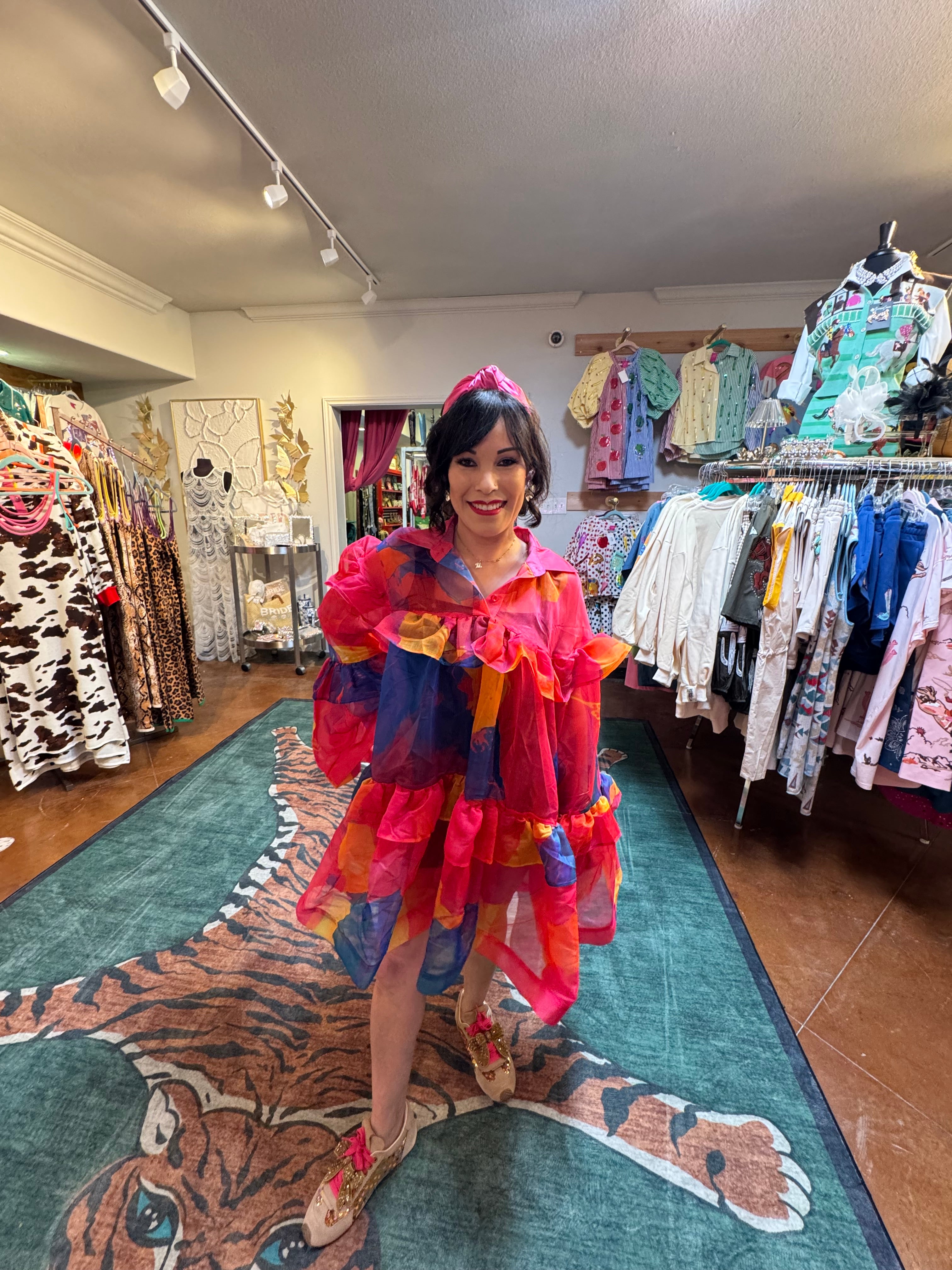 Elevate your wardrobe with the Rio Simple Mini Dress, a stunning piece that combines elegance with modern flair. This collared mini dress features long bell sleeves that create a graceful silhouette, while sheer layered ruffles add dimension and movement to the overlay. The delicate ruffle detailing brings a romantic touch perfect for date nights, brunch outings, or elevated casual occasions. The collared neckline offers a polished finish, making this dress versatile enough to style with heels for evening wear or sneakers for a relaxed daytime look. Lightweight and flattering, this dress is your go-to piece for making an effortless statement.