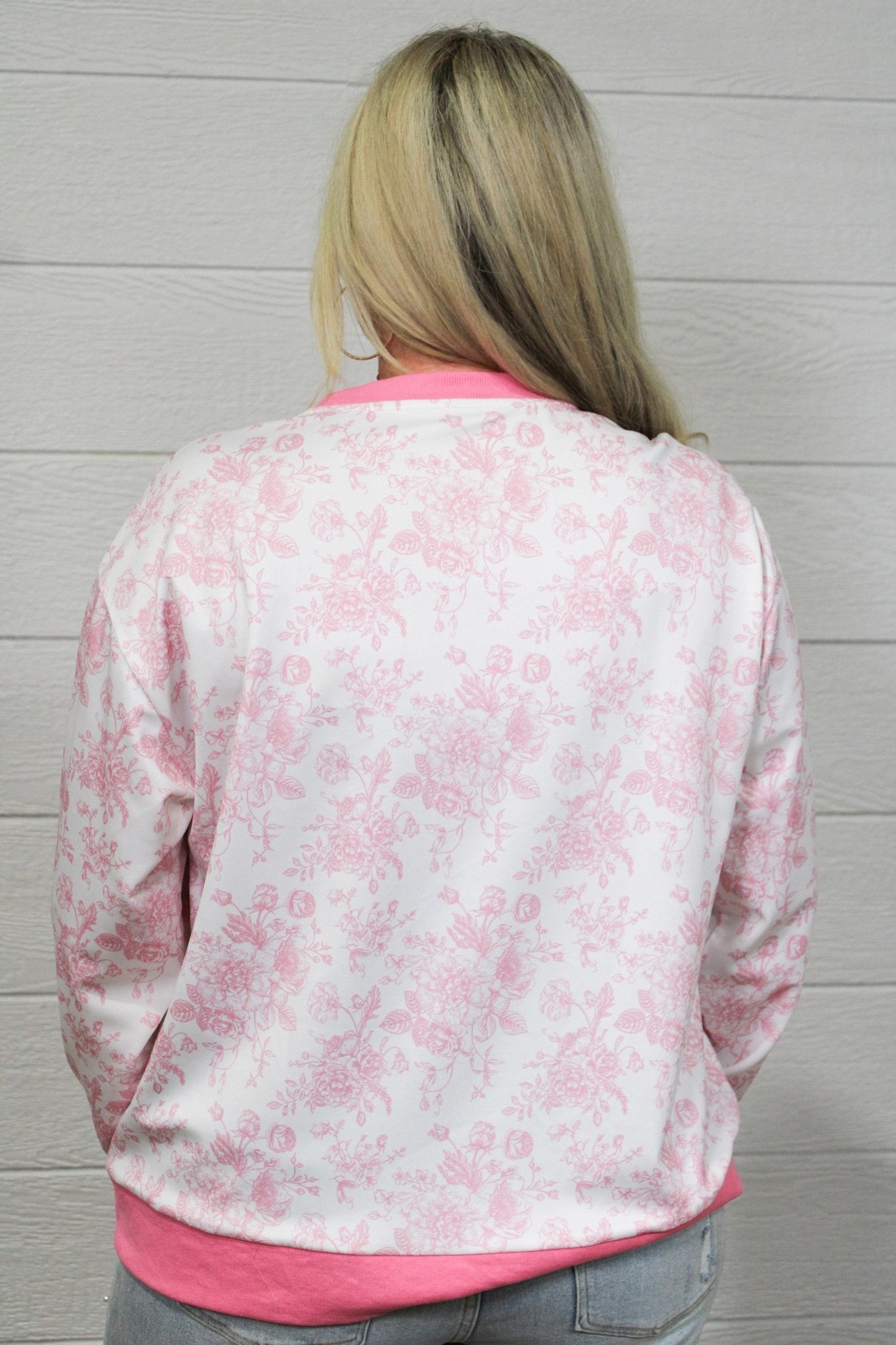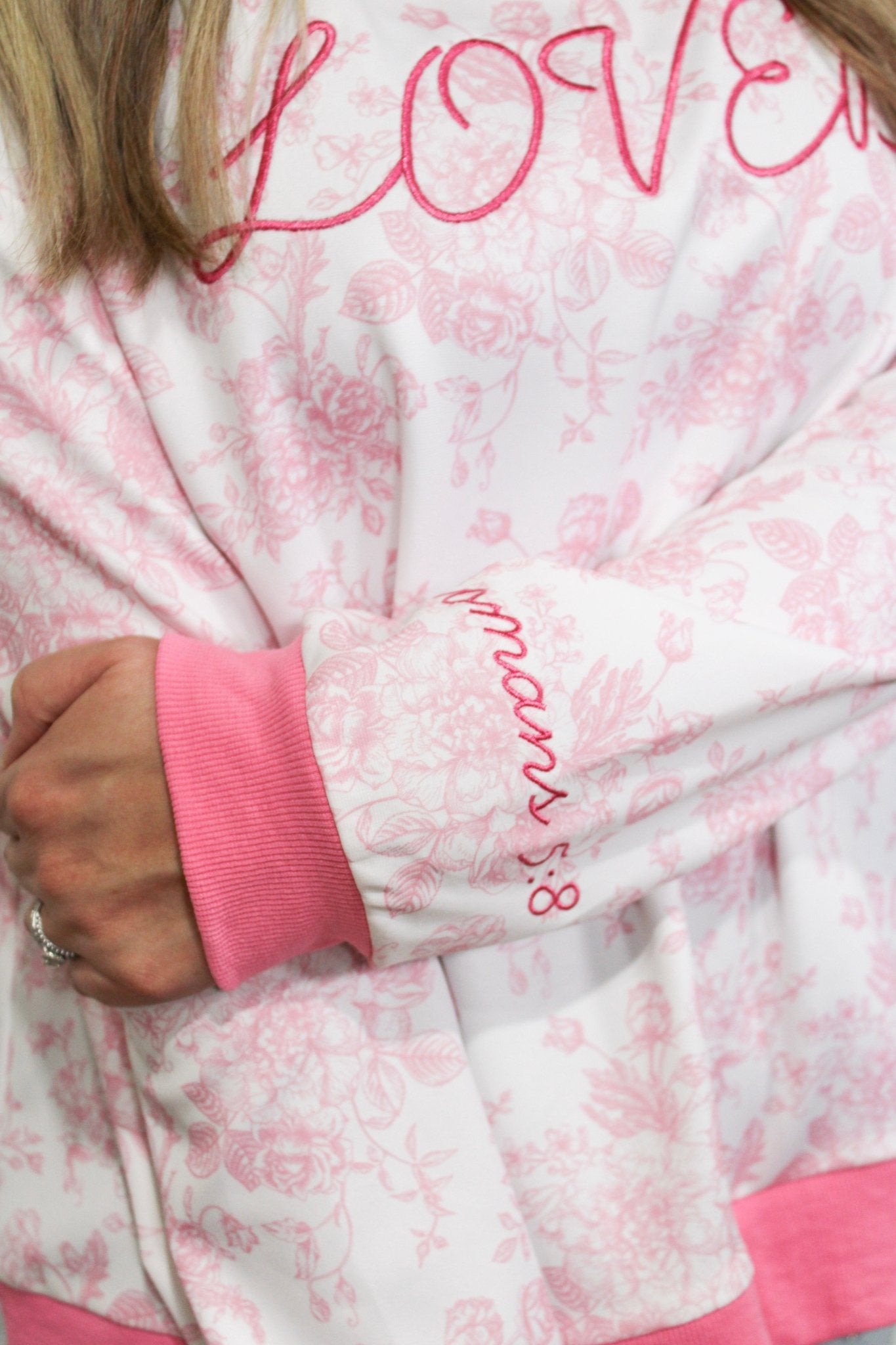 Wrap yourself in cozy charm with the Stella Sweatshirt in soft pink. This playful pullover features the word "loved" emblazoned across the front in a sweet toile pattern, making it the perfect everyday piece for spreading good vibes. Ideal for casual outings, relaxed weekends, or whenever you need a hug in fabric form. Comfortable, cute, and unapologetically romantic—because life's too short not to wear your heart on your sleeve.
