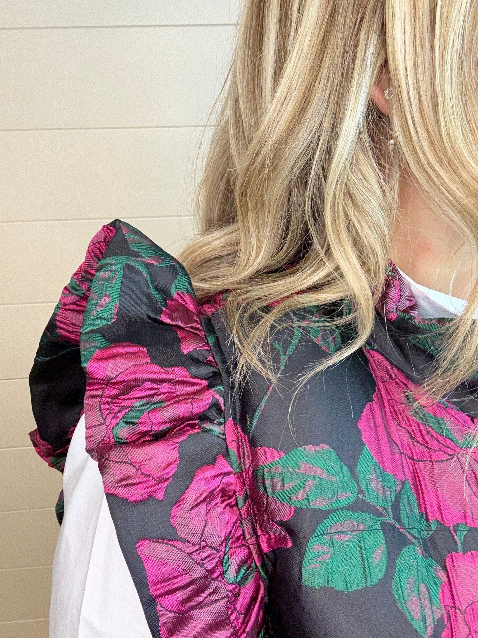 Add a touch of fun flair to your outfit with the Rose Reign Ruffle Vest. Featuring playful ruffled cap sleeves and a charming floral jacquard pattern, this puffy vest zips up the front for easy wear and includes handy pockets to keep essentials close. Perfect for layering, it brings a fresh burst of style and comfort wherever you go!