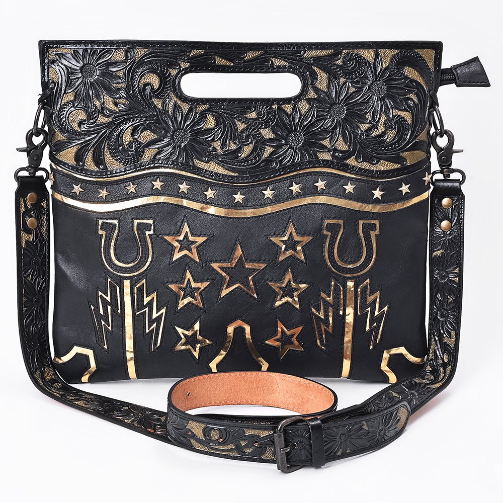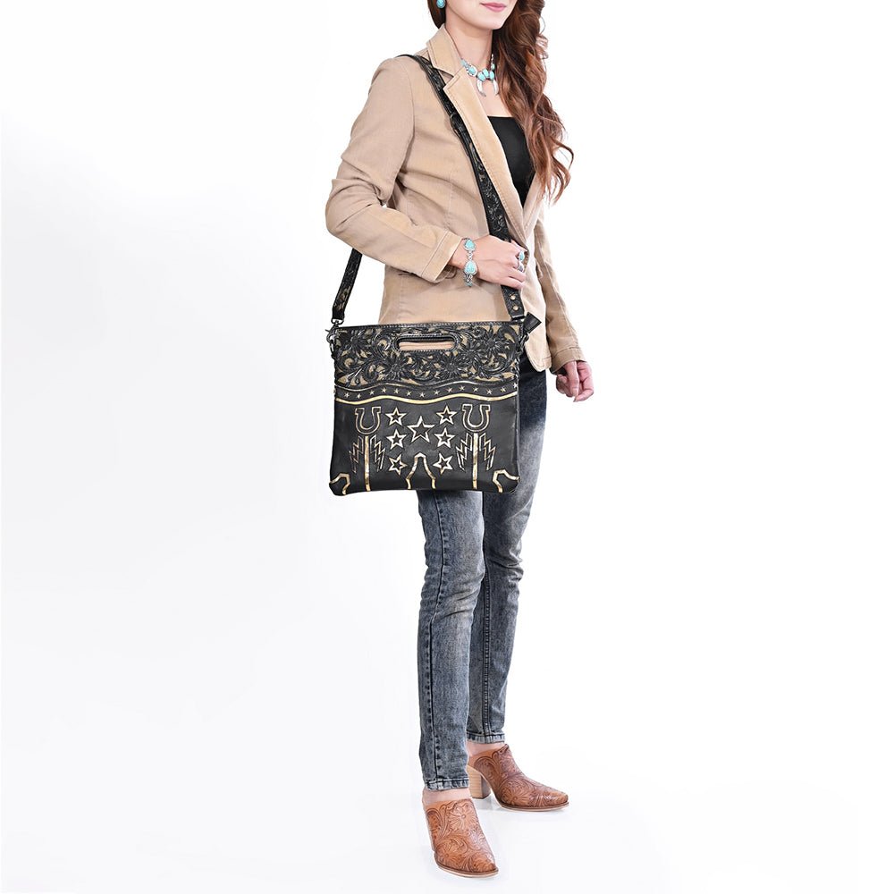 Saddle up in style with this Black Patent Western Tote Bag, featuring a spirited rodeo cowboy and horseshoe embroidered design. Perfect for the free-spirited fashionista who loves a touch of Wild West charm, this sleek tote combines classic western flair with modern sophistication. The glossy patent finish catches the light beautifully, while the embroidered details add personality and texture. Whether you're heading to the rodeo, running errands around town, or making a bold fashion statement, this versatile bag brings playful attitude to any outfit. Spacious enough for all your essentials with that unmistakable cowgirl swagger.