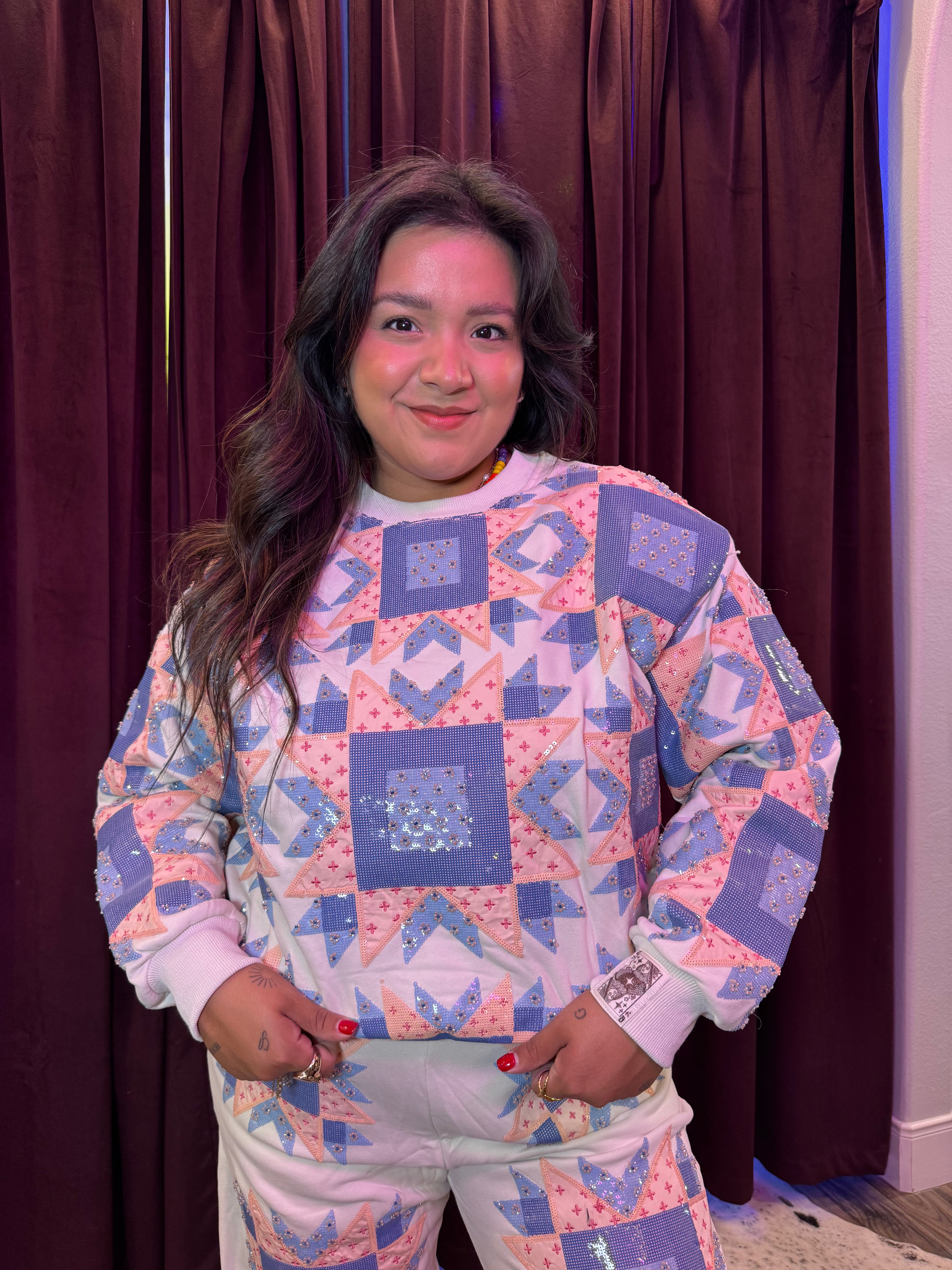This is for sure going to be a sellout! Such a cute pattern and an ultra sweet touch with all of the sequins and rhinestones! It truly is a to-die-for piece! Don’t forget the matching pants!