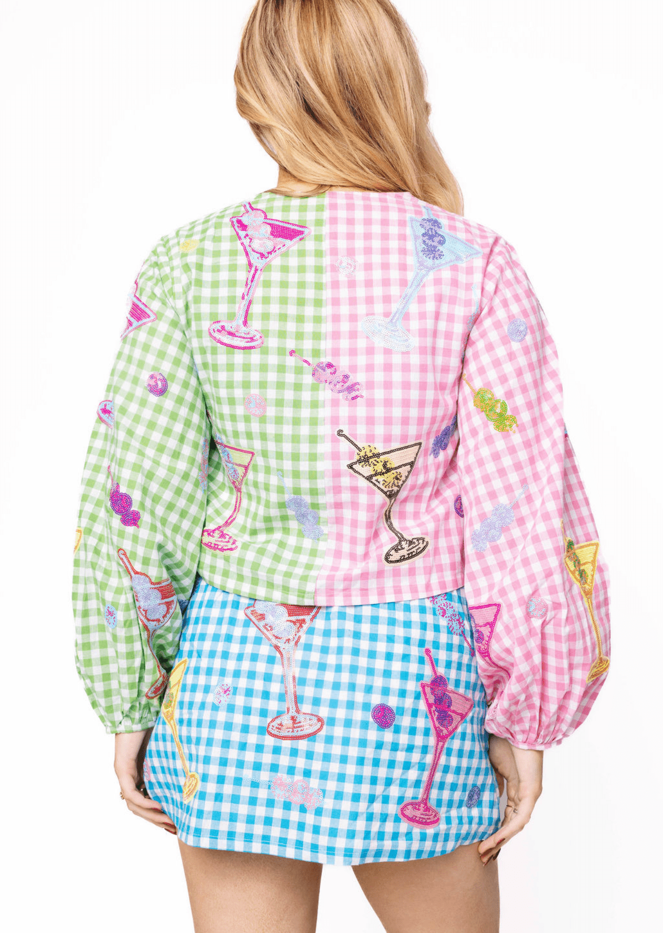 Raise a glass to effortless style with this vibrant Queen of Sparkles top! Featuring a fun multi-colorblock gingham pattern that brings serious personality to your wardrobe, this cotton essential pairs bold color blocking with a flirty tie-up neckline for a playful twist. The breathable cotton fabric keeps you comfortable all day long, while the martini-inspired design adds a touch of sophisticated whimsy. Perfect for brunch dates, casual outings, or whenever you want to sparkle a little brighter.