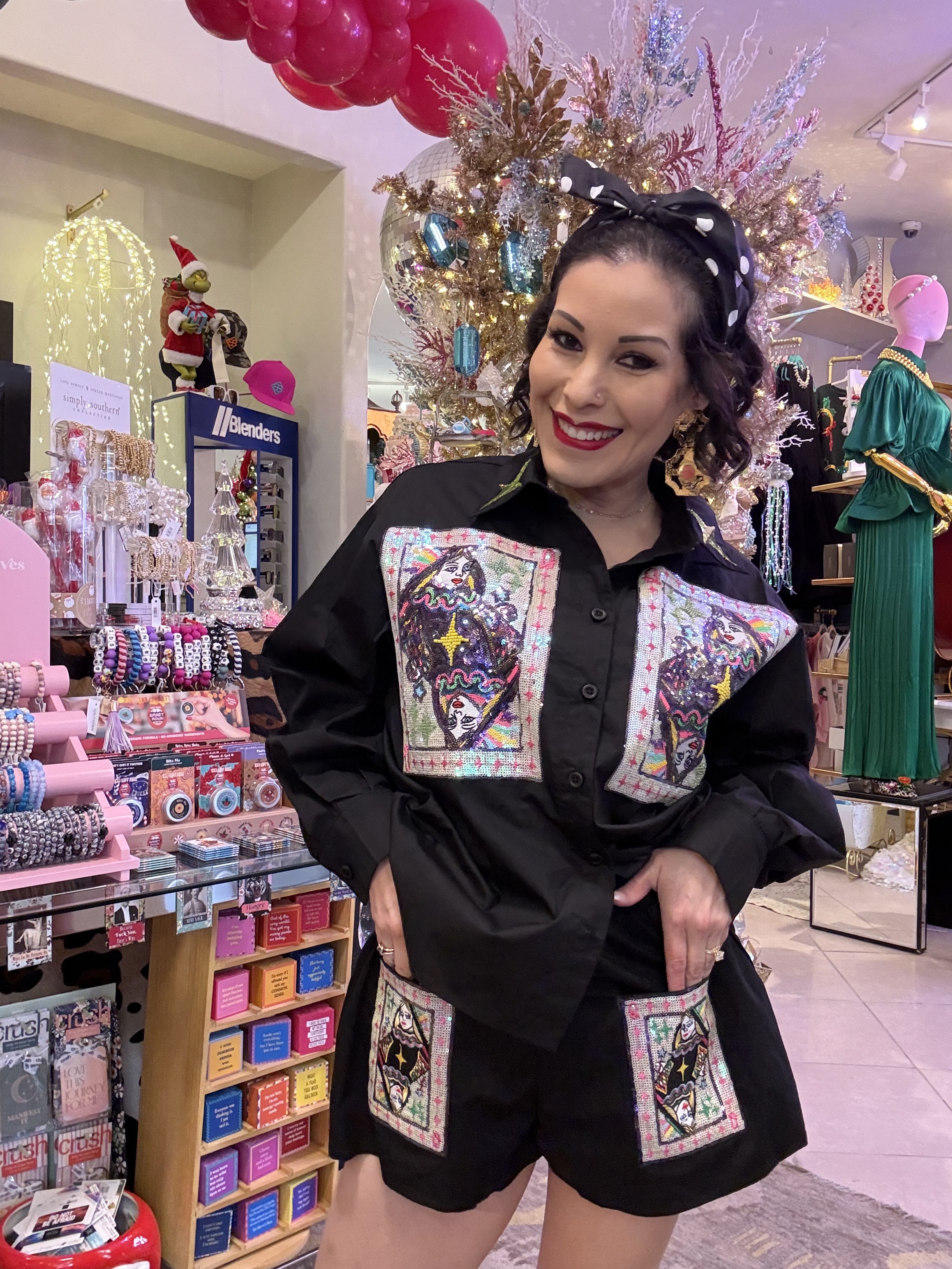 Be the queen of style and comfort with our Queen of Sparkles Black Queen Card Cotton Shorts! Made with soft cotton, these shorts feature a playful twist with a queen of hearts card design. Stay cool and chic in these unique and quirky shorts.  Model is wearing an XS