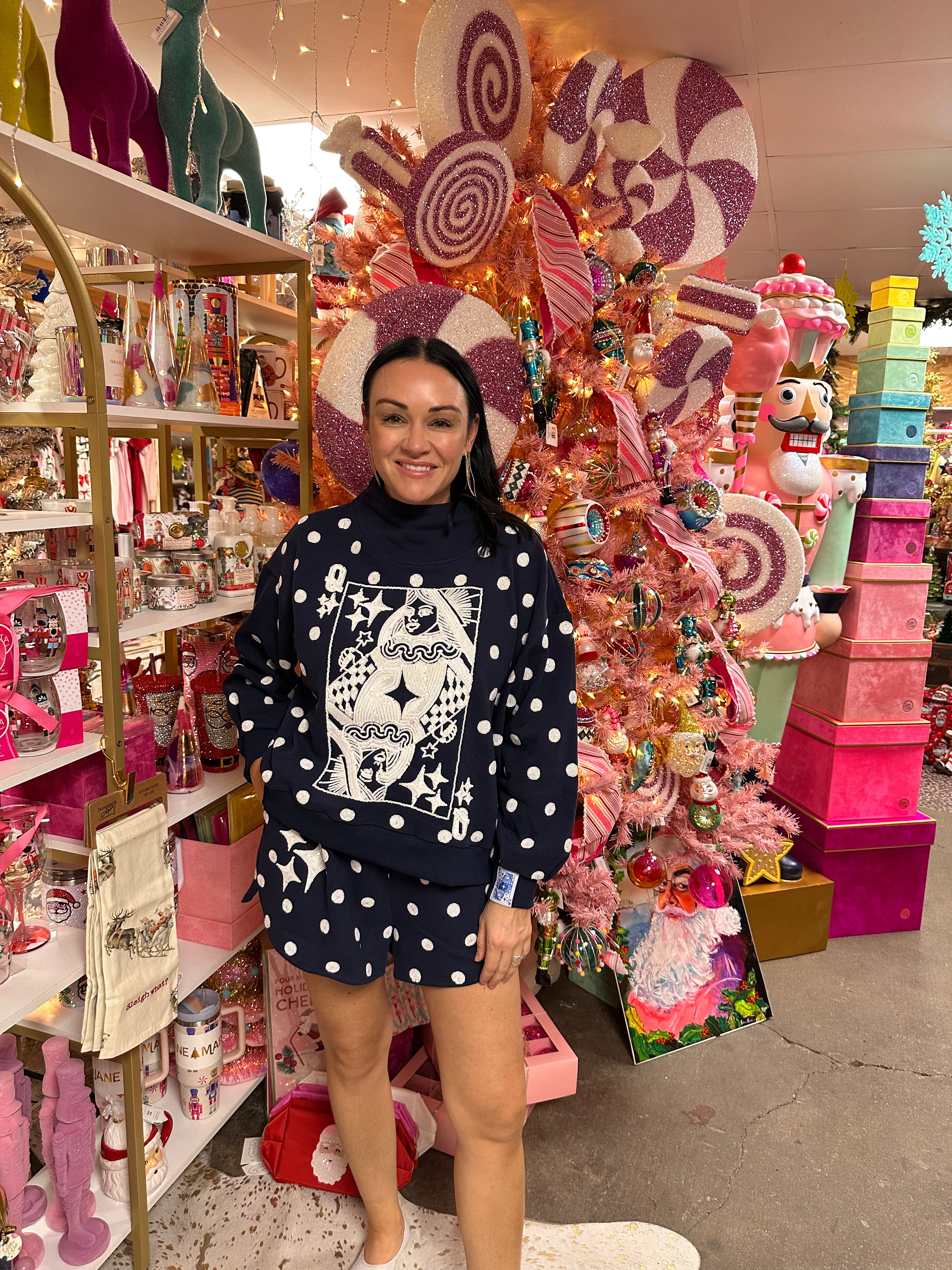 Embrace fun and flair with the Queen of Sparkles Navy Polka Dot Sweatshirt. Featuring a playful sparkle logo set against a classic navy and white polka dot pattern, these sweatshirts add a whimsical touch to any casual look. Perfect for days when you want to shine bright while staying comfortable and cool.