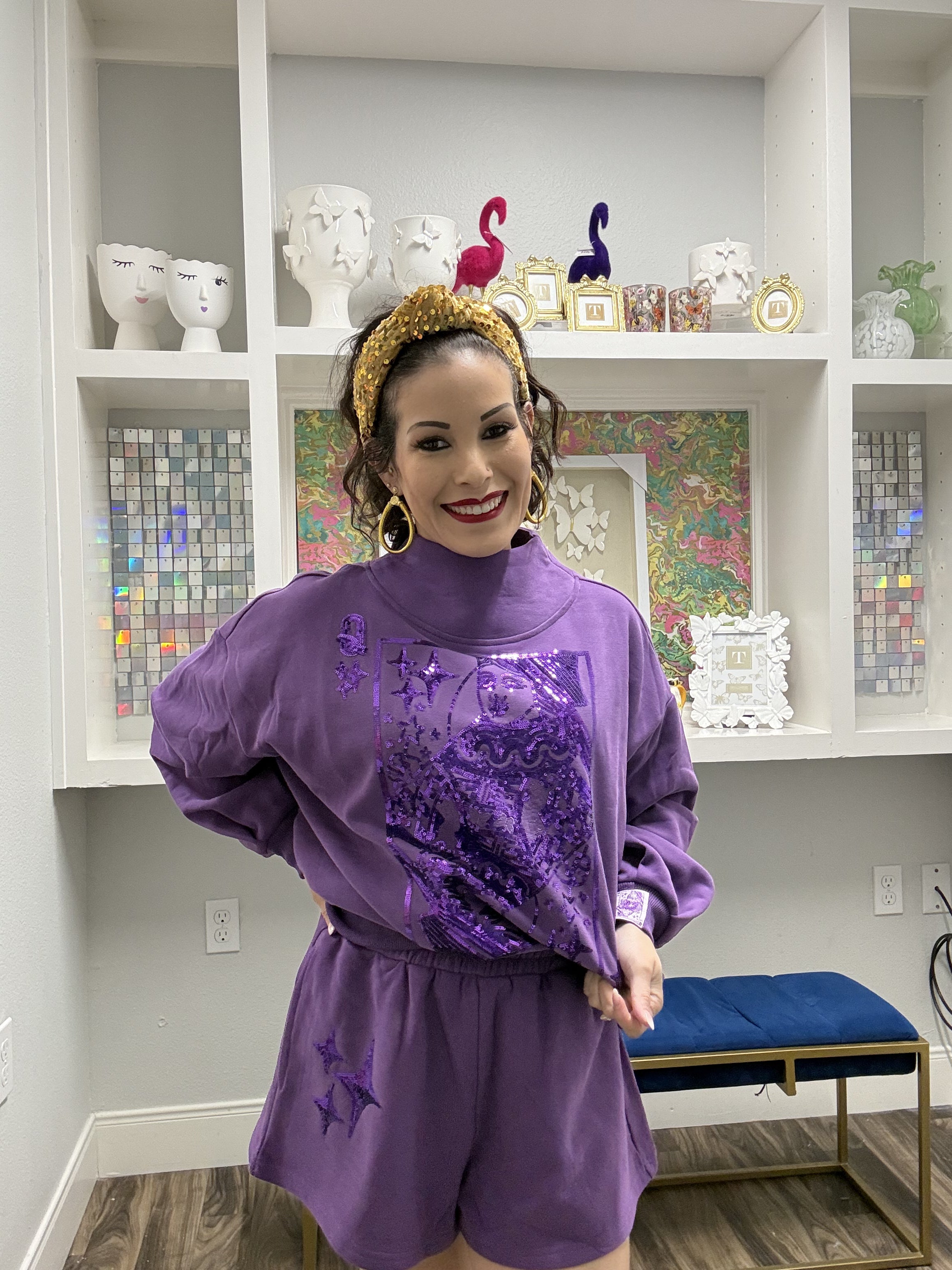 Elevate your sparkle game with this stunning purple mock neck sweatshirt from Queen of Sparkles. Featuring the iconic QOS card logo, this cozy layer brings playful sophistication to your everyday wardrobe. The mock neck design offers a chic, polished look while the soft fabric keeps you comfortable all day long. Perfect for those who love a touch of glamour with their casual style. Whether you're running errands or meeting friends, this sweatshirt is your go-to piece for looking effortlessly fabulous. Model is wearing an XS