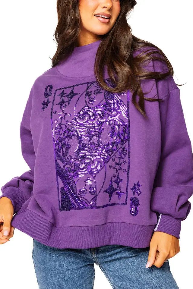 Elevate your sparkle game with this stunning purple mock neck sweatshirt from Queen of Sparkles. Featuring the iconic QOS card logo, this cozy layer brings playful sophistication to your everyday wardrobe. The mock neck design offers a chic, polished look while the soft fabric keeps you comfortable all day long. Perfect for those who love a touch of glamour with their casual style. Whether you're running errands or meeting friends, this sweatshirt is your go-to piece for looking effortlessly fabulous.