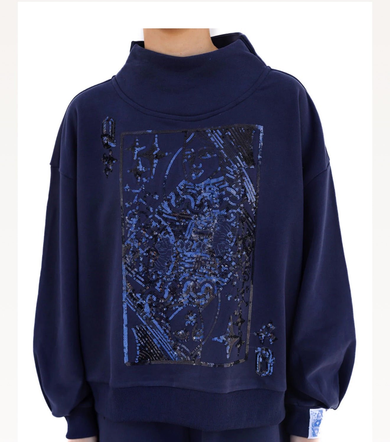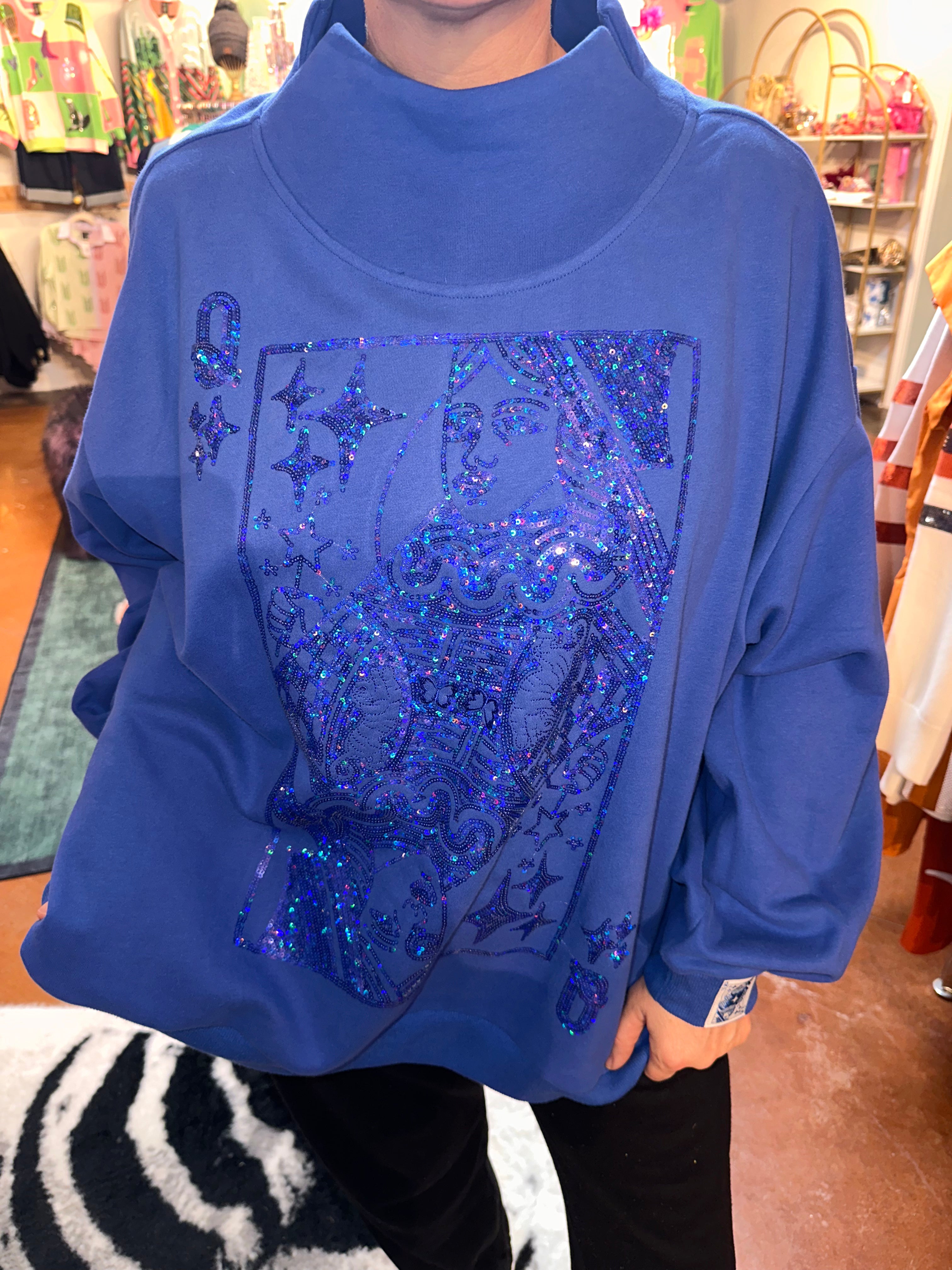 Elevate your sparkle game with this regal mock neck sweatshirt from Queen of Sparkles. Featuring the iconic QOS card logo, this cozy layer brings luxury vibes and playful attitude to your everyday wardrobe. The mock neck design offers a chic, polished look while the soft fabric keeps you comfortable all day long. Perfect for anyone who loves to shine with confidence and style. Make a statement—because royalty never goes unnoticed.