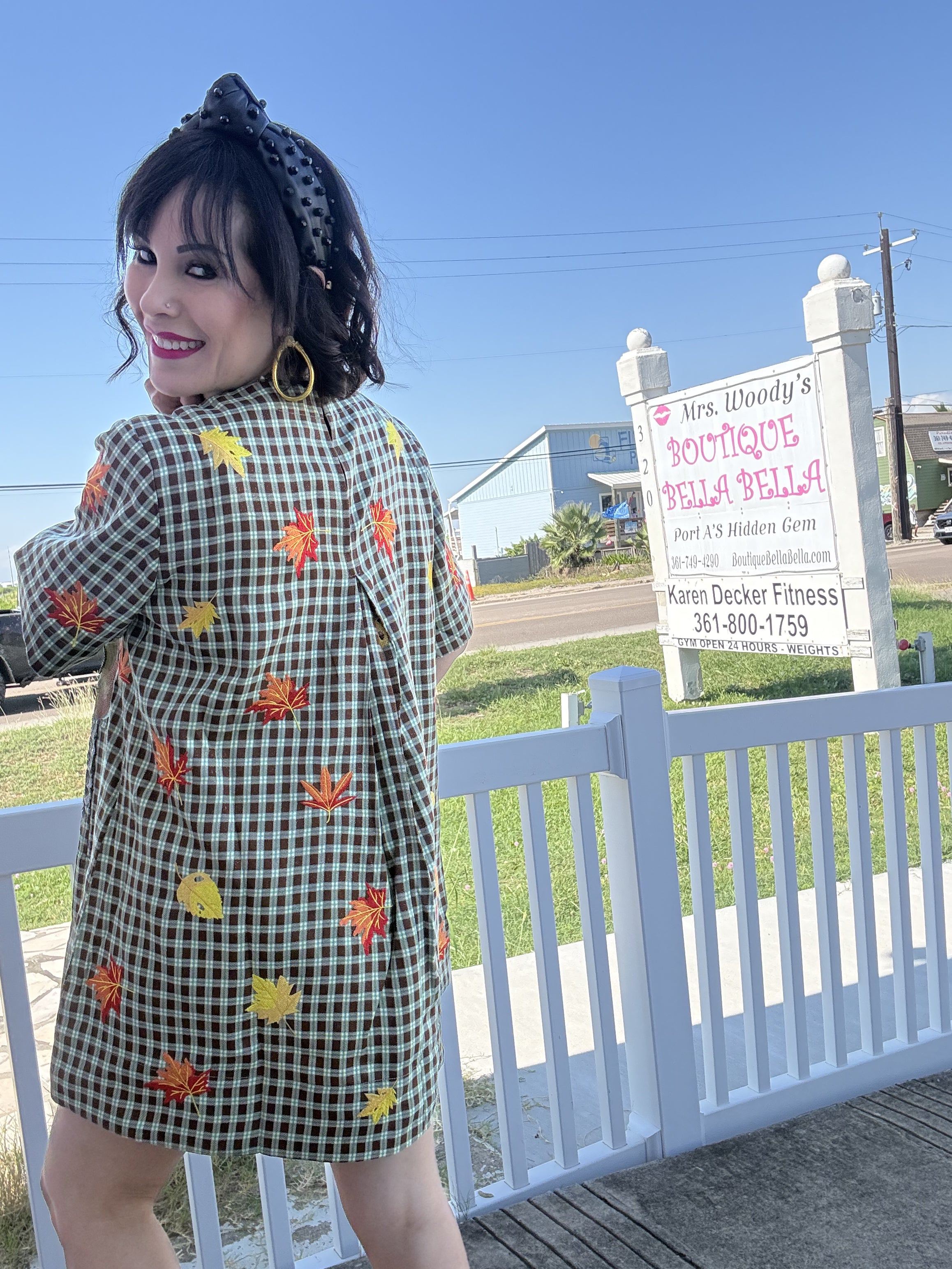 Celebrate autumn in style with the Queen of Sparkles Brown Plaid Short Dress. Featuring a fun turkey and leaves pattern, this playful dress adds a festive touch to your fall wardrobe. Its comfortable fit and charming design make it perfect for cozy gatherings or lively holiday parties. Embrace the season with a spark of whimsy and warmth! Model is wearing an XS