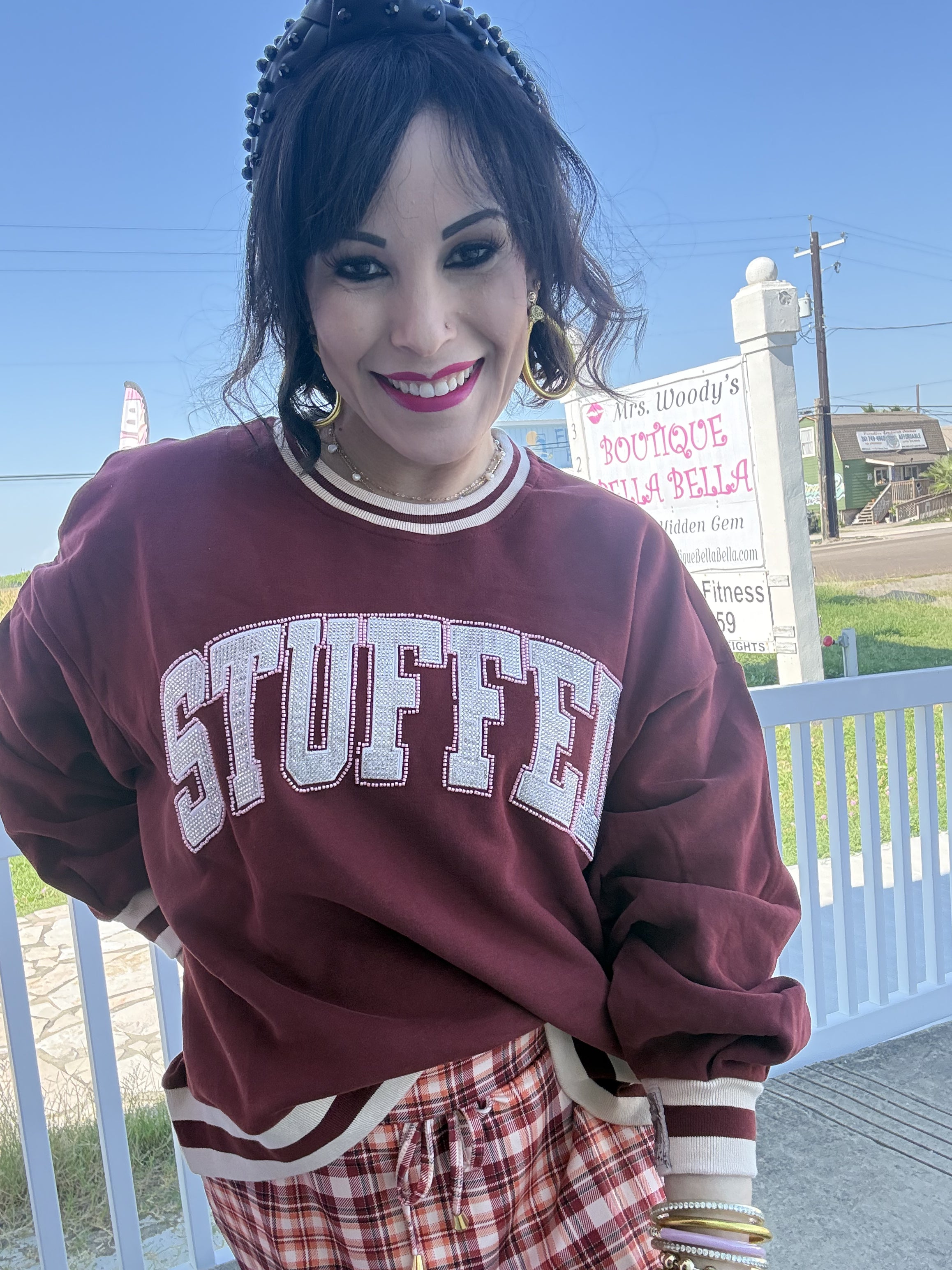 Add a dazzling twist to your cozy days with the Queen of Sparkles Marron & Ivory Rhinestone 'Stuffed' Sweatshirt. This playful sweatshirt combines comfy softness with eye-catching rhinestone details that sparkle with every move. Perfect for those who want to shine while staying snug, it’s a fun way to brighten up any casual outfit. Model is wearing an XS