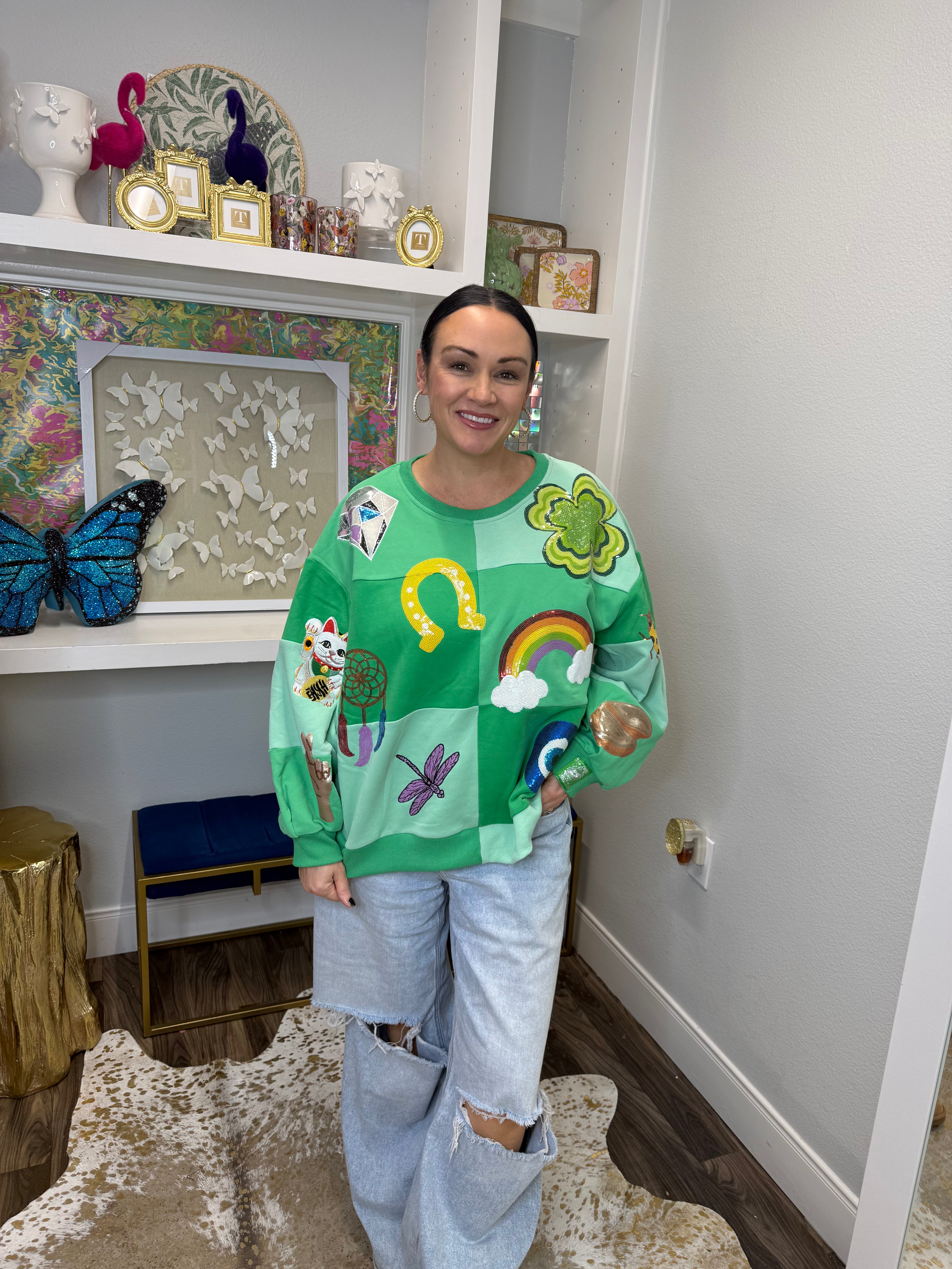 Embrace your lucky side with this vibrant green checkered sweatshirt from Queen of Sparkles. Featuring an eye-catching lucky icon design, this cozy pullover combines retro charm with modern sparkle. Perfect for casual days when you want to spread good vibes and feel fabulous. The soft, comfortable fit makes it ideal for layering or wearing solo. Whether you're heading out for coffee or a night with friends, this sweatshirt brings personality and positivity to any outfit. Your new favorite lucky charm just got wearable.