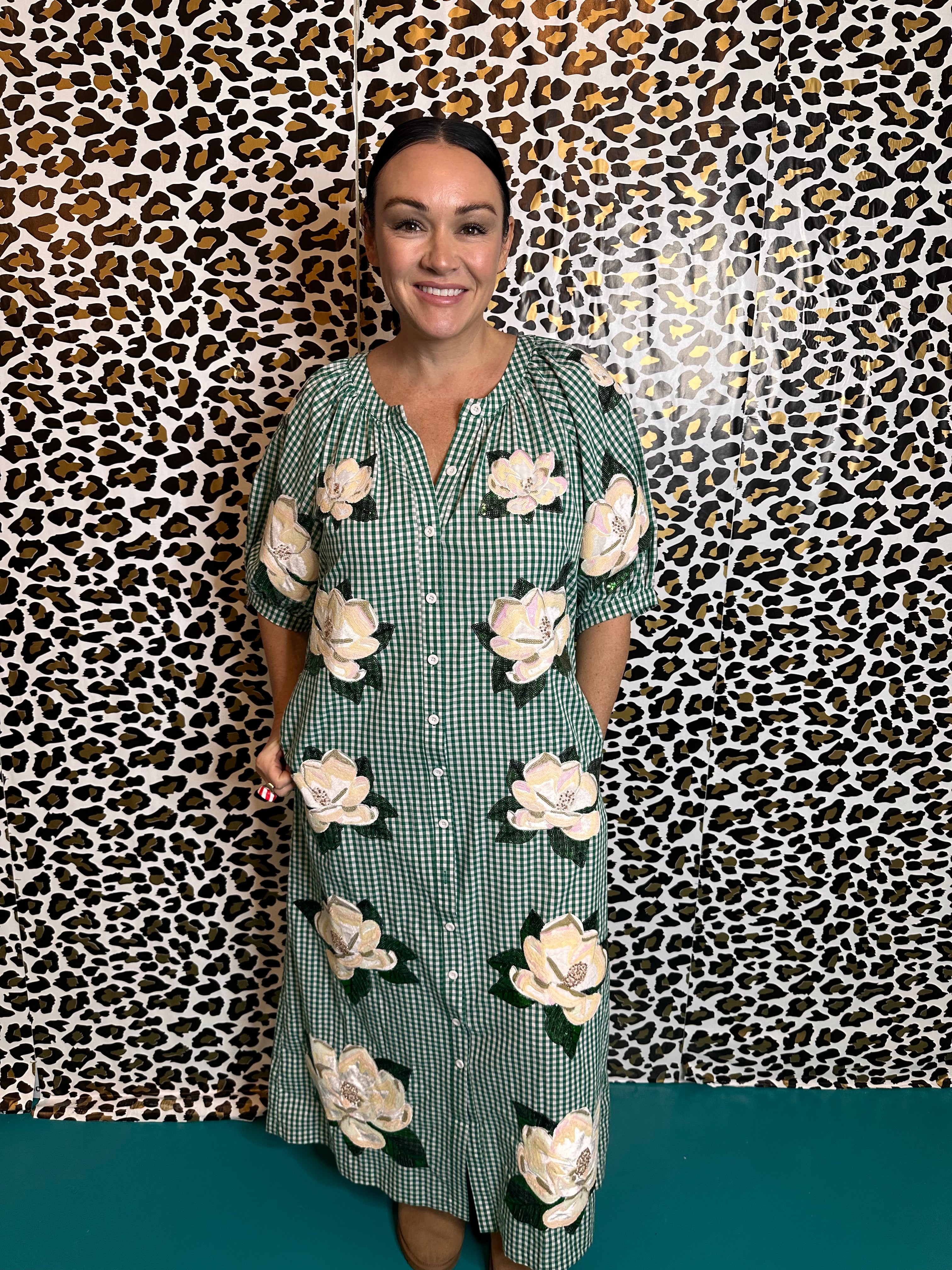Twirl into spring in this charming gingham midi dress! Featuring a classic green and white checked pattern with delicate magnolia button details, this cotton beauty strikes the perfect balance between sweet and sophisticated. The button-up front adds vintage-inspired flair, while the midi length keeps things elegant and versatile. Dress it up with heels for a garden party or down with sneakers for weekend adventures. Pure joy in every stitch!