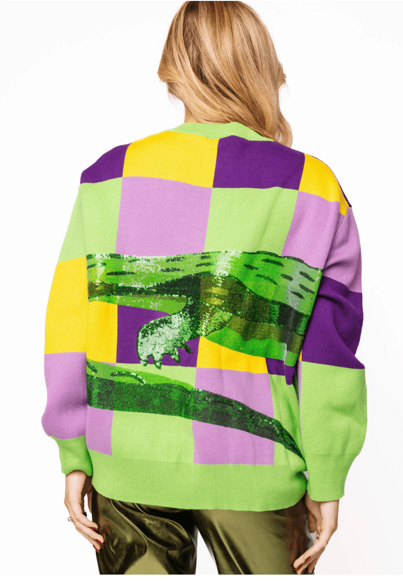 Queen of Sparkles Mardi Gras Checkered Alligator Queen Sweater