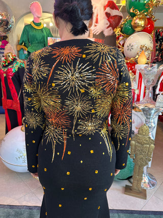 Queen of Sparkles QOS Black, Gold & Rose Gold Firework Jeweled Midi Sweater Dress