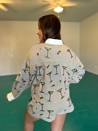 Queen of Sparkles Gold Stripe Multi Sparkler Button Up Top with Pink Feather Sleeves