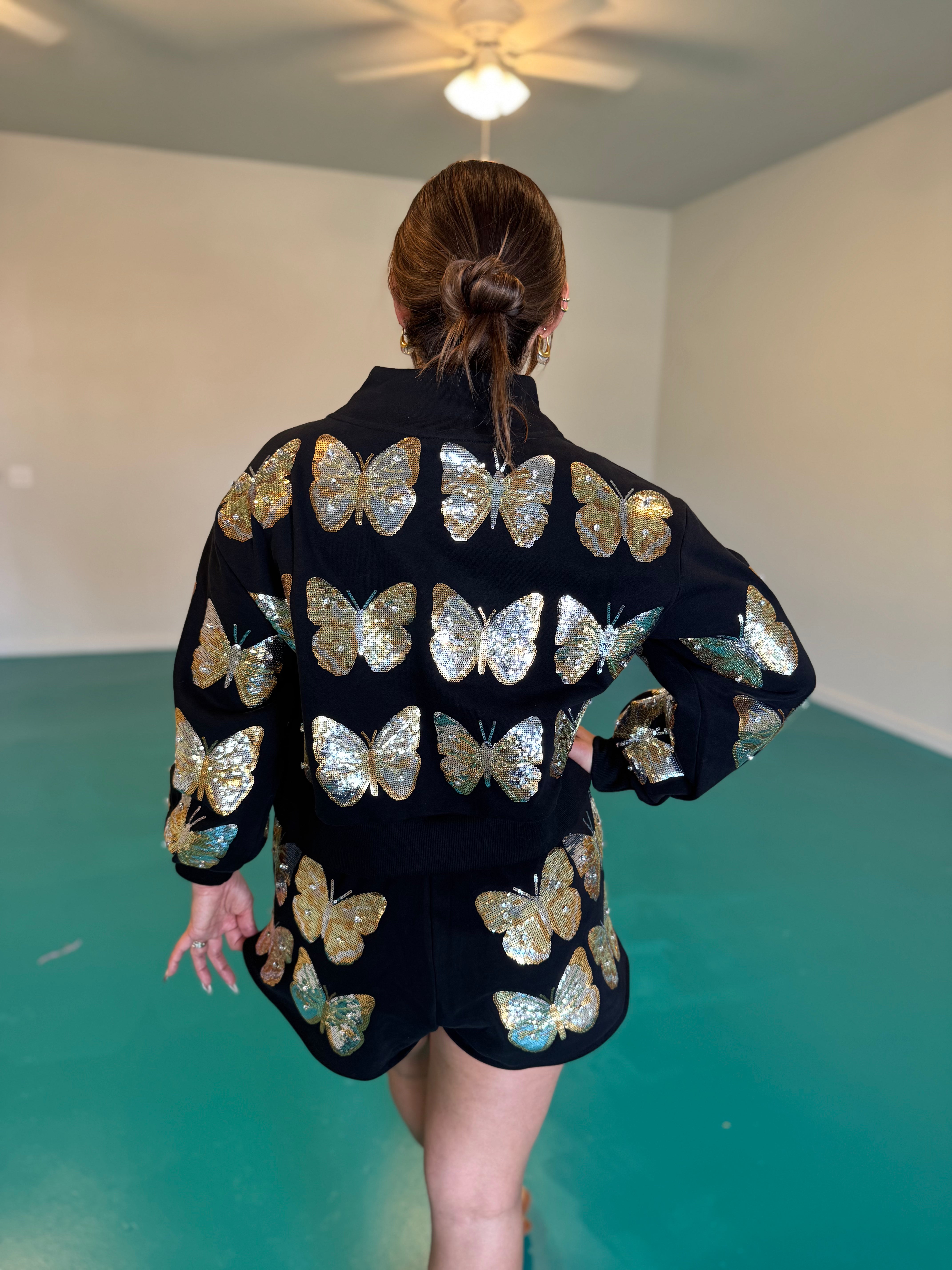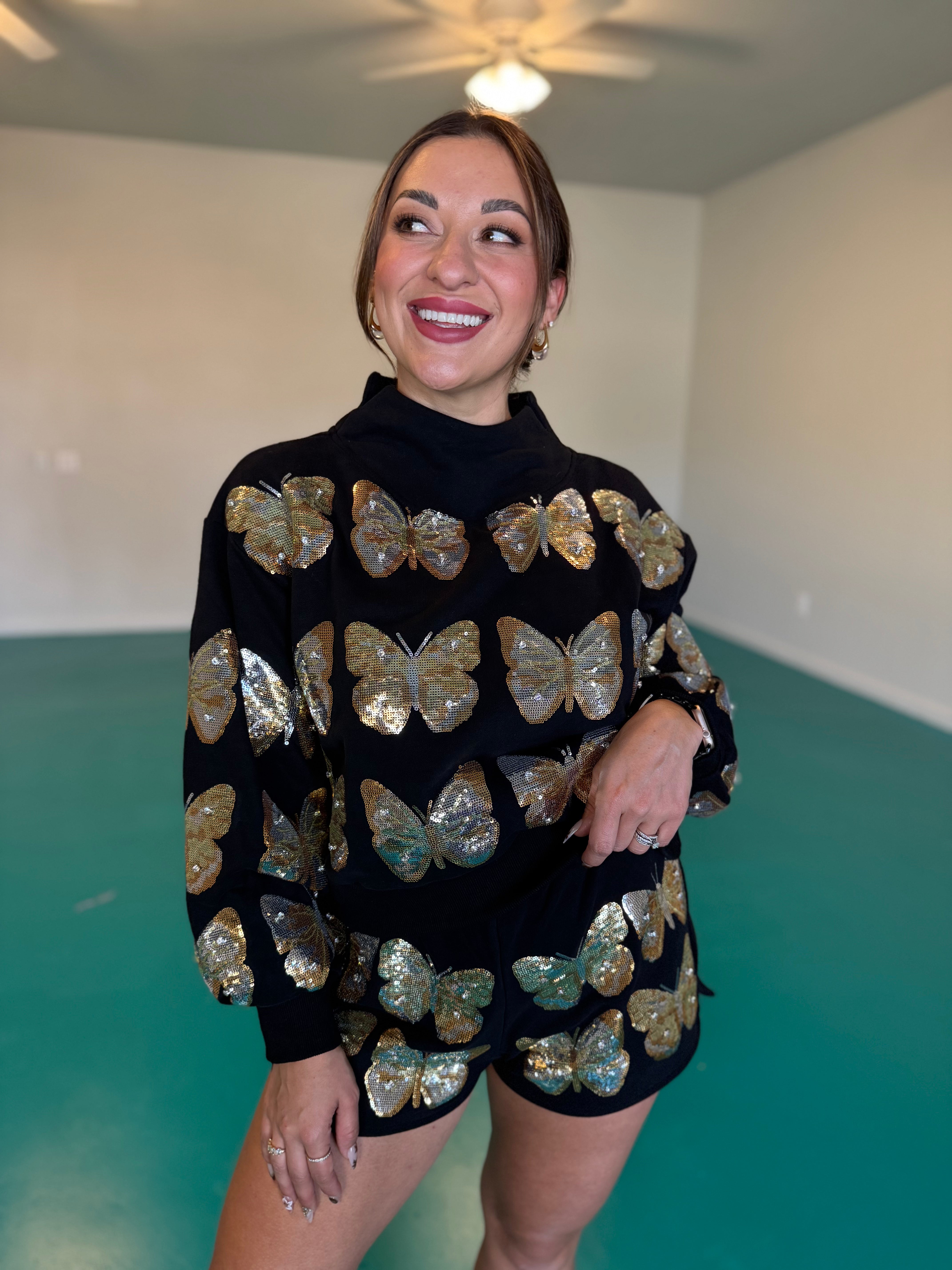 Spread your wings and shine bright in these show-stopping black and gold sequin butterfly shorts! Covered in shimmering sequins that catch the light with every move, these shorts feature an enchanting butterfly design that's pure magic. Perfect for making a bold statement at parties, festivals, or whenever you want to feel like the main character. The playful sparkle and eye-catching colors ensure you'll turn heads wherever you go. Embrace your inner diva and let your style flutter free!