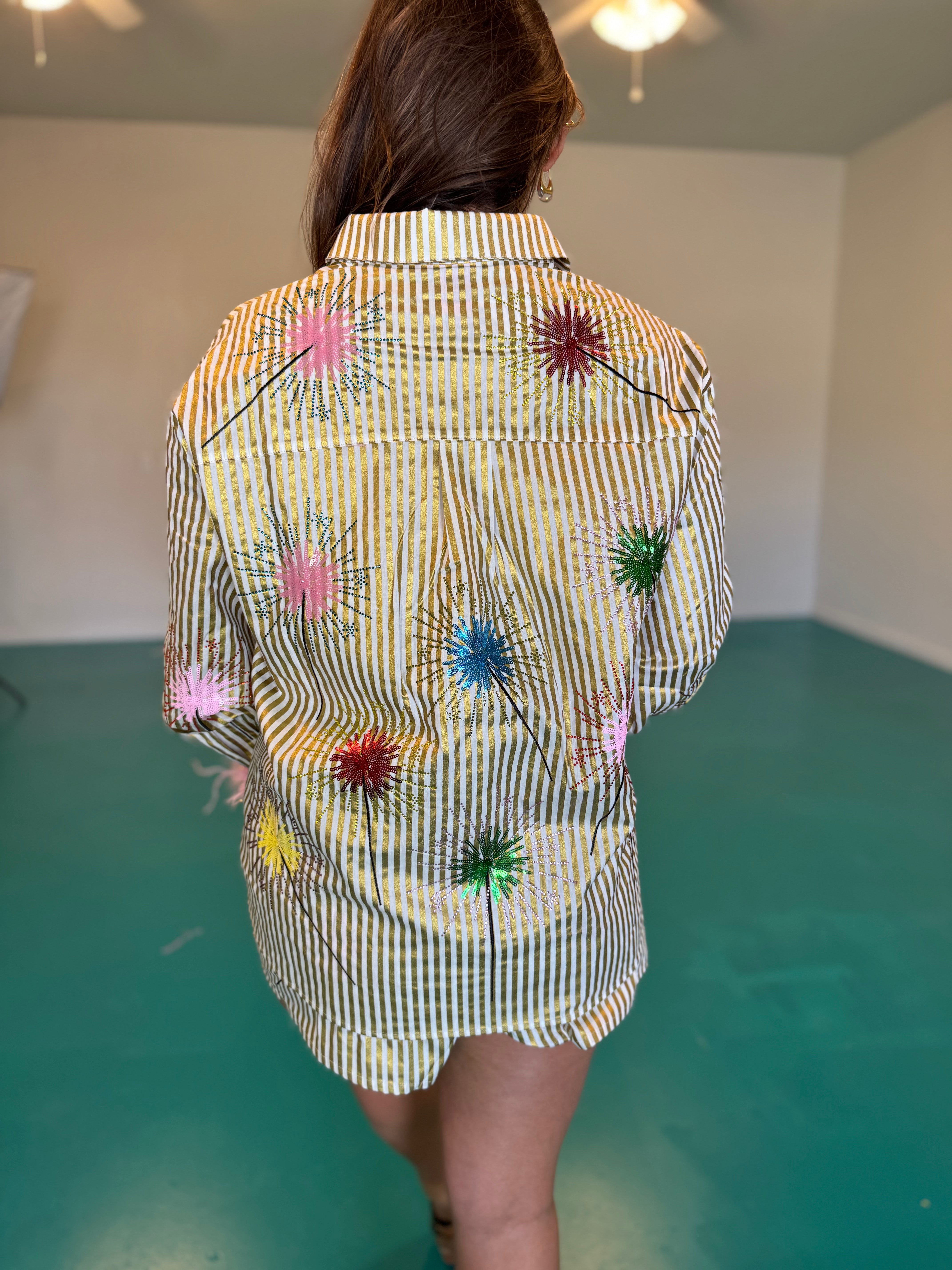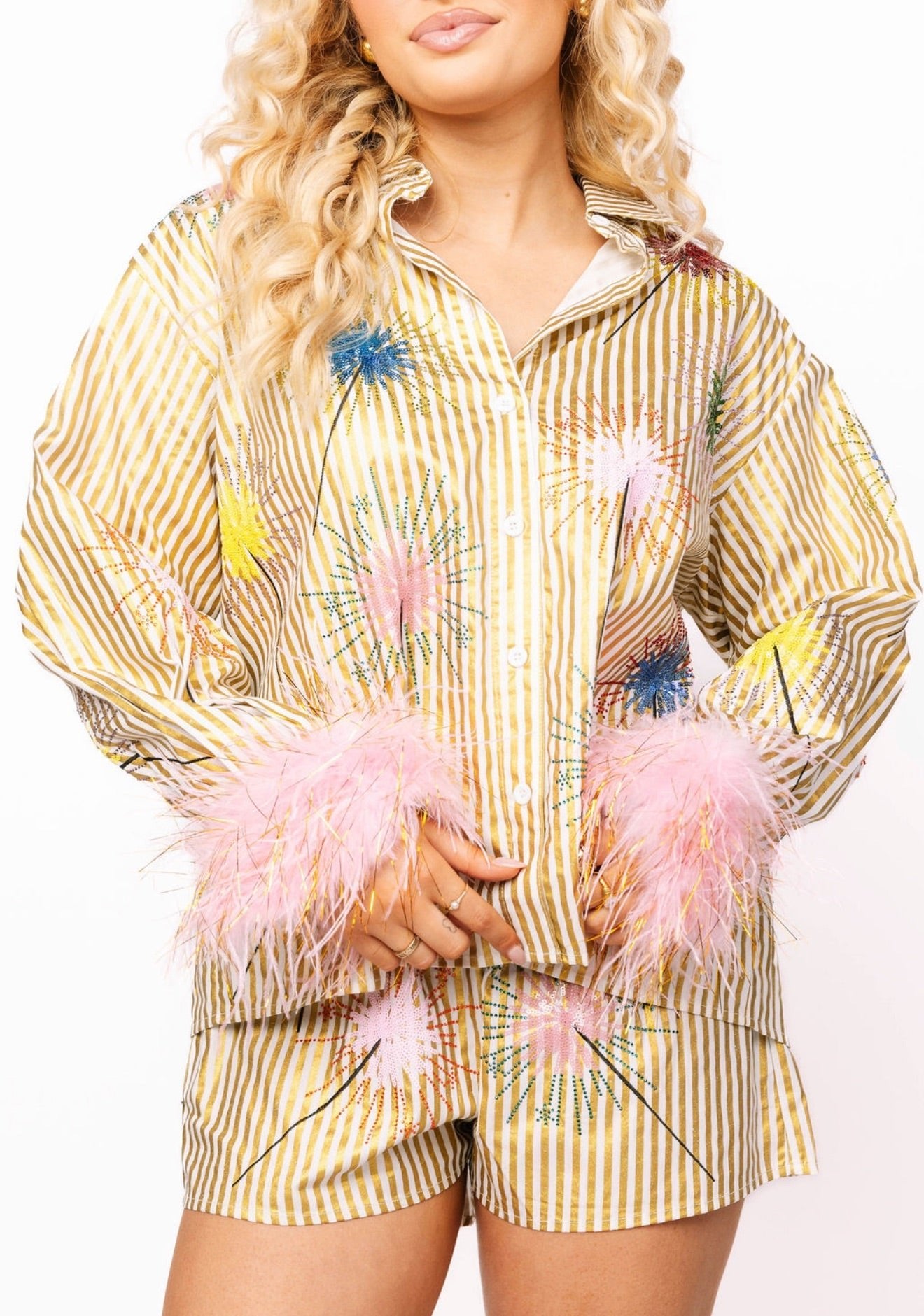 Make a statement in this show-stopping button-up top that blends glamour with whimsy. Featuring bold gold stripes paired with multi-colored sparklers across the front, this piece delivers maximum sparkle for those who love to shine. The pièce de résistance? Luxurious pink feather sleeves that add movement and drama to every gesture. Perfect for nights out, special events, or whenever you want to turn heads and feel absolutely fabulous. Dress it up or down—this top is your ticket to standing out in style.