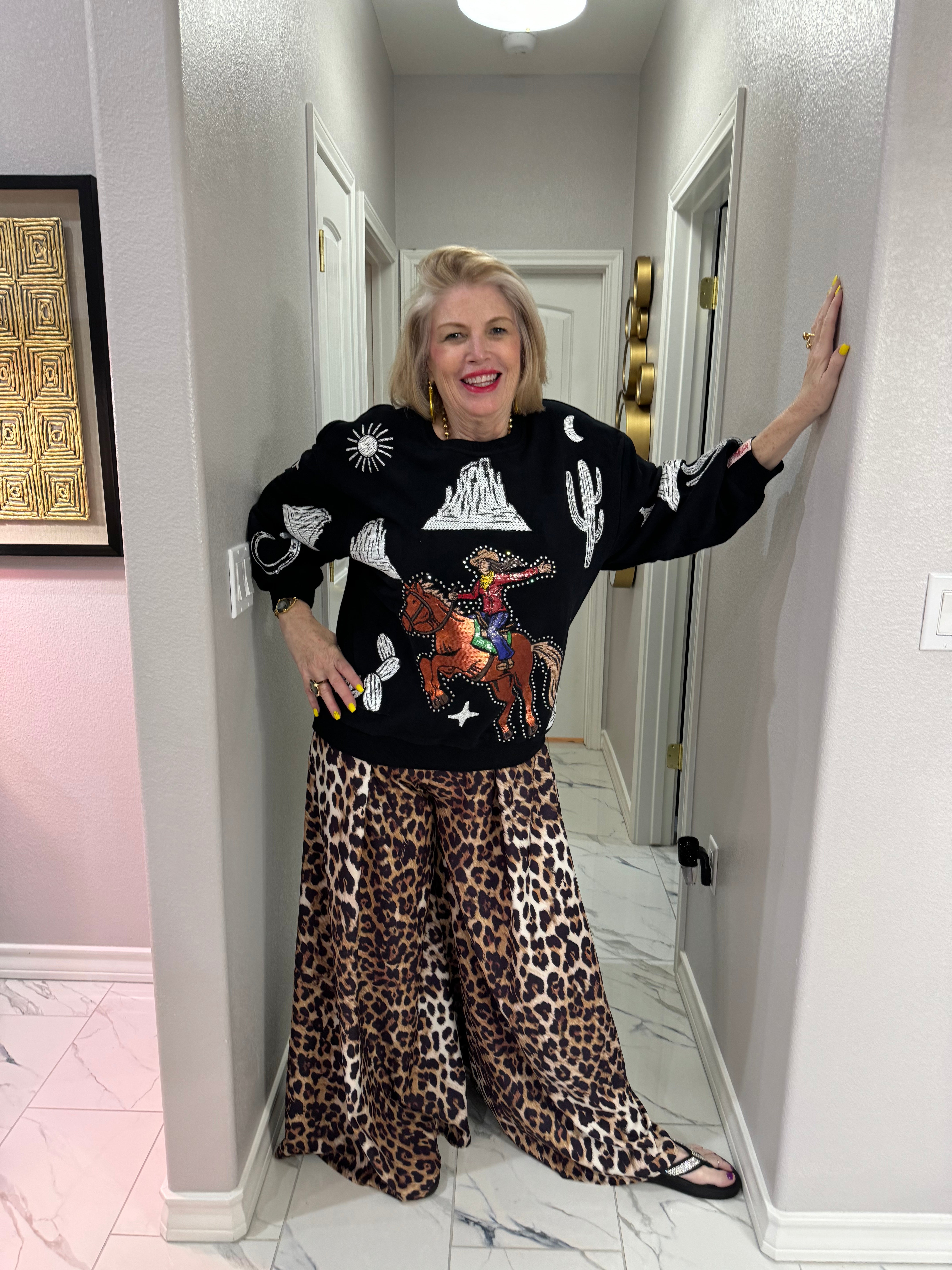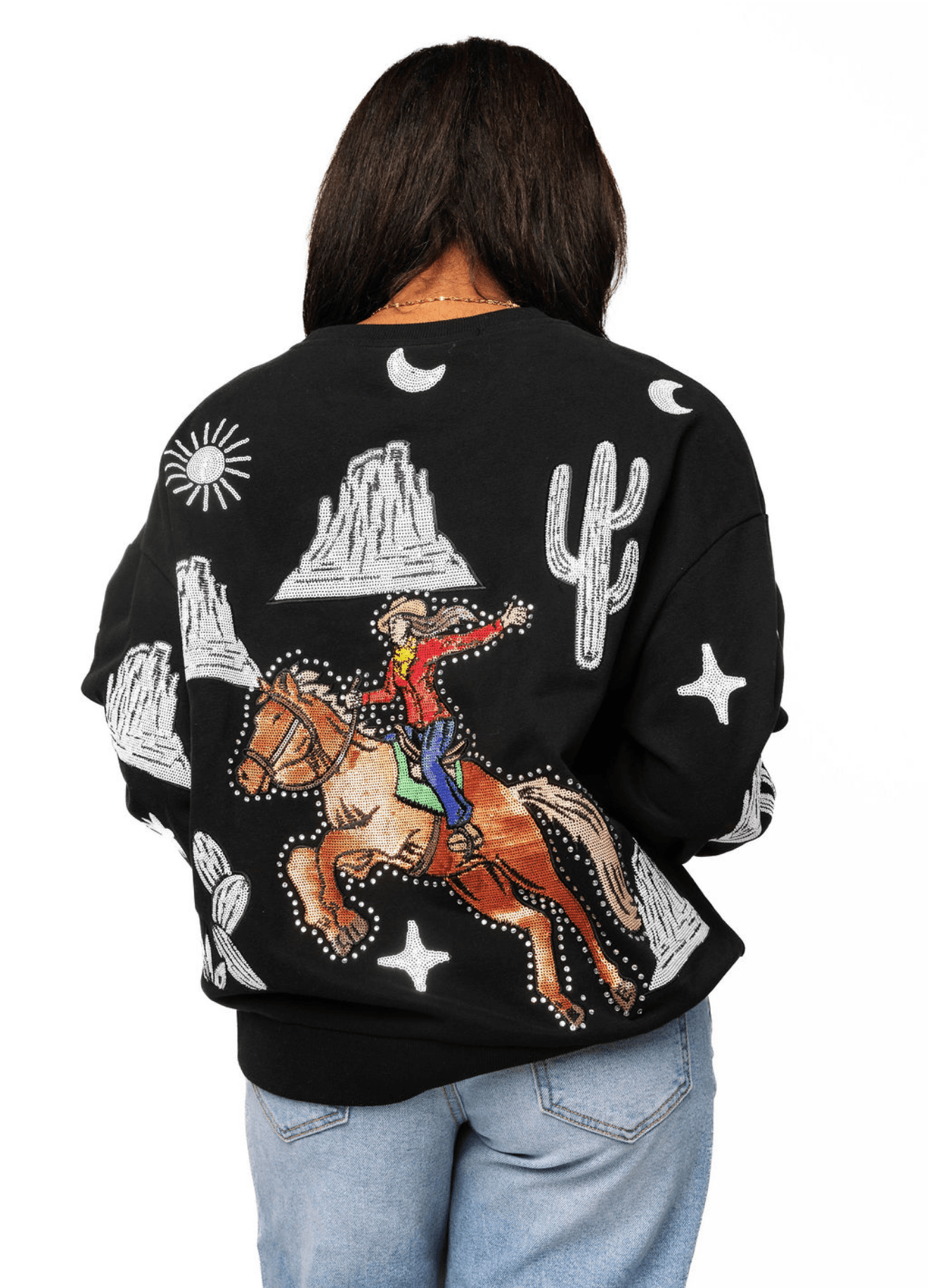 The QOS Black & White Multi Bucking Cowgirl Sweatshirt offers a blend of style and comfort. Constructed with durable materials, it ensures warmth and longevity. The distinct bucking cowgirl design not only enhances visual appeal but also showcases a Western aesthetic, appealing to enthusiasts and casual wearers alike.