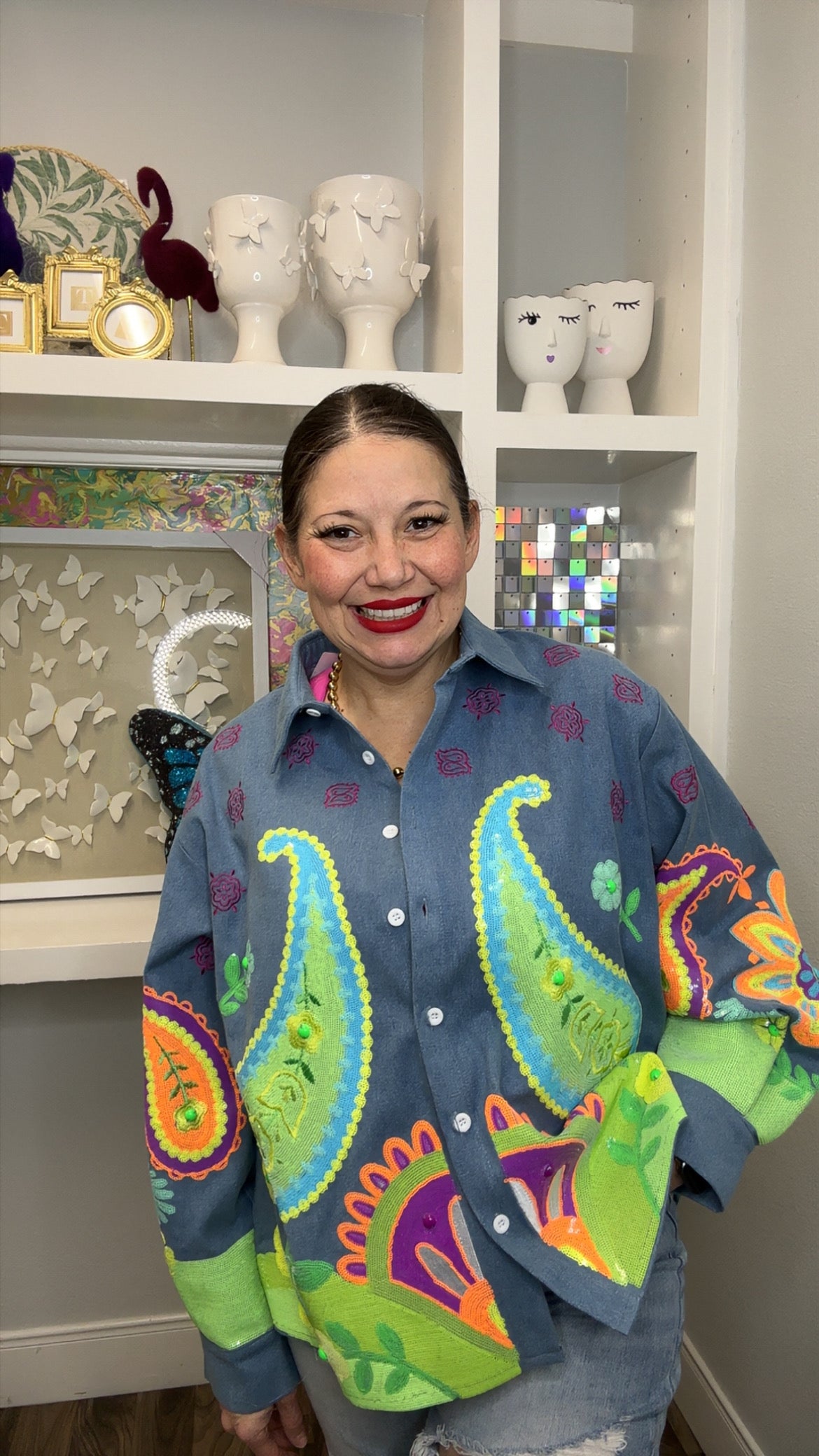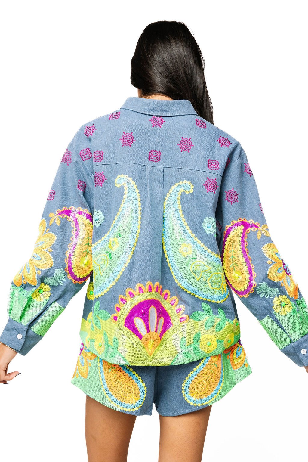 Make a statement with this QOS button-up that blends classic denim with eye-catching neon paisley flair. The crisp denim base keeps things grounded while the vibrant paisley print adds personality and pop. Perfect for layering or wearing solo, this piece transitions effortlessly from casual hangouts to weekend adventures. Comfortable, versatile, and undeniably fun—your wardrobe just got a whole lot more interesting. Model is wearing a small