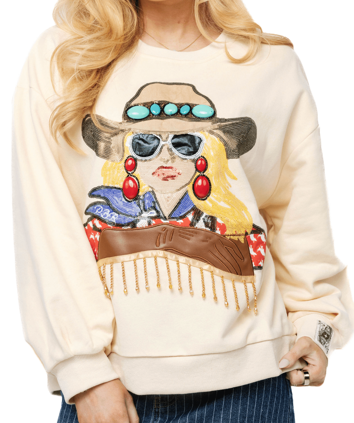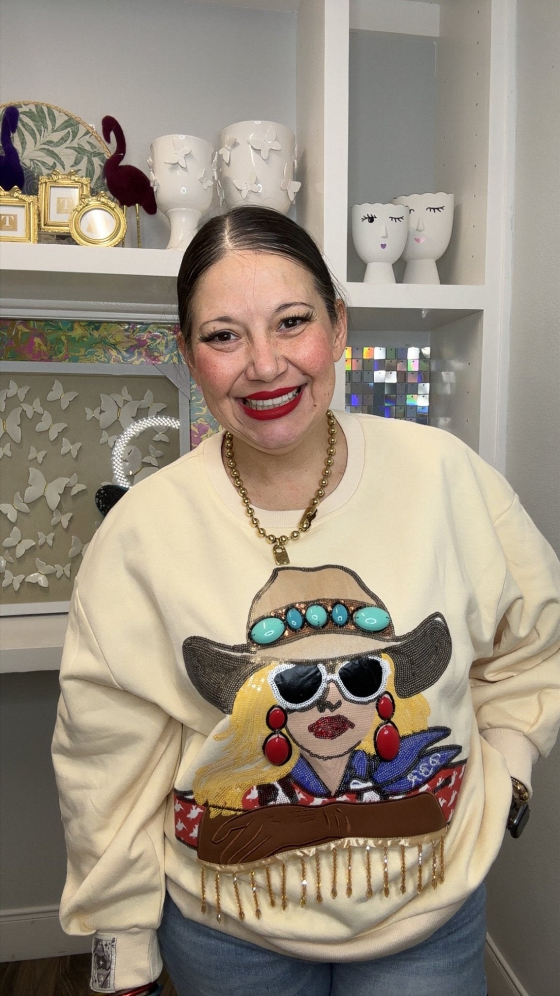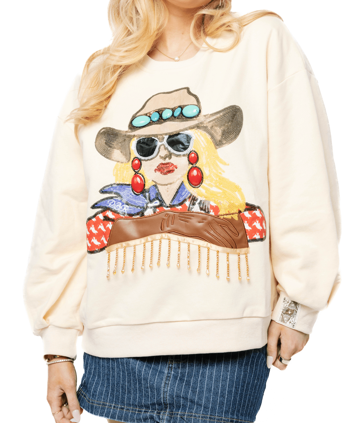 Rock your rodeo roots in this officially licensed cream sweatshirt that celebrates Professional Bull Riders in true cowgirl fashion. Long sleeves keep you cozy while the striking bull graphic on the sleeve makes a bold statement about your Western passion. Designed for those who live and breathe the thrill of the arena, this playful piece blends comfort with authentic PBR heritage. Whether you're a seasoned fan or just love the cowgirl lifestyle, this sweatshirt lets your rodeo spirit shine with style and attitude. Model is wearing an XS