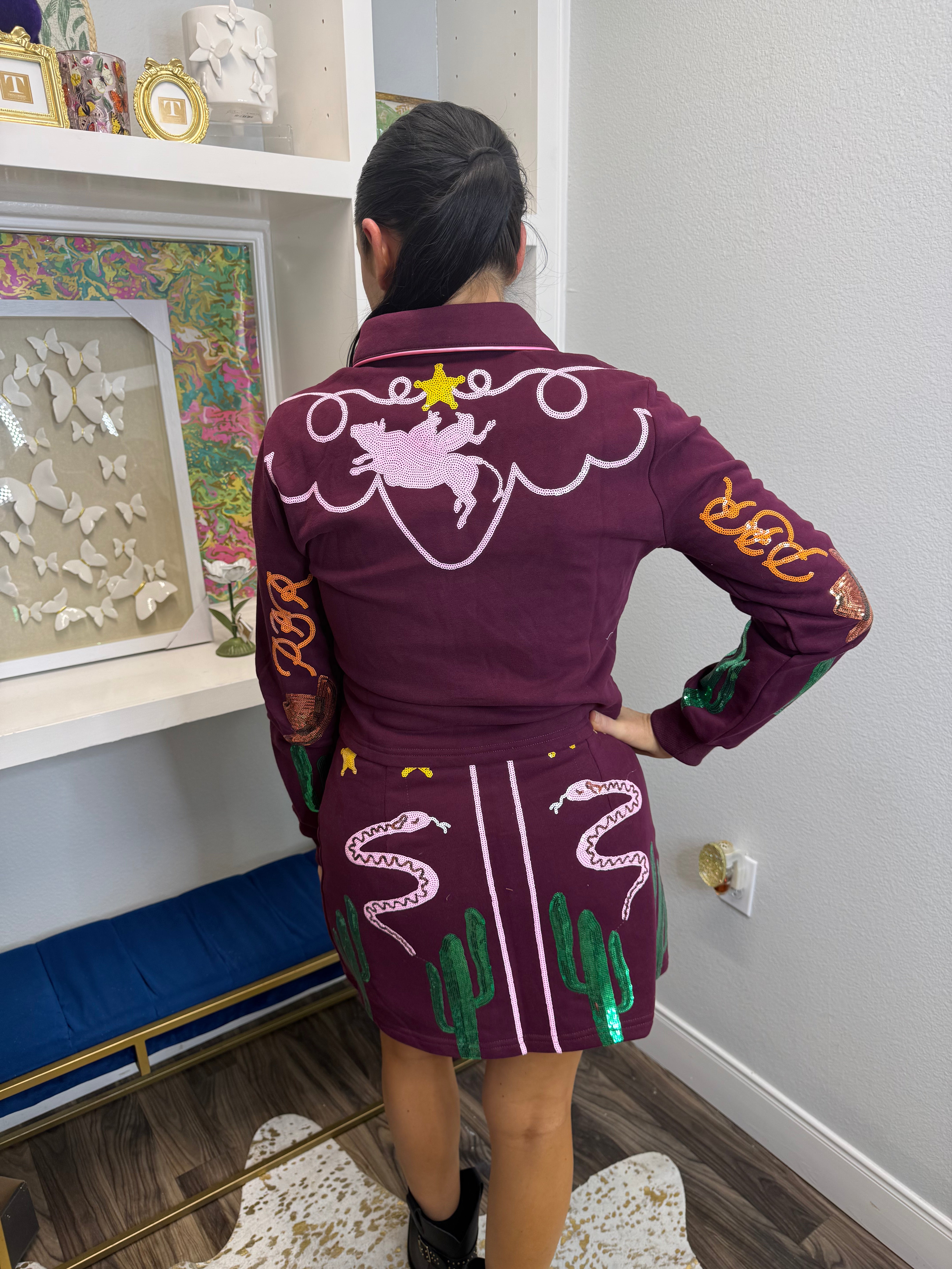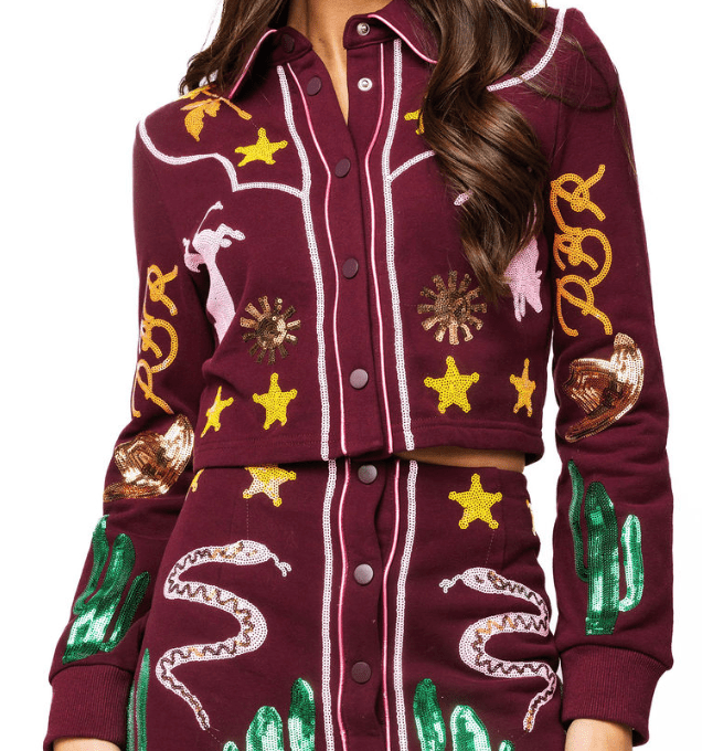 Saddle up in style with this officially licensed Maroon PBR Icon Skirt! Featuring the iconic Professional Bull Riders logo, this playful piece celebrates rodeo culture with serious flair. The rich maroon hue pairs perfectly with your favorite boots and belt, making it ideal for game day, country concerts, or showing your PBR pride wherever you roam. Whether you're a die-hard fan or just love the western aesthetic, this skirt brings authentic rodeo spirit to your wardrobe. Giddy up and make a statement!
