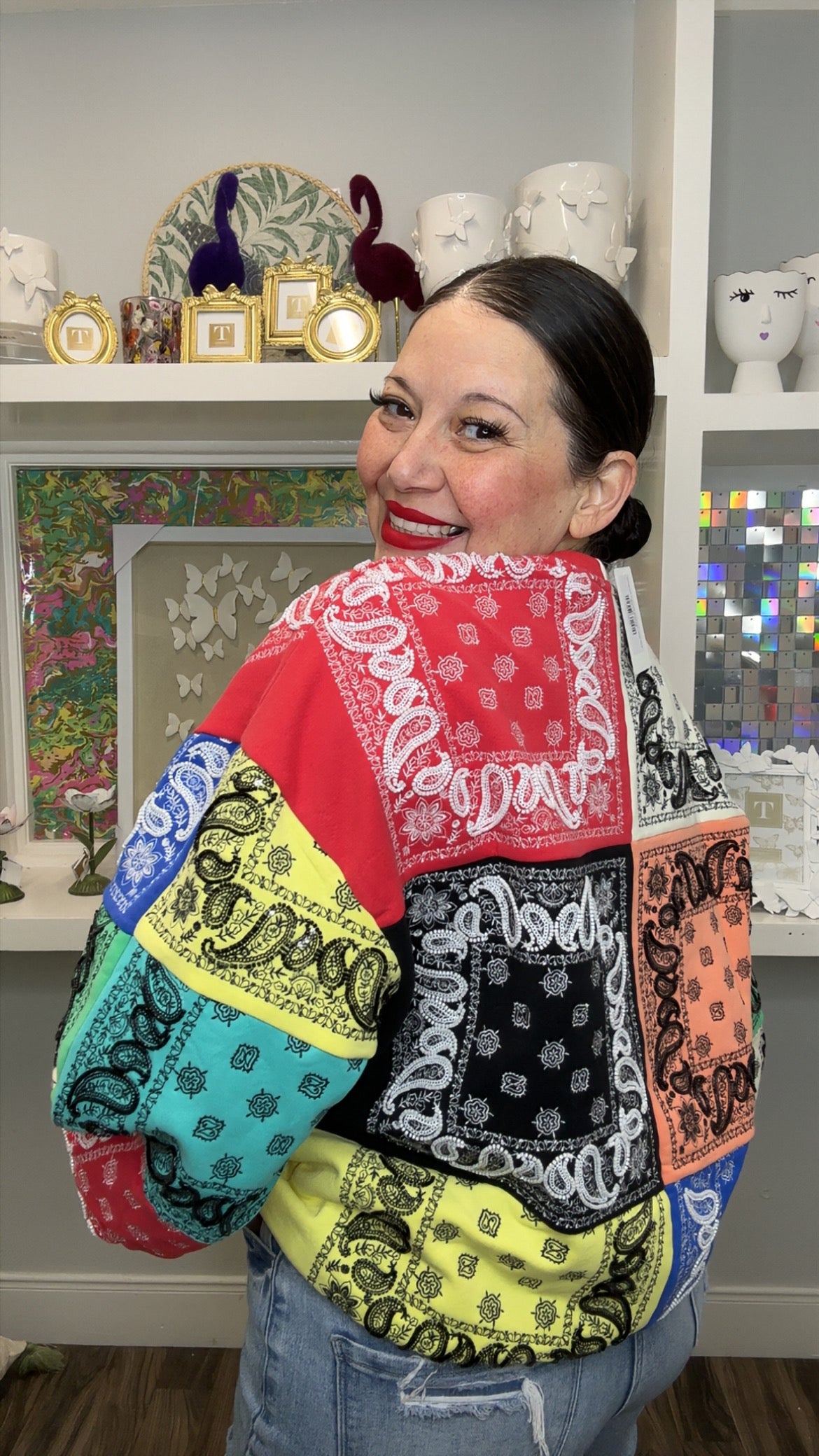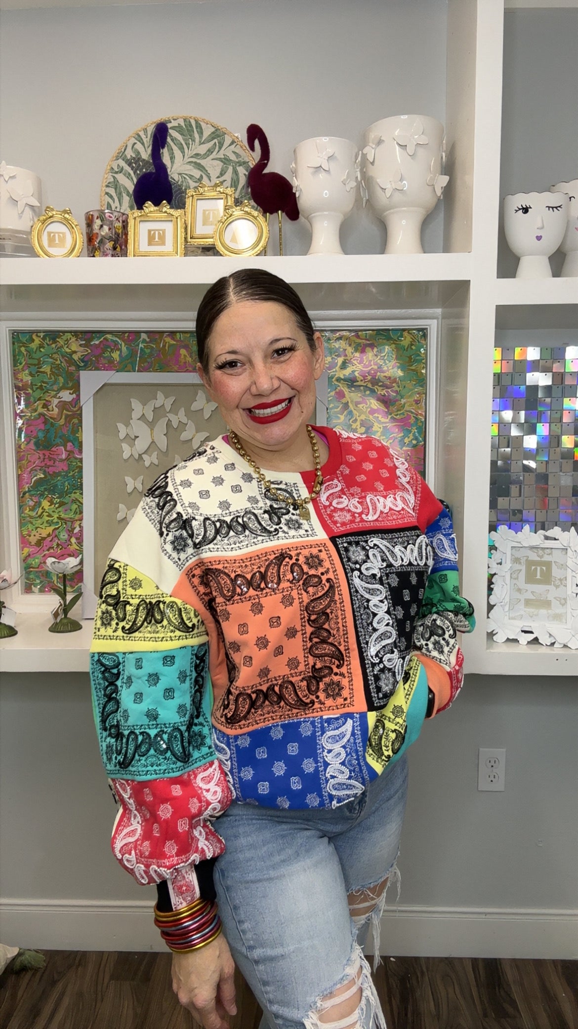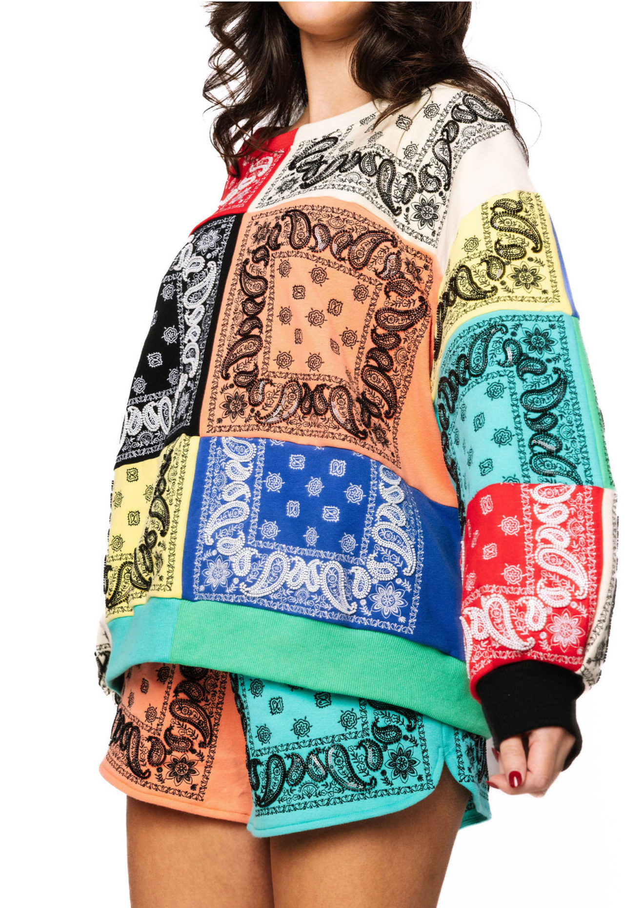 The QOS Multi Colorblock Bandana Sweatshirt features a unique colorblock design that combines aesthetic appeal with comfort. Constructed from high-quality materials, it offers durability and a soft feel against the skin. Ideal for casual wear, this sweatshirt provides an effortless style suitable for various settings. Model is wearing an XS