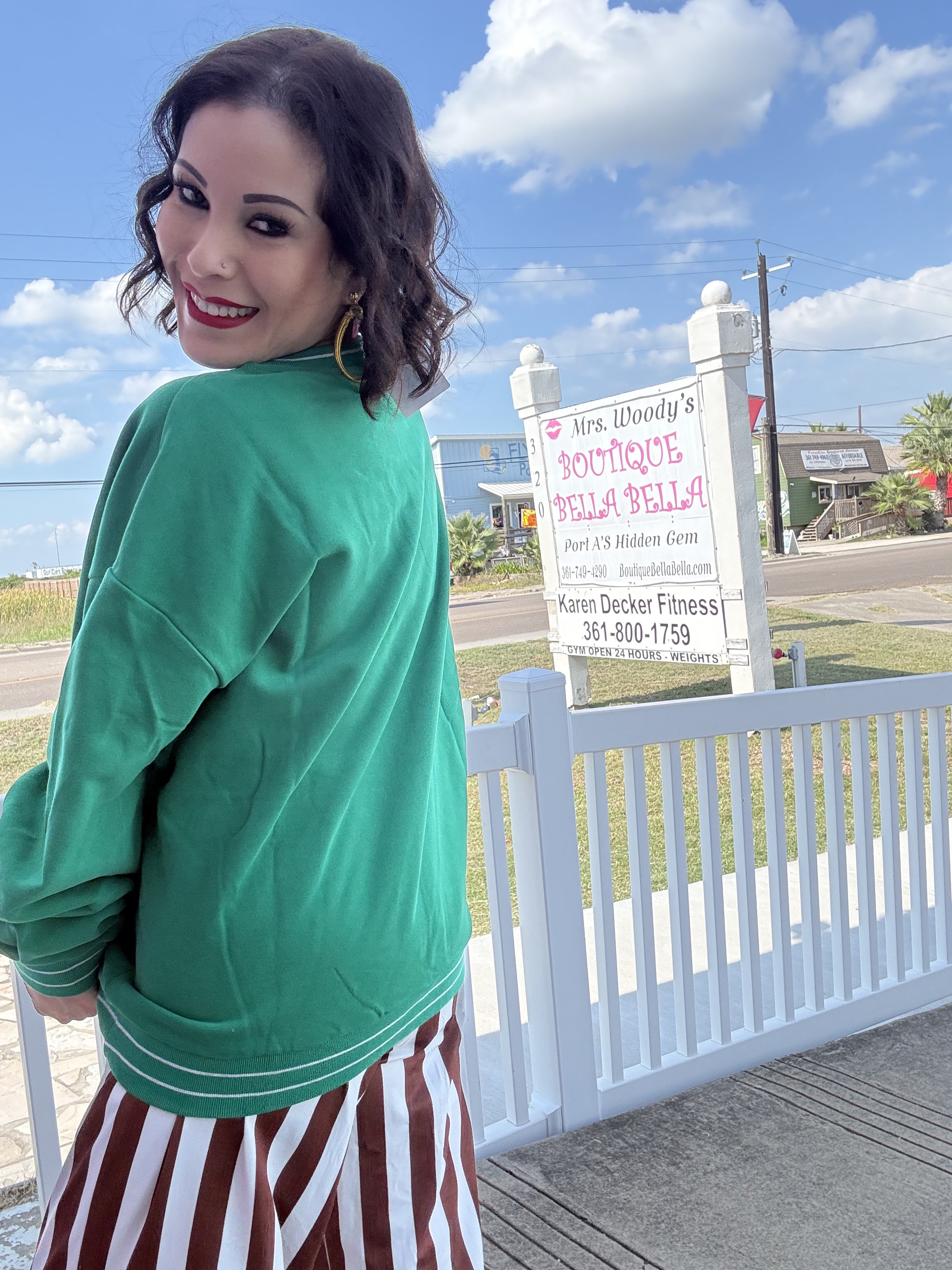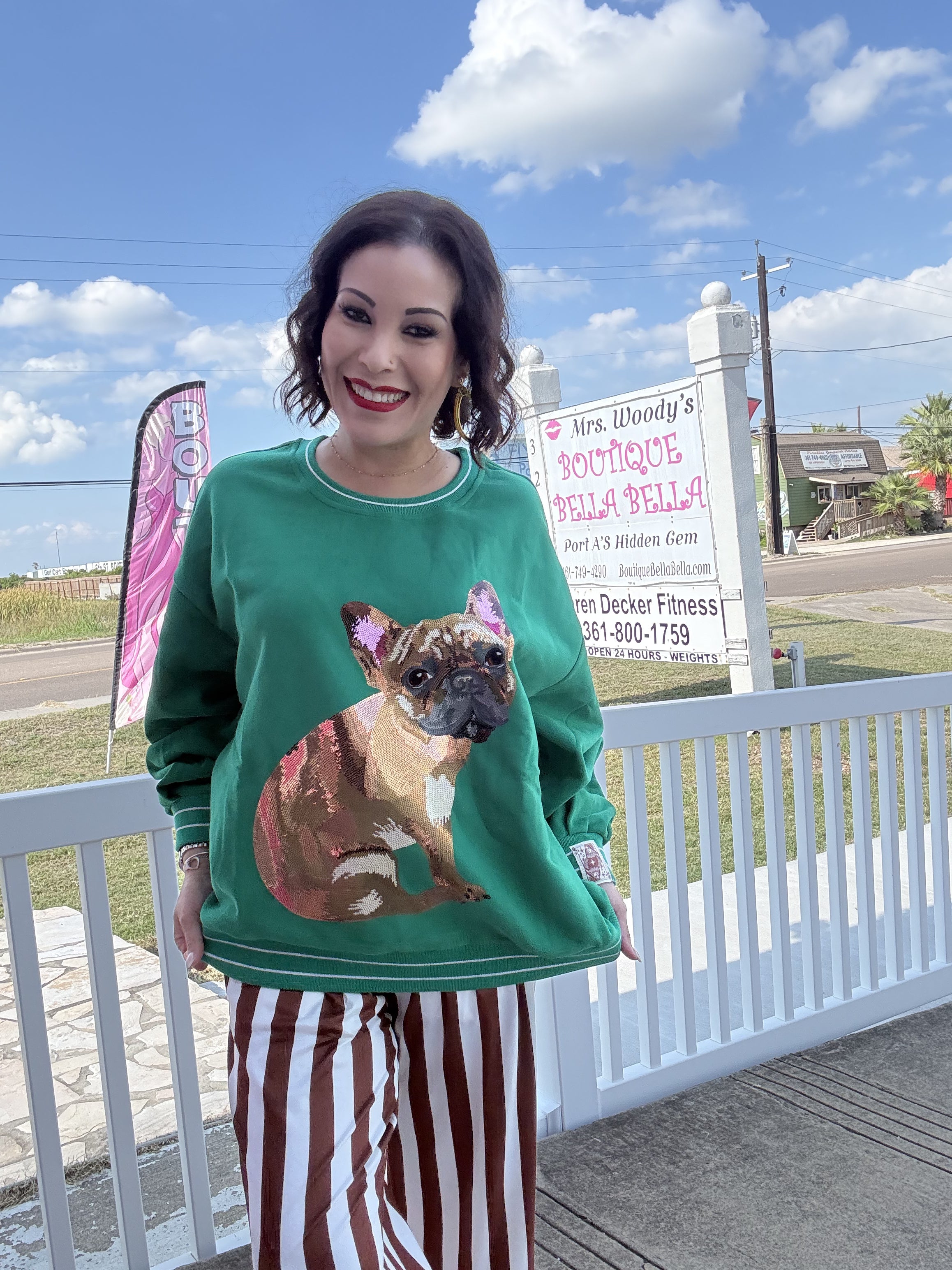 Show off your love for French Bulldogs in style with the Queen of Sparkles QOS Green French Bulldog Sweatshirt. This cozy, vibrant green sweatshirt features an adorable French Bulldog design that adds a fun, playful vibe to any outfit. Perfect for lounging or turning heads on the go, it brings comfort and character together in one sparkling package. Let your quirky side shine while staying warm and comfy all day long! Model is wearing a small.