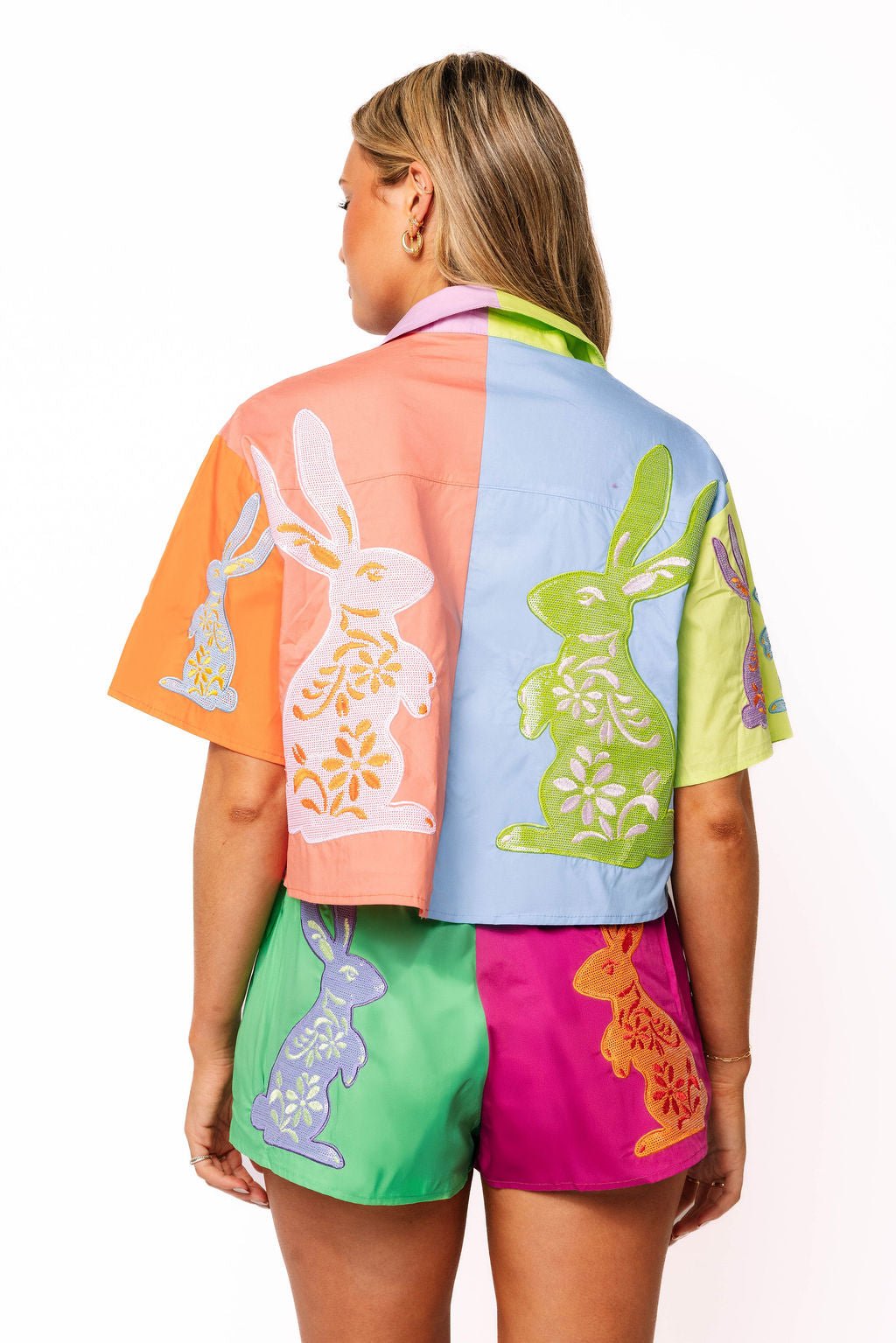 Hop into spring style with this vibrant Queen of Sparkles Easter Bunny short! Featuring a fun multi-colorblock design that celebrates the season, this cotton piece brings cheerful energy to any wardrobe. Perfect for Easter festivities, casual playdates, or brightening up everyday looks, it combines comfort with festive flair. The soft cotton fabric keeps kids cool and happy all day long.