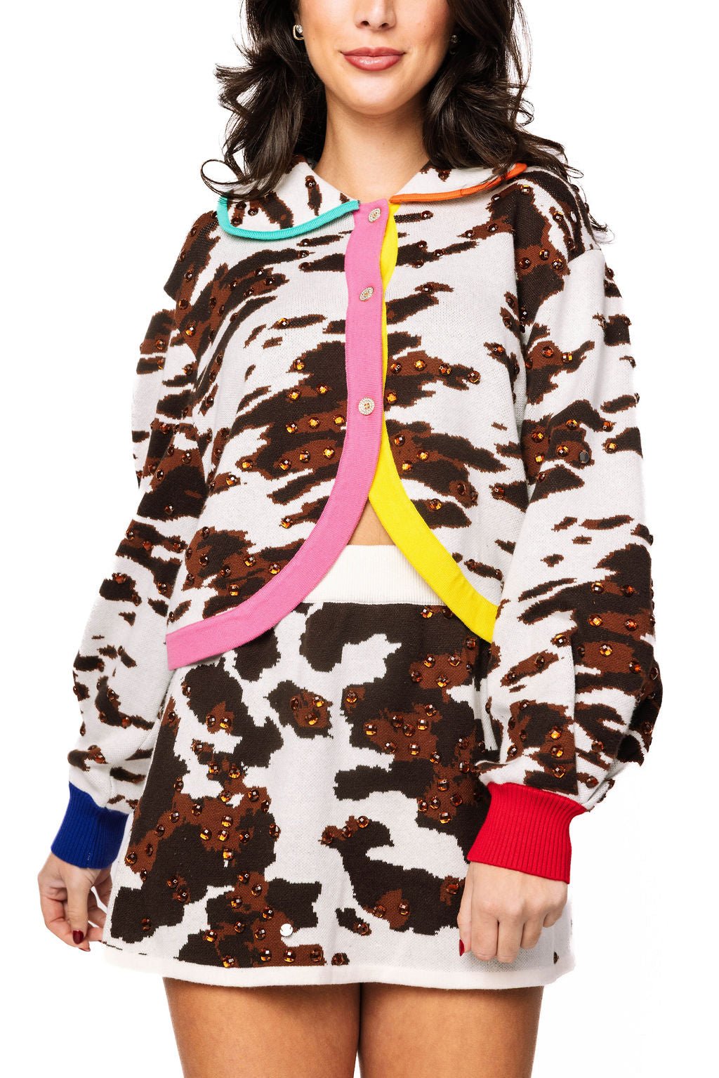 Moo-ve over, basic cardigans! This QOS button-up is here to turn heads with its bold cow print in white and brown, elevated by eye-catching sequin accents and colorful multi-trim detailing. Perfect for anyone who refuses to blend in, this playful piece layers effortlessly over your favorite tees or dresses. Whether you're channeling quirky chic or making a statement at brunch, this cardigan proves that fashion should be fun, fabulous, and unapologetically you.