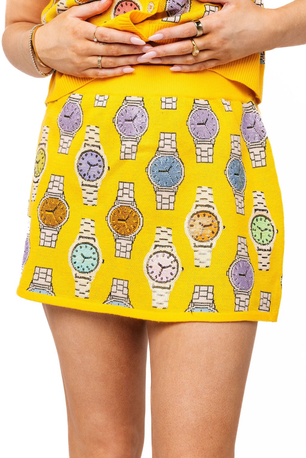 Elevate your wardrobe with this vibrant Queen of Sparkles Yellow Multi Watch Knit Skirt. Featuring a playful watch-print design in cheerful yellow tones with multicolored accents, this knit skirt combines comfort with eye-catching style. The soft, stretchy knit fabric moves with you throughout the day, while the flattering silhouette works for casual outings or dressed-up occasions. Perfect for adding a pop of personality to any ensemble.