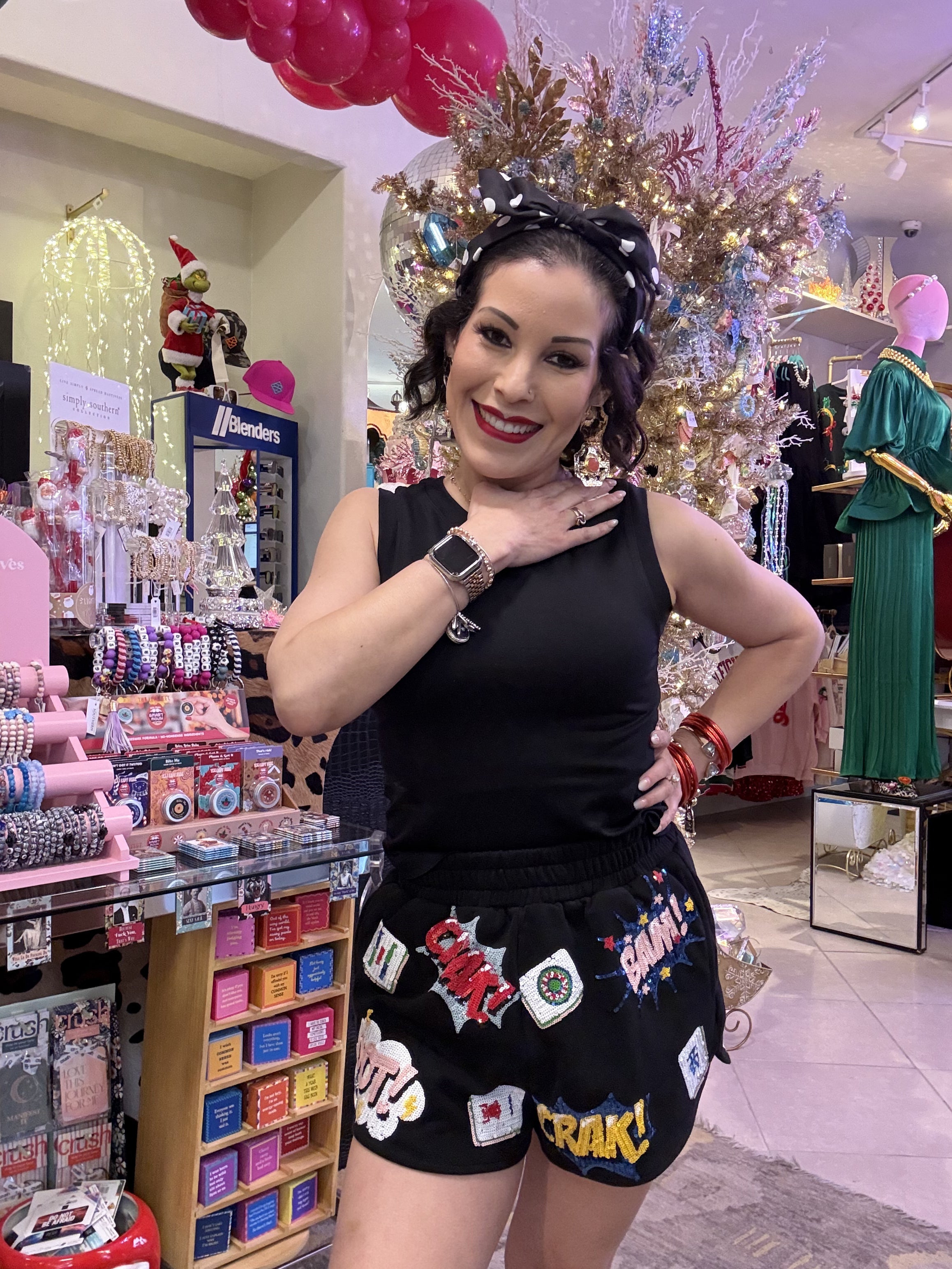 Introducing the Queen of Sparkles Black Mahjong Icon Short. This sleek and stylish garment features a bold black color and a unique mahjong icon design. Made with high-quality materials, it offers both comfort and fashion to elevate your wardrobe. Embrace the elegance and confidence of this must-have item. Model is wearing an XS