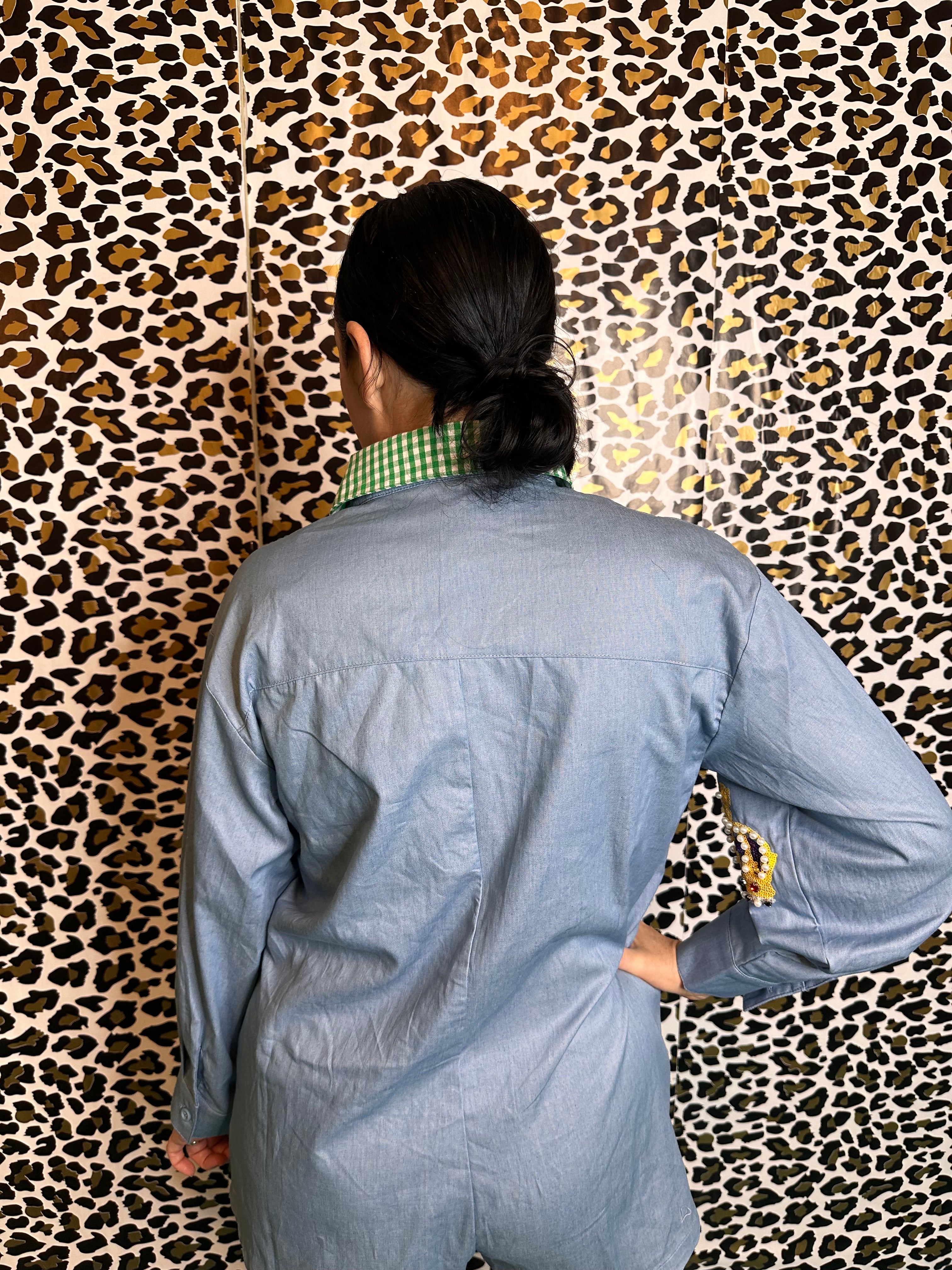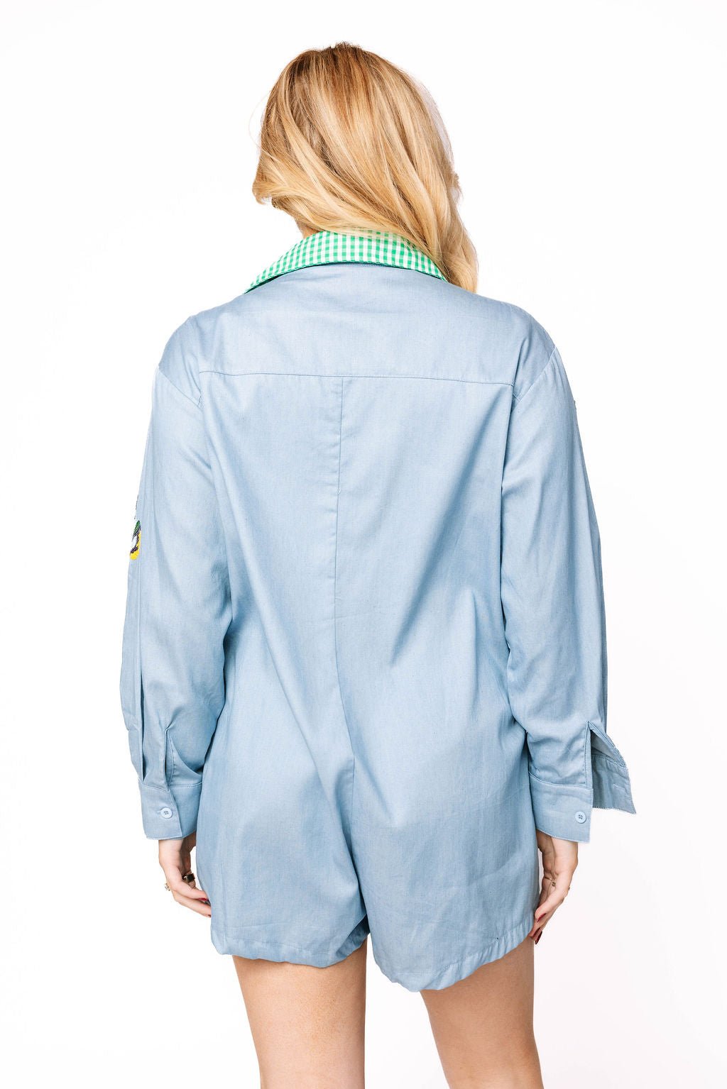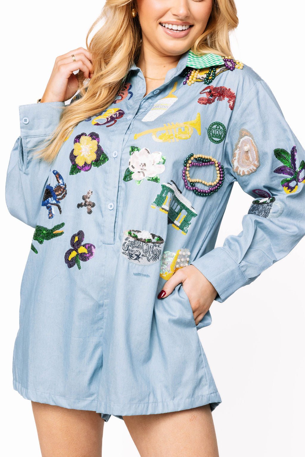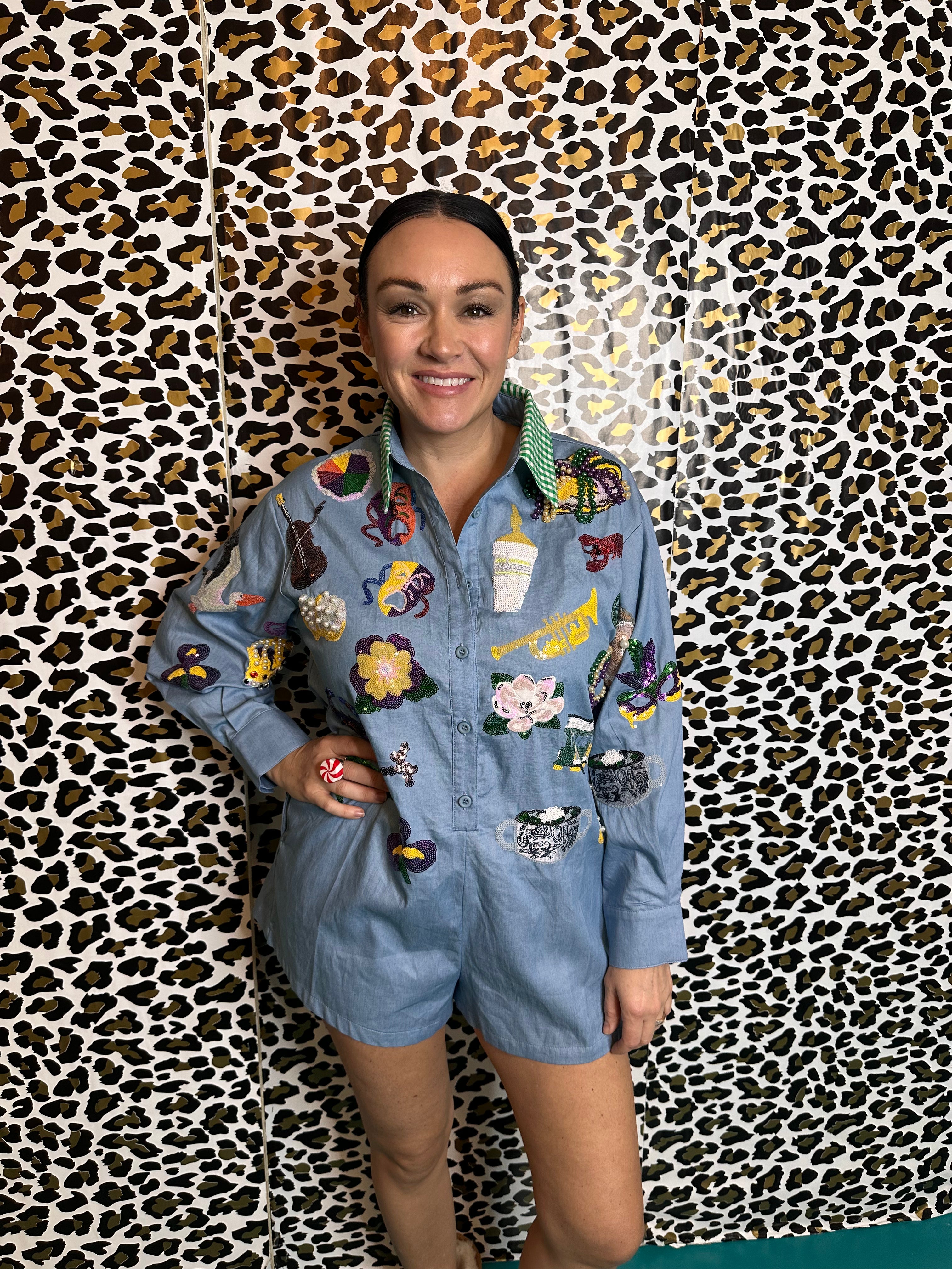 Be the queen of sparkle and fun in our Denim Mardi Gras Icon Romper! With a vibrant green gingham collar, this romper is perfect for standing out at any Mardi Gras celebration. Show off your unique style while staying comfortable in the denim material. Let the good times roll!