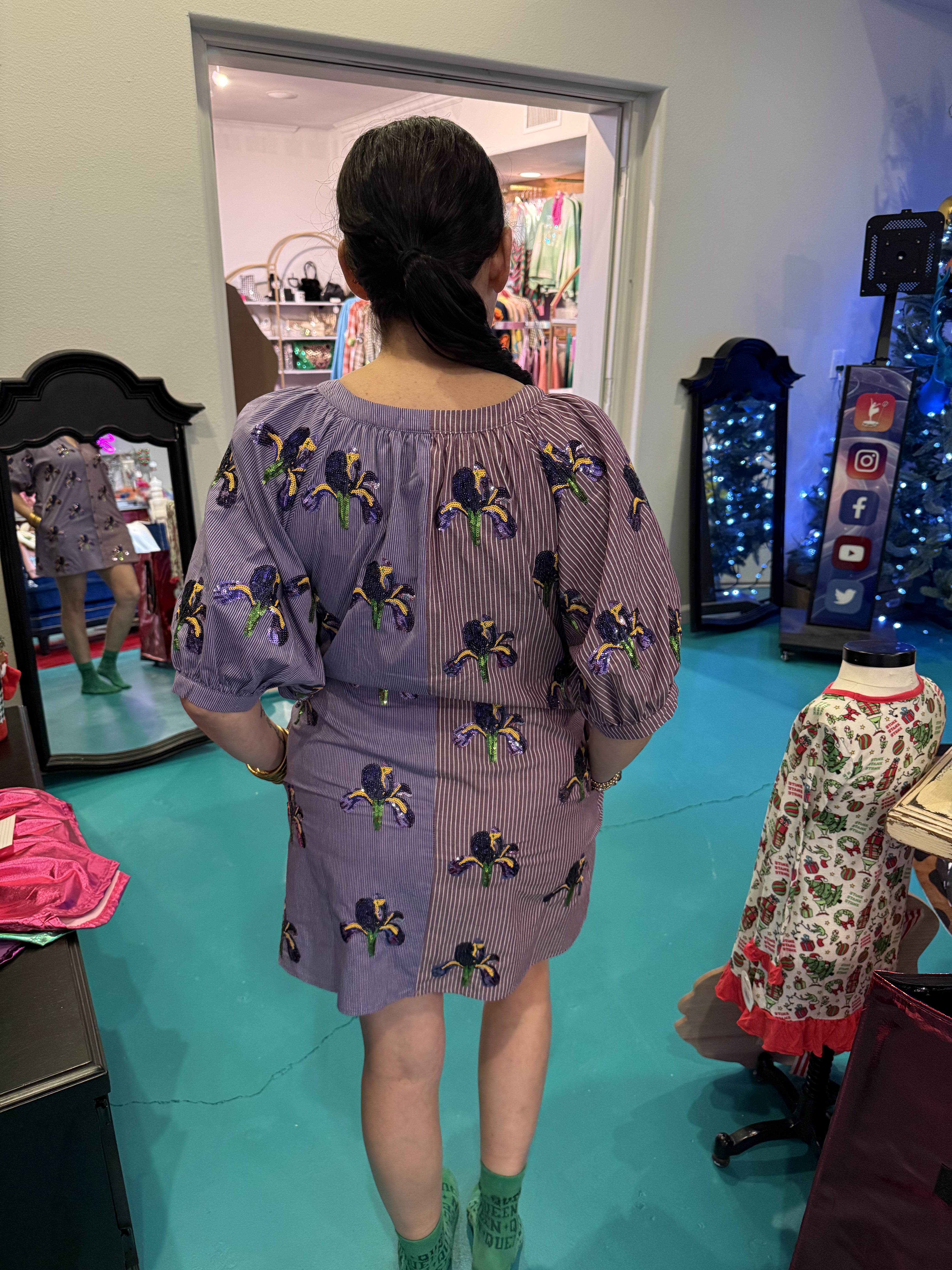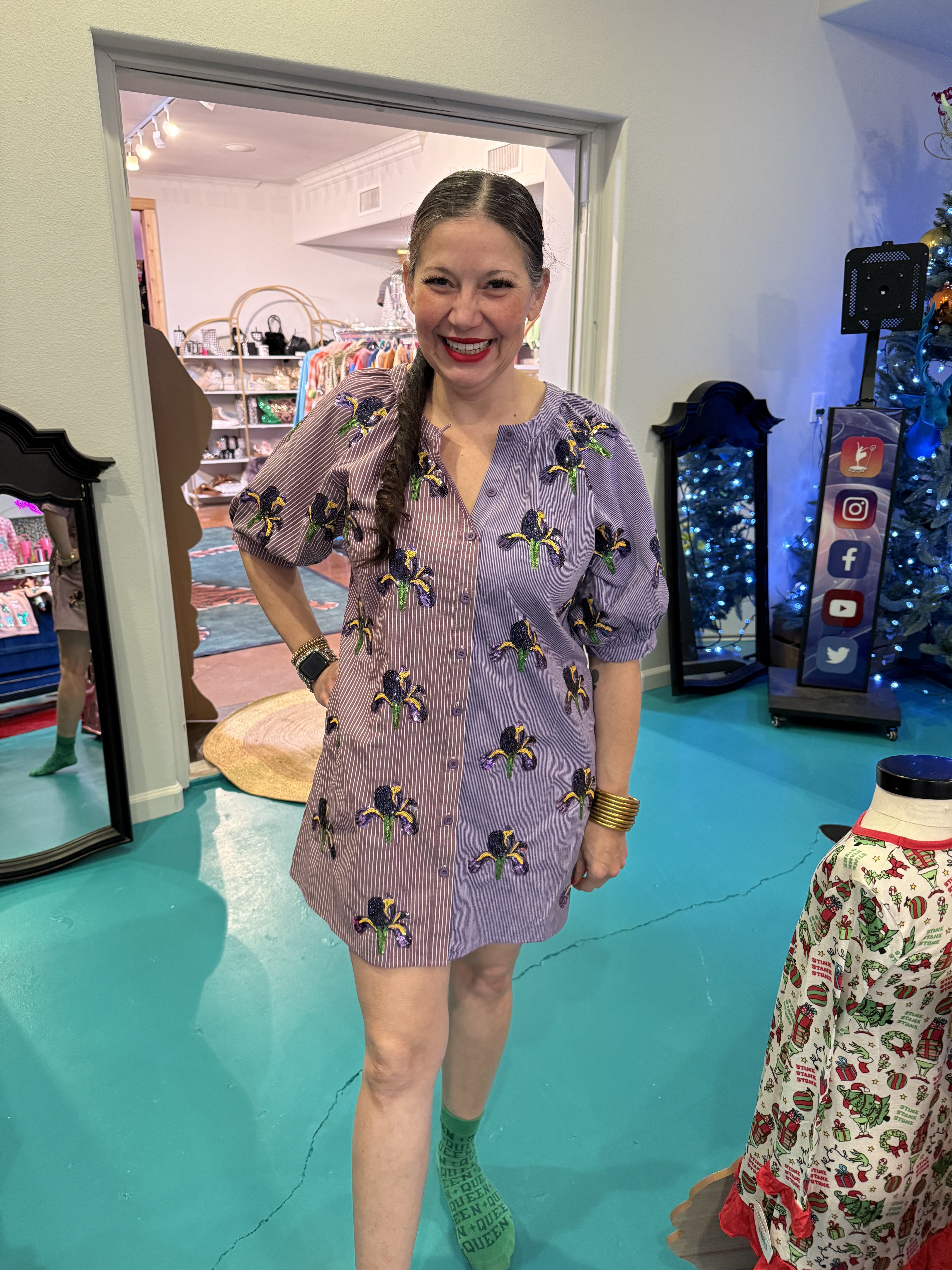 "Rule the style game and sparkle like royalty in our Queen of Sparkles dress. With a bold purple colorblock and vibrant striped design, this cotton dress is sure to turn heads. Plus, the button-up front adds a touch of sass. Get ready to stand out in this regally quirky piece." Model is wearing an XS.