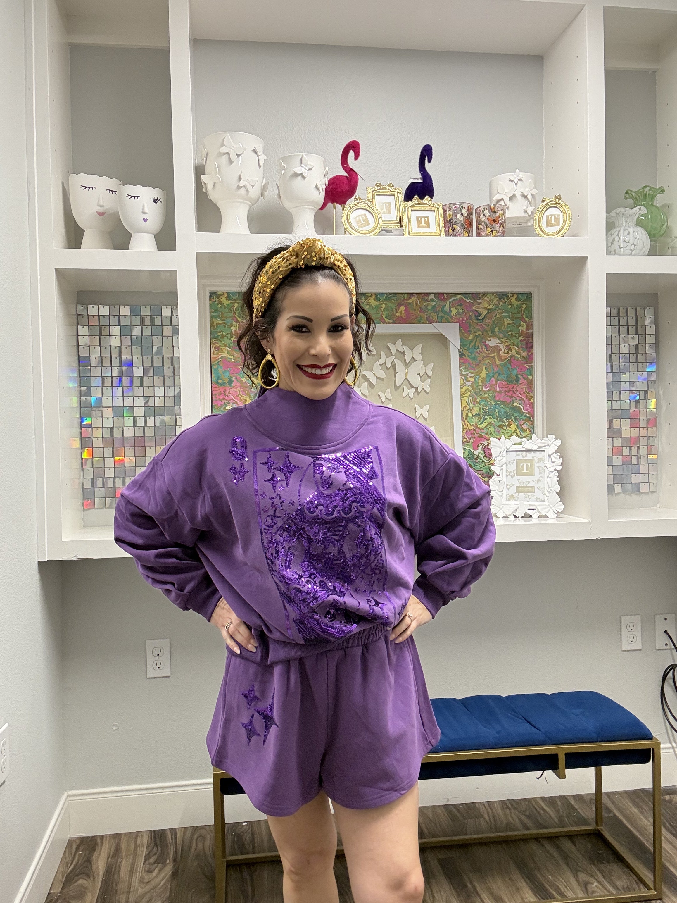 Shine bright like the royalty you are in this Queen of Sparkles Purple QOS Sparkle Logo Short! Featuring the iconic QOS sparkle logo, this playful piece brings glam and attitude to your everyday look. Perfect for those who refuse to blend in, this short celebrates confidence and self-expression with a fun, eye-catching design. Whether you're hitting the town or making a statement, let your sparkle do the talking! Model is wearing an XS