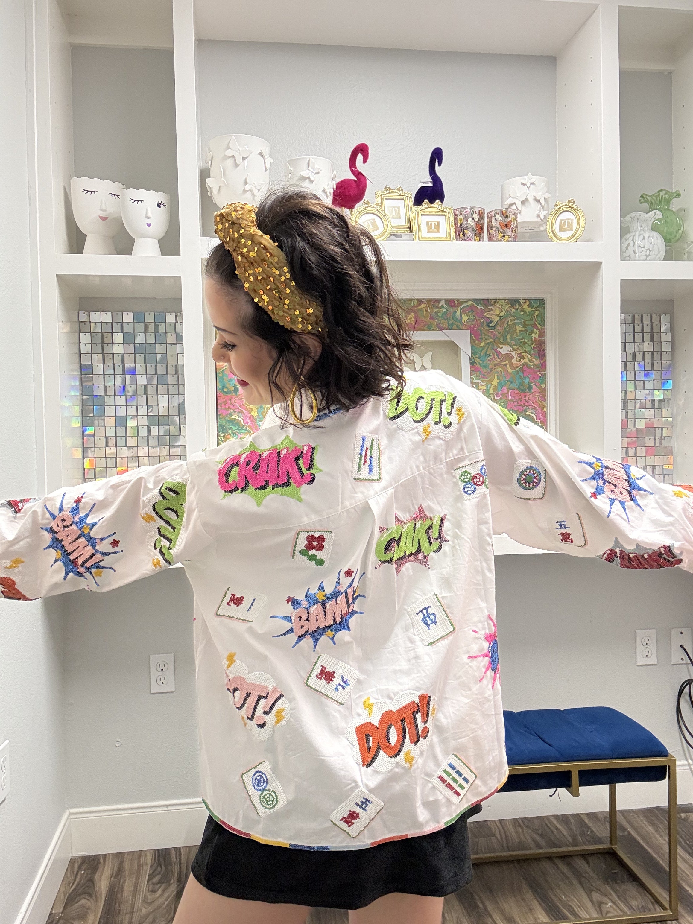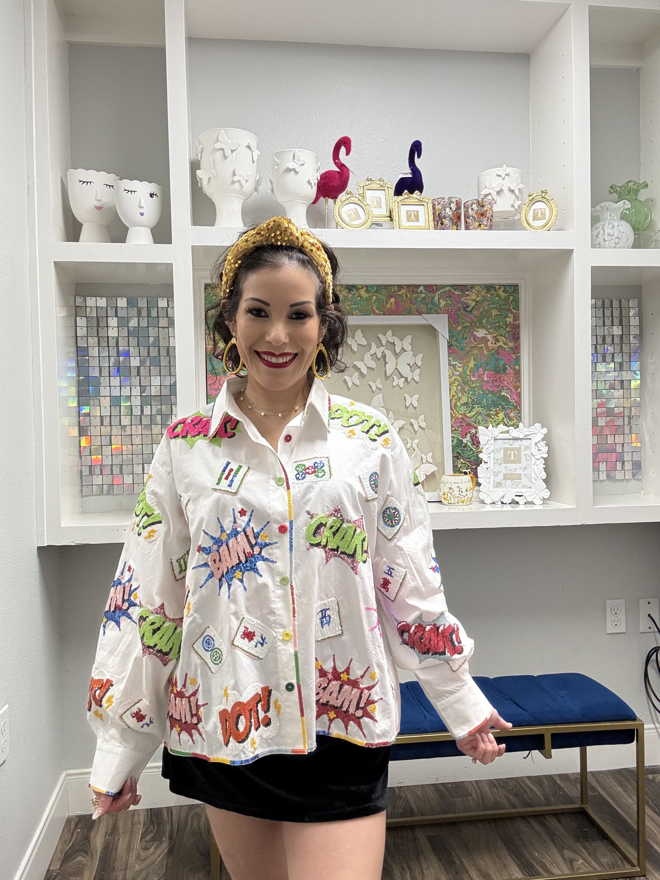 Bring the glam and the games with this show-stopping collared top from Queen of Sparkles. Featuring a bold mahjong icon design on crisp white fabric, it's finished with a vibrant rainbow trim that adds instant personality to your wardrobe. Perfect for anyone who loves mixing retro gaming vibes with modern sparkle, this piece is a conversation starter that celebrates bold style and playful confidence. Dress it up or down—either way, you're winning. Model is wearing an XS