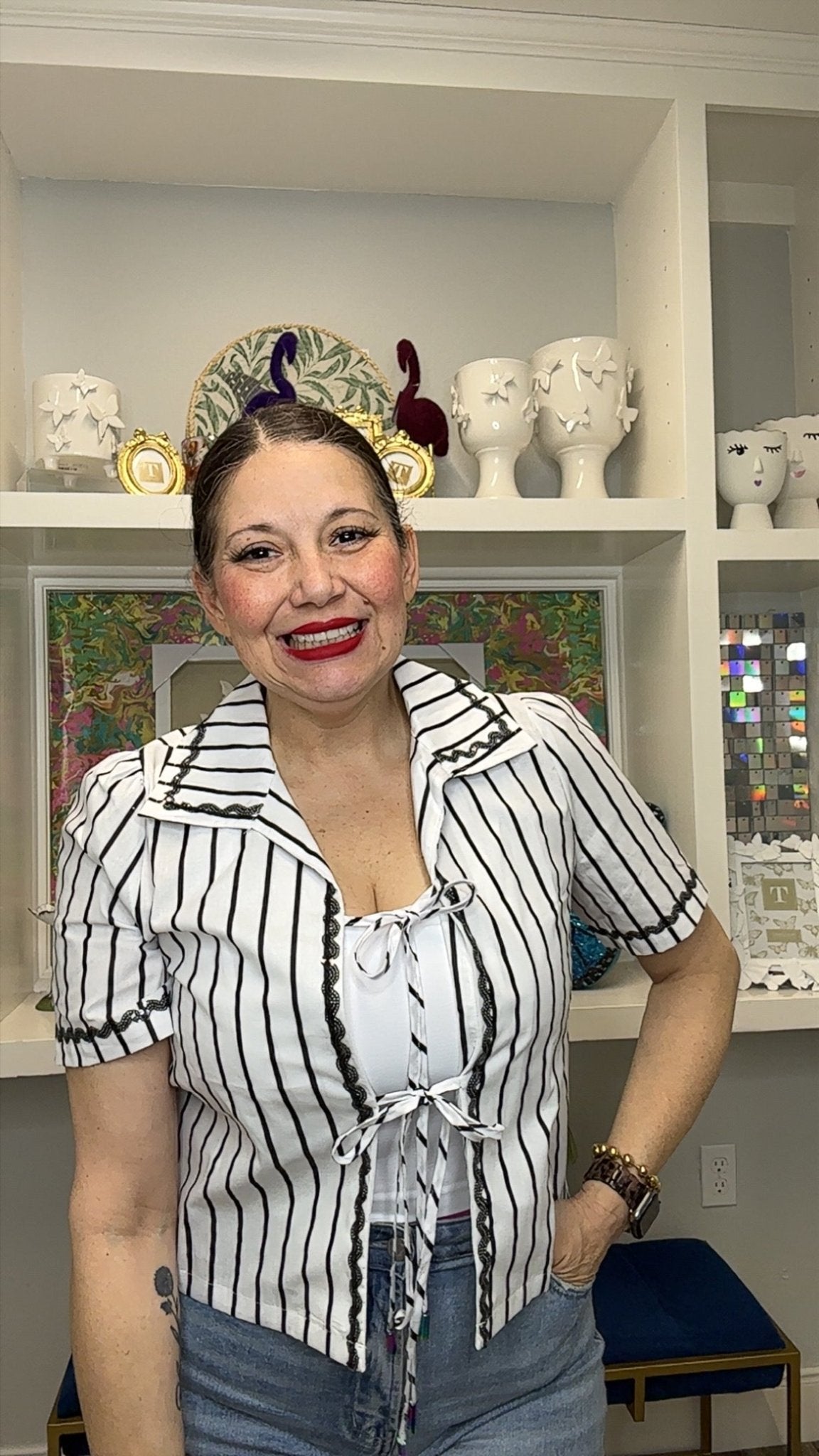Stripes meet style in this Queen of Sparkles classic! The black and white striped cotton top features an adorable tie-up collar that adds a flirty, feminine touch to your everyday look. Crafted from soft, breathable cotton, it's perfect for casual outings, weekend brunches, or dressing up with your favorite accessories. The timeless stripe pattern pairs effortlessly with jeans, skirts, or shorts. Whether you're channeling vintage vibes or modern chic, this versatile top is your new go-to piece for looking put-together without trying too hard.