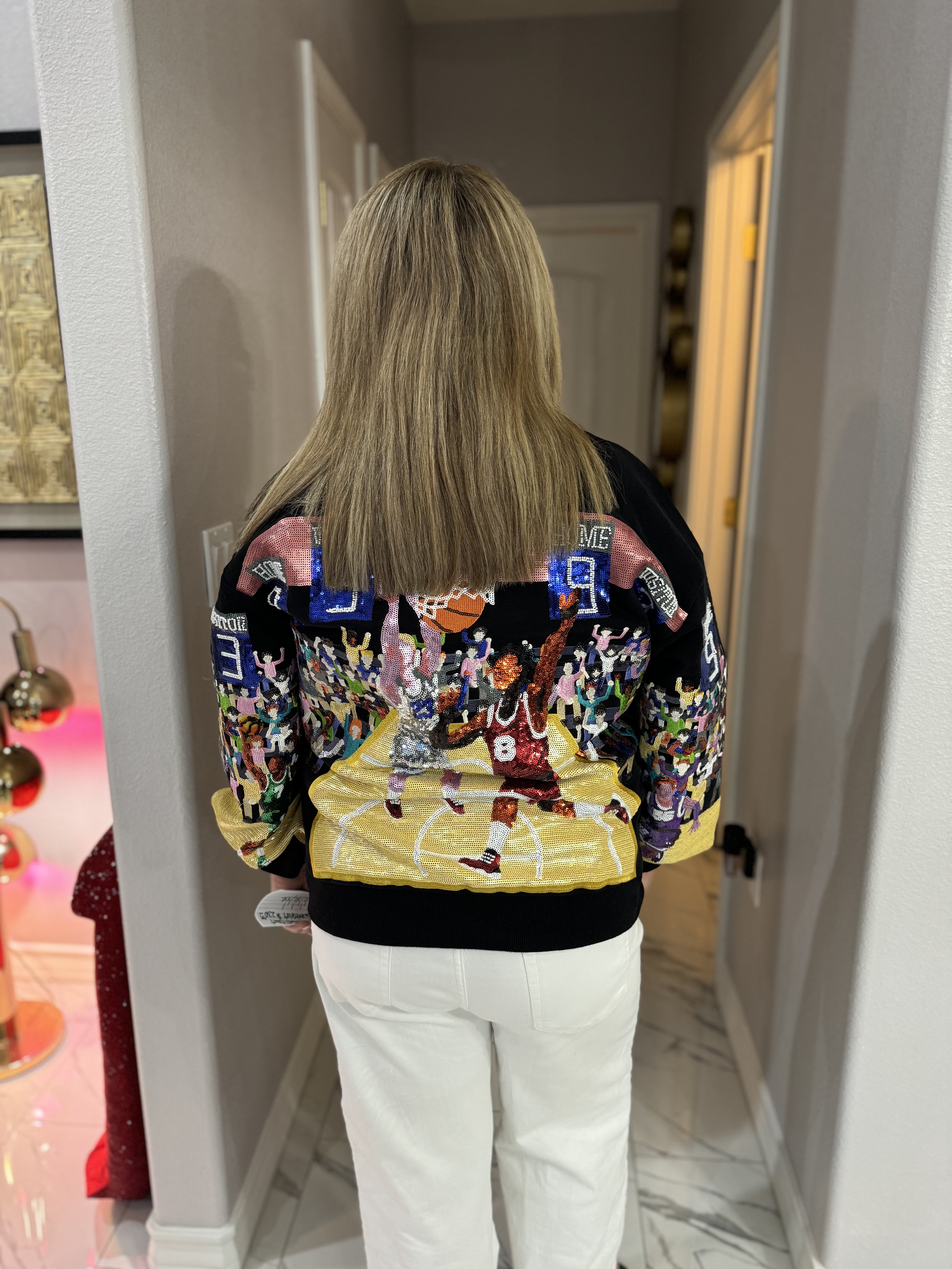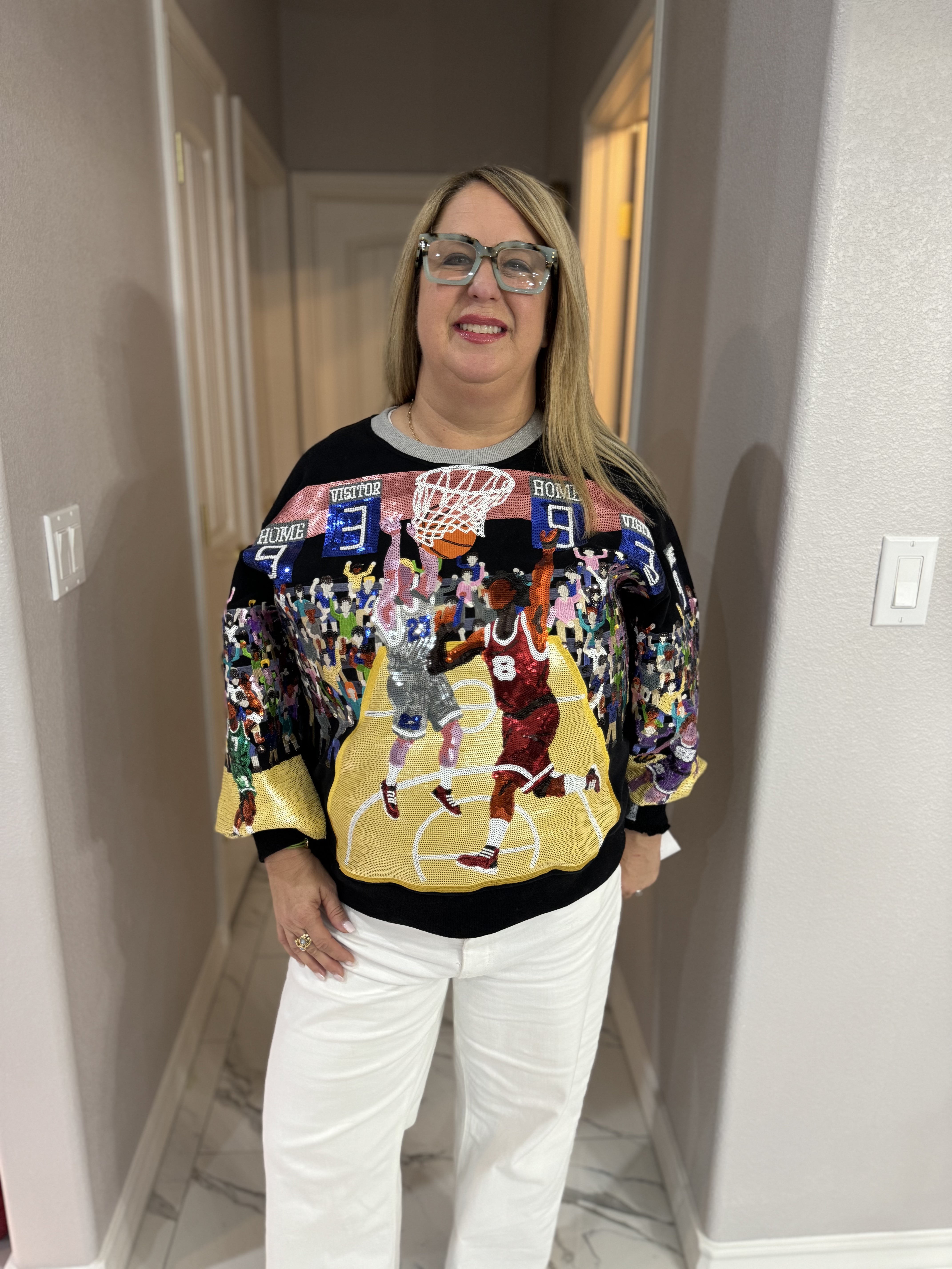 Step onto the court in style with this Queen of Sparkles Black Basketball Court Scene Sweatshirt. Featuring a bold, eye-catching court graphic that celebrates the game, this cozy pullover combines athletic vibes with sparkly flair. Perfect for game day, practice, or just showing your love for basketball, it's the ultimate way to rep your passion with personality. Soft, comfortable, and undeniably cool—because why blend in when you can shine?