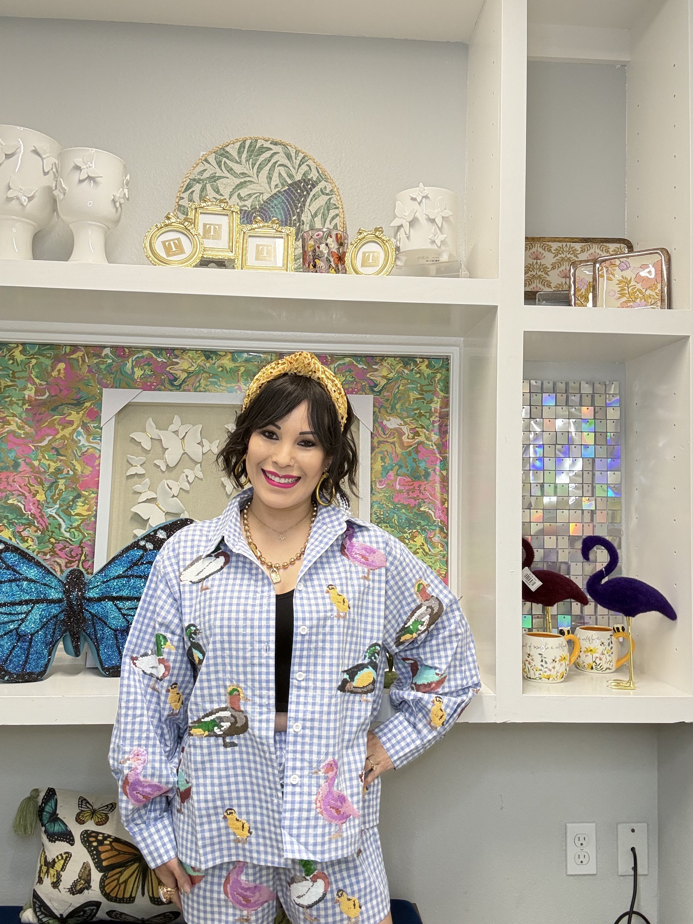 Quack, quack, fabulous! This charming button-up collar top features a delightful blue and white gingham pattern scattered with adorable duck motifs—perfect for adding whimsy to your wardrobe. The classic gingham print pairs beautifully with the playful duck details, while the structured collar and button-up design keep things polished and put-together. Whether you're dressing up for brunch or keeping it casual, this Queen of Sparkles piece brings personality and style to any outfit. A fun, conversation-starting top that celebrates your quirky side! Models are wearing an XS