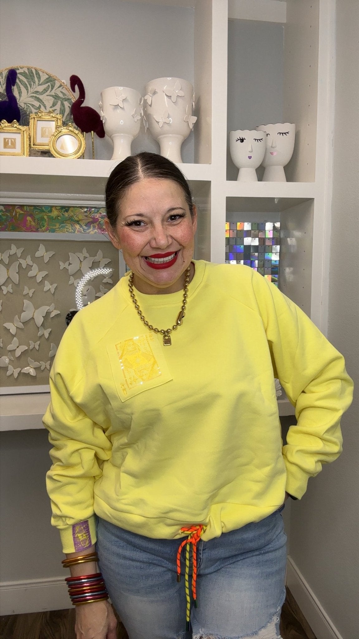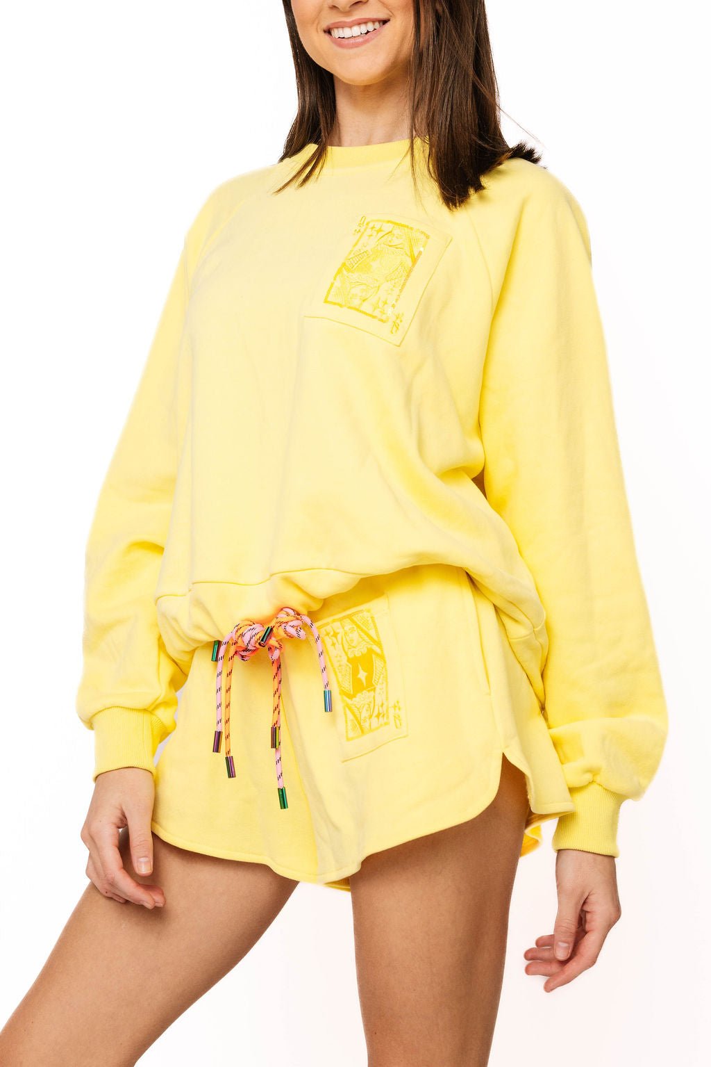 Shine bright in this Queen of Sparkles yellow tie sweatshirt, where tonal QOS branding meets cozy comfort. The playful tie-dye effect adds dimension and movement to your everyday look, while the soft sweatshirt fabric keeps you feeling relaxed and effortless. Perfect for fans who want to rep their sparkly side with style. Whether you're lounging or making a statement, this piece brings that signature QOS energy to your wardrobe. Model is wearing an XS