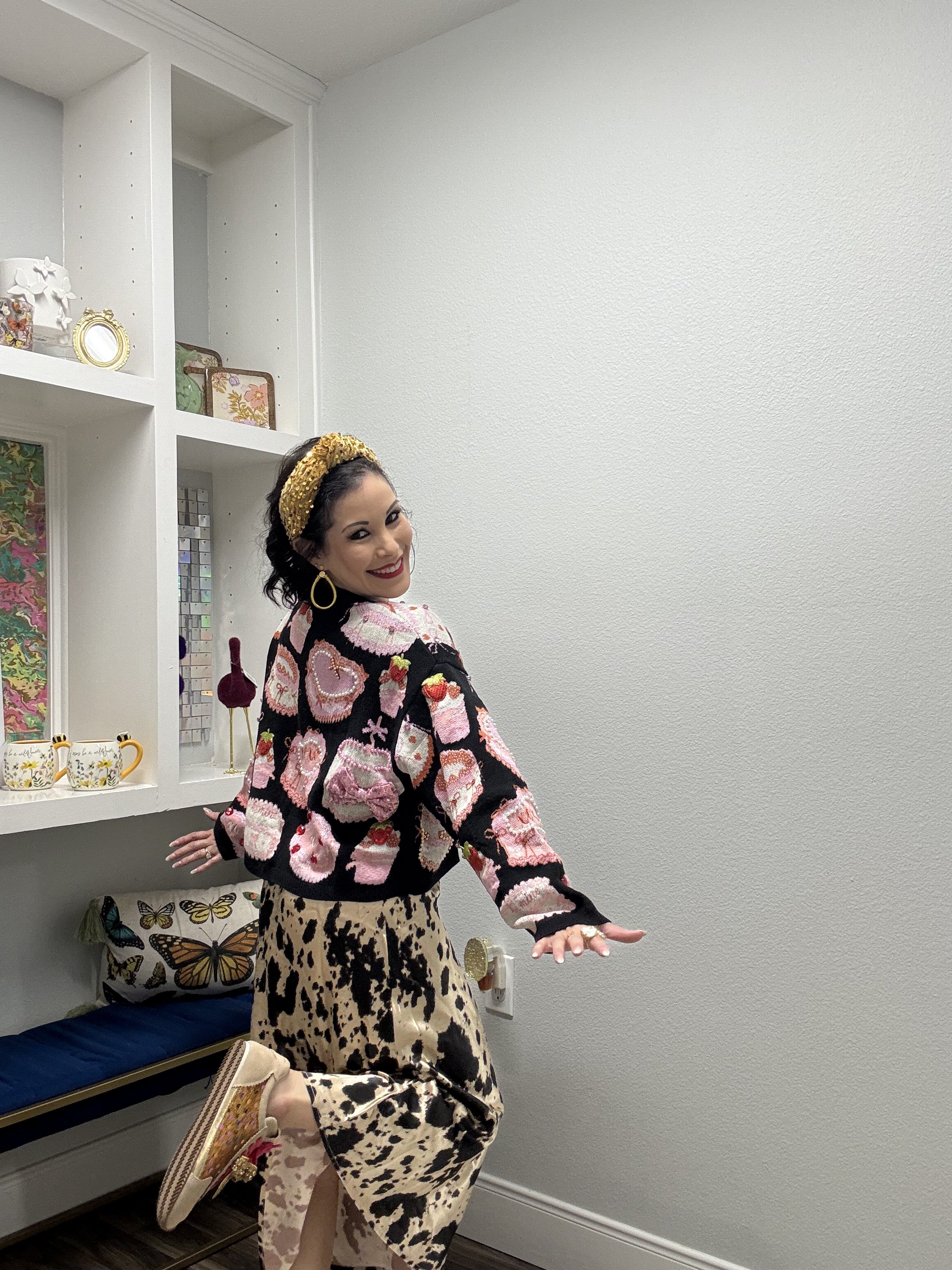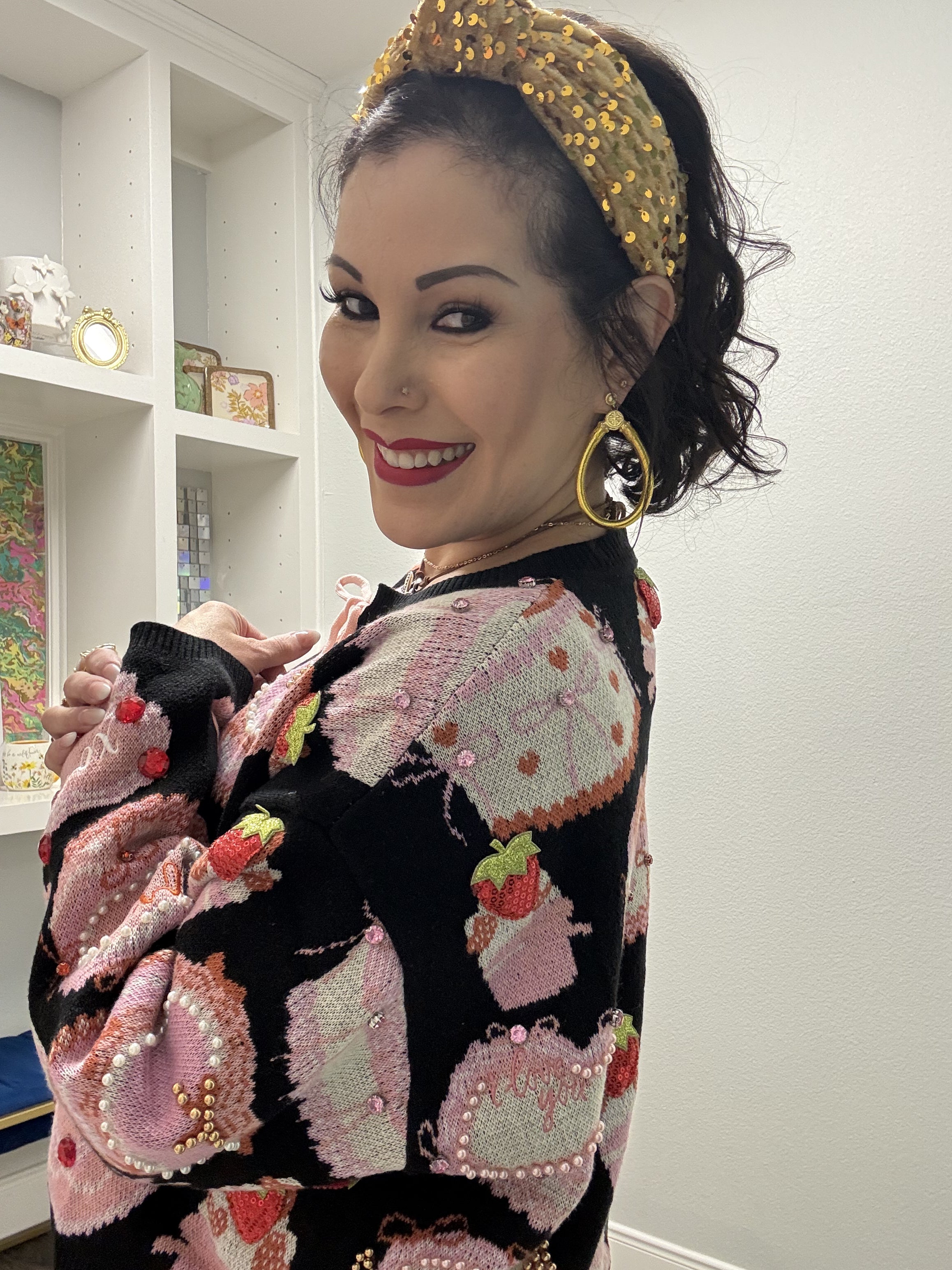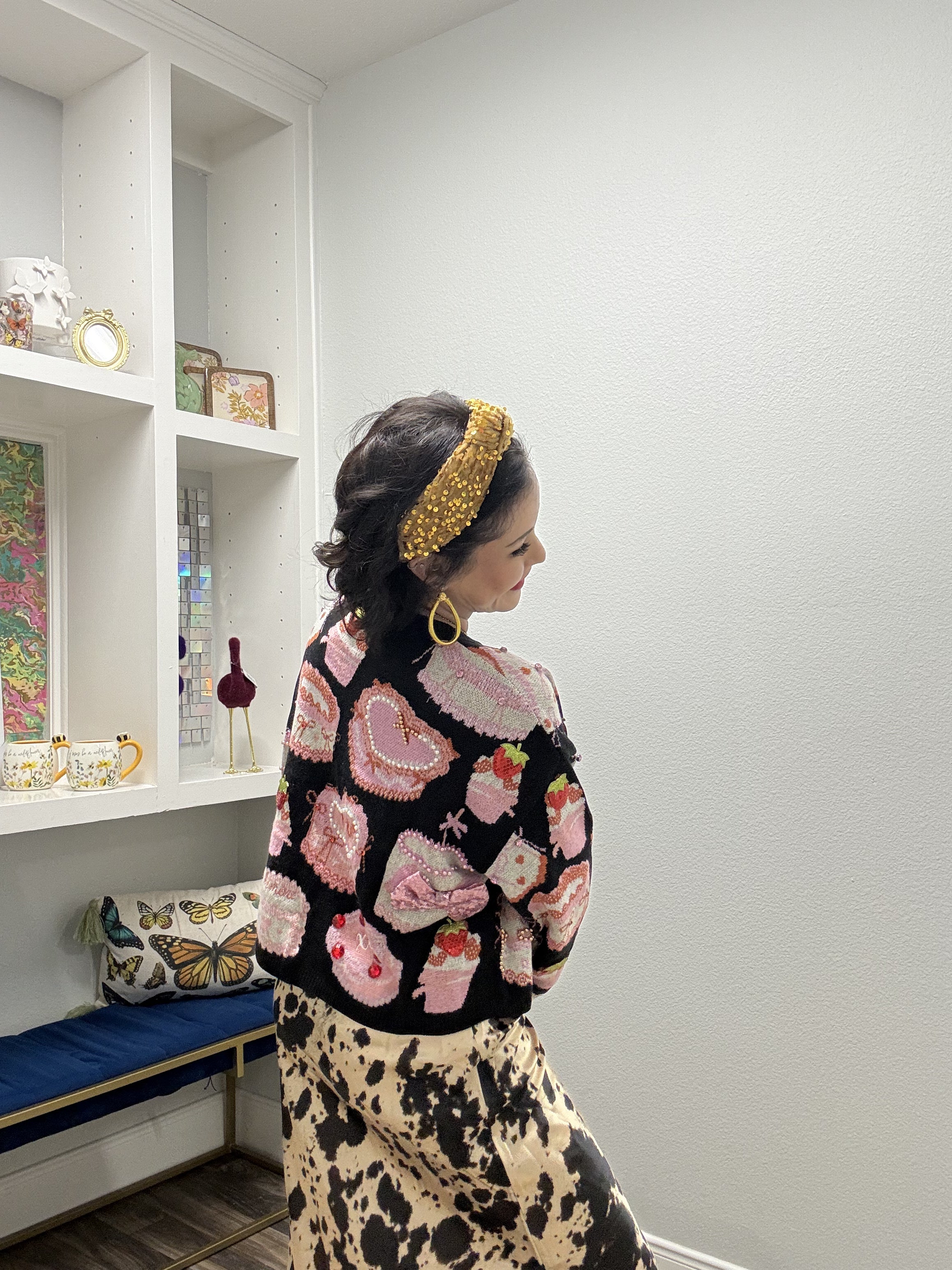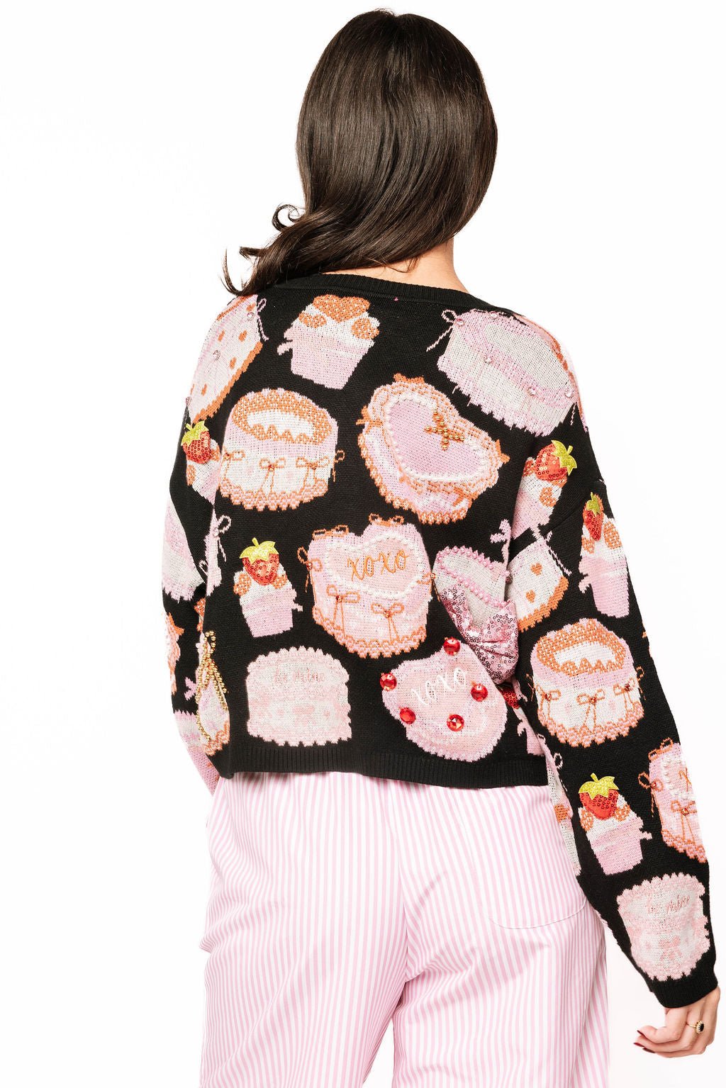 Indulge your sweet side with this delightfully quirky tie-up sweater featuring adorable cakes and pastries scattered across a classic black backdrop. The playful front tie detail adds a flirty, feminine touch that's perfect for casual outings or cozy nights in. Whether you're a dessert devotee or just love fun, whimsical fashion, this piece brings personality and charm to your everyday wardrobe. Soft, comfortable, and undeniably cute—because life's too short for boring sweaters. Model is wearing an XS