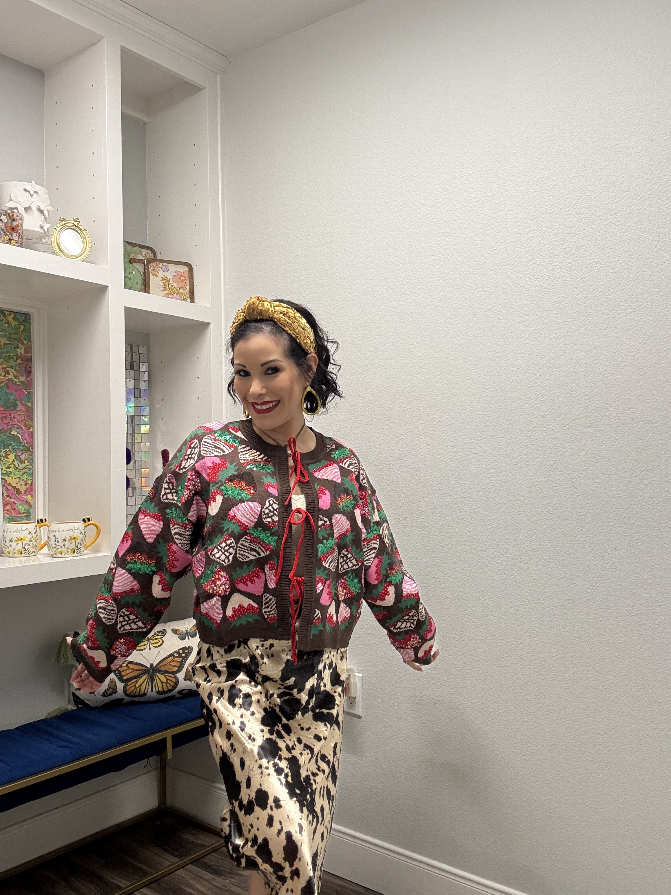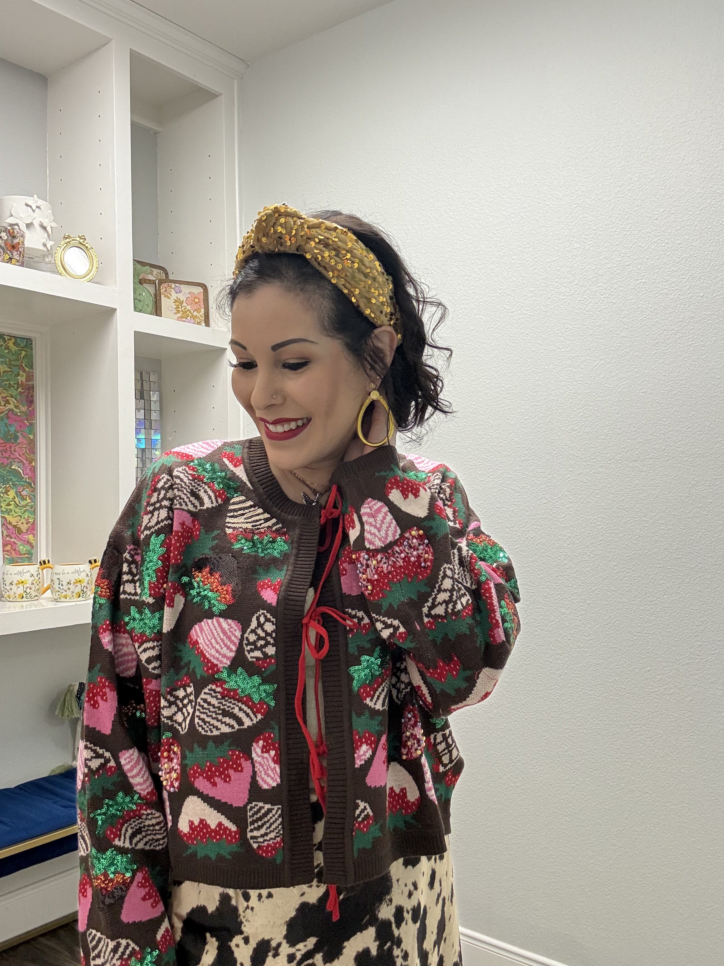 Tie up your style with this whimsical brown sweater featuring adorable strawberry motifs in vibrant multi-colors. Perfect for adding a pop of fruity fun to your everyday look, this cozy piece brings playful charm and comfort together. The tie-up design offers a flattering, adjustable fit that works with any body type. Whether you're heading out for a casual day or want to make a sweet statement, this Queen of Sparkles creation is your go-to for turning heads with personality and warmth. Model is wearing an XS