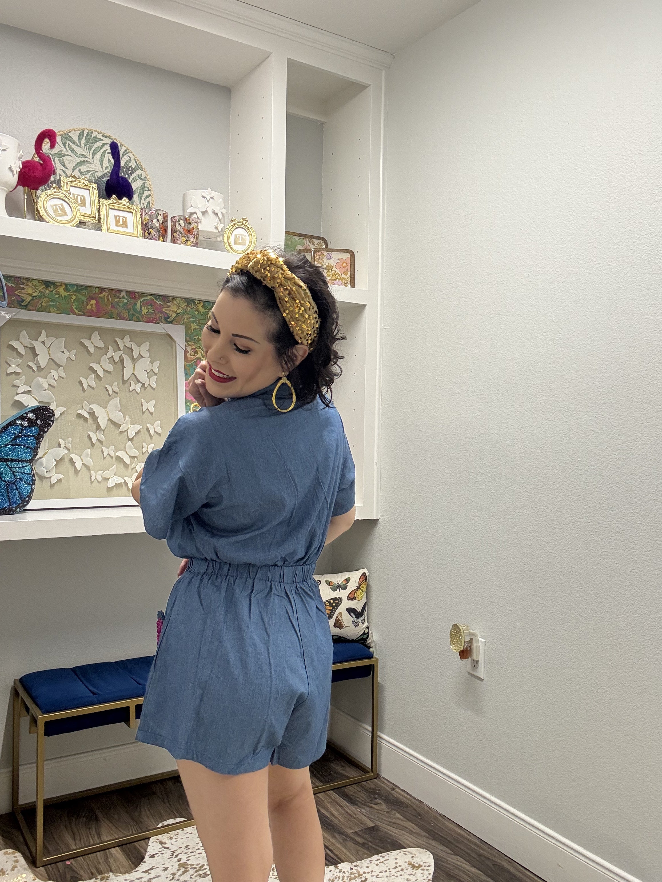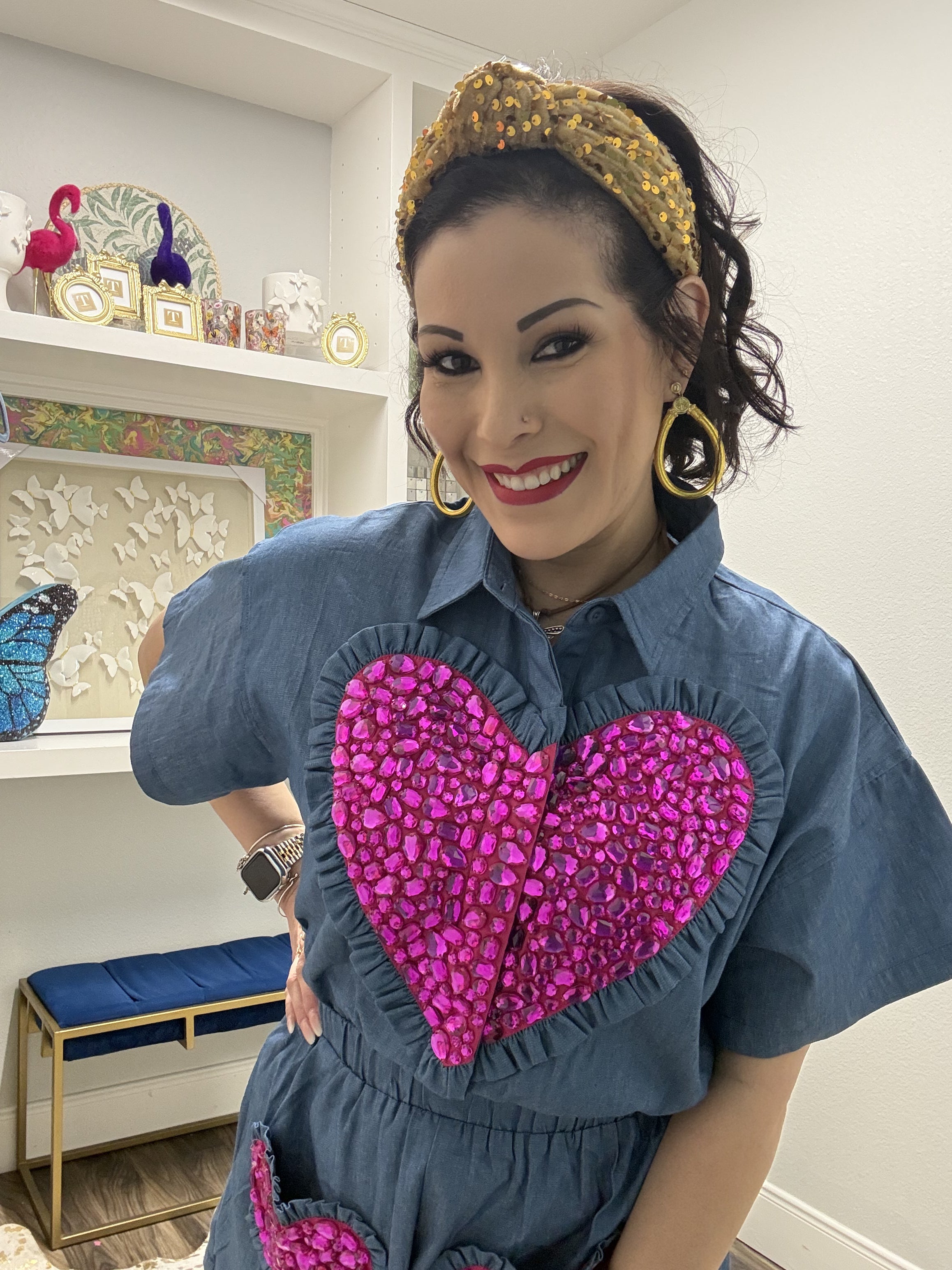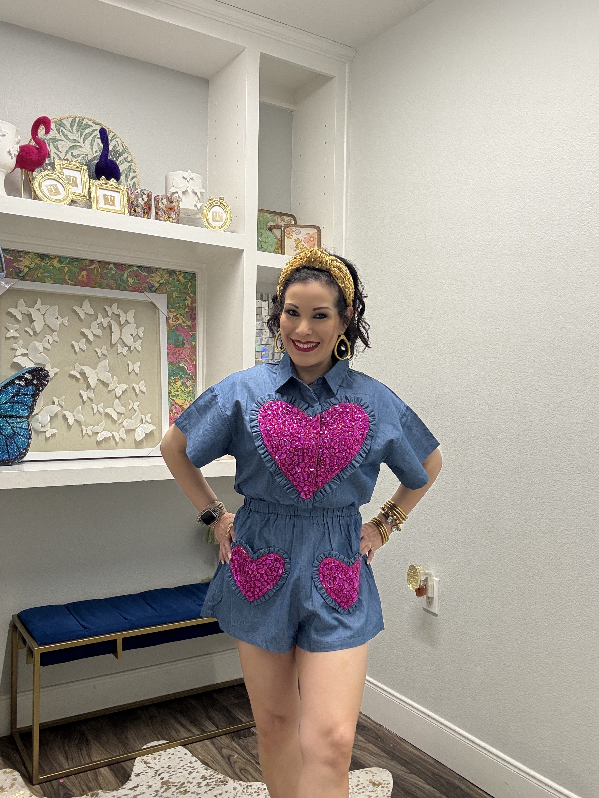 Strut your stuff in this show-stopping romper that's equal parts denim cool and purple glam! Oversized fit means maximum comfort while you're turning heads, and those jeweled heart details? Pure sparkle magic. Ruffled edges add a flirty touch that screams confidence. Whether you're hitting the town or making a statement at your next event, this piece proves that more is more—and fabulous is always in style. Model is wearing an XS.