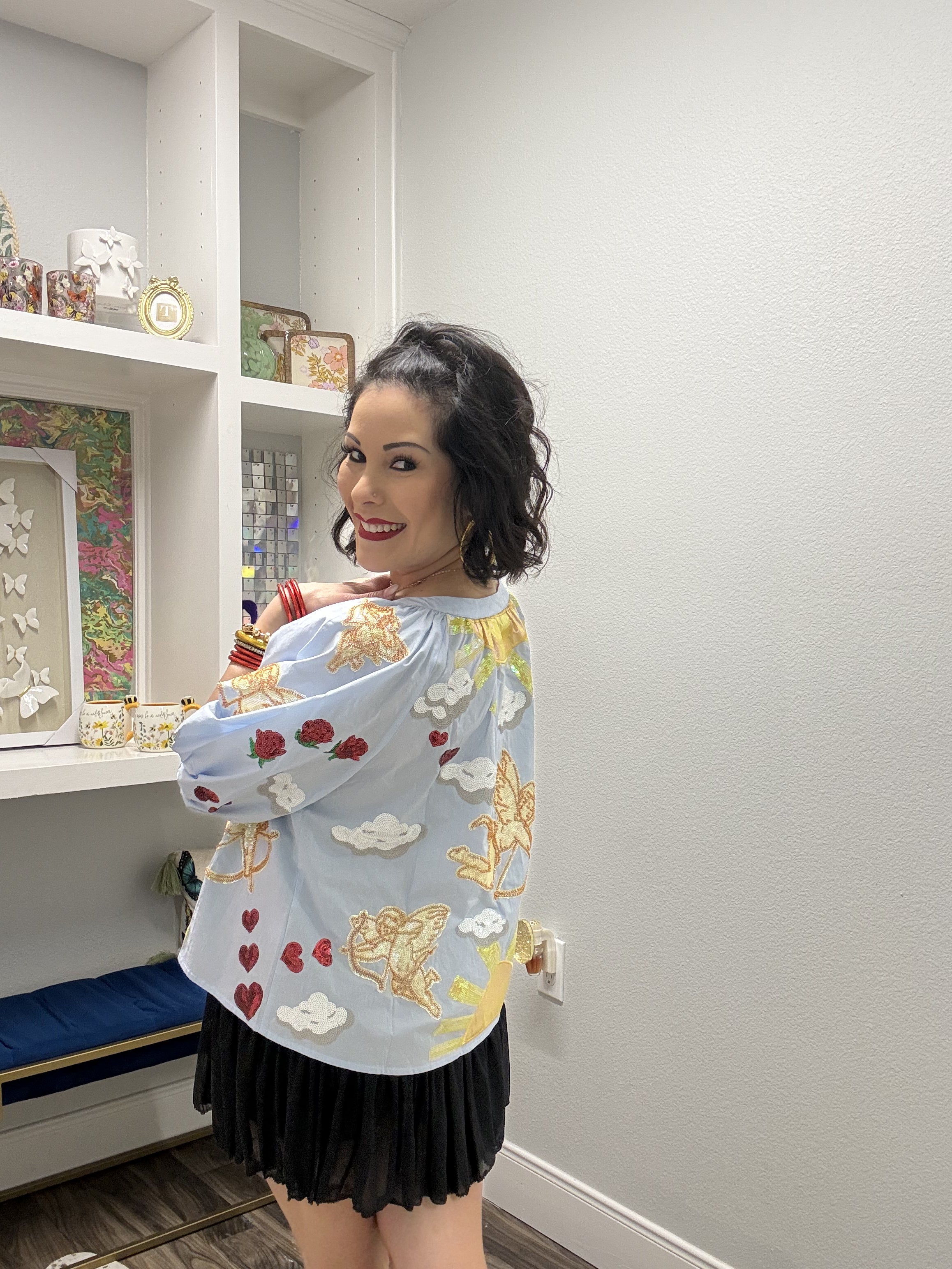 Spread love and sparkle wherever you go in this dreamy light blue button-up from Queen of Sparkles. Featuring a whimsical "Cupid in the Sky" design, this soft cotton shirt brings playful romance to your everyday wardrobe. Perfect for date nights, casual outings, or whenever you want to add a touch of celestial charm to your look. The classic button-up silhouette keeps things timeless while the enchanting print steals the show. Comfort meets cuteness in this must-have piece. Model is wearing an XS