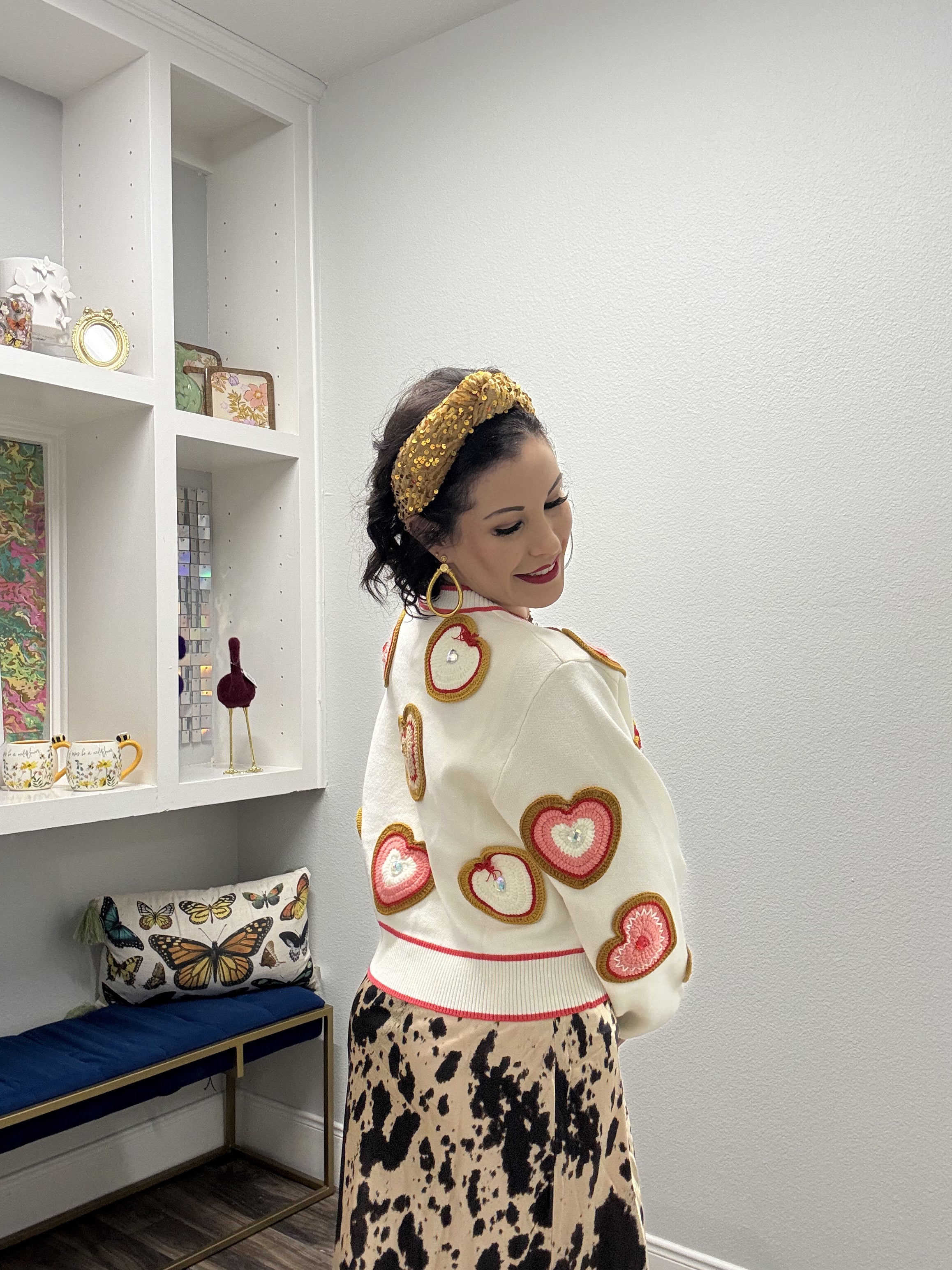 Spread love and sweetness with this charming white knit cardigan featuring adorable Valentine's heart and cookie designs. Perfect for celebrating the season of romance, this button-up style layers beautifully over your favorite tees and dresses. The soft, cozy knit keeps you warm while the playful embellishments add instant personality to any outfit. Whether you're heading to a Valentine's party or just want to spread good vibes, this cardigan is your new go-to piece for festive, feel-good fashion. Model is wearing an XS