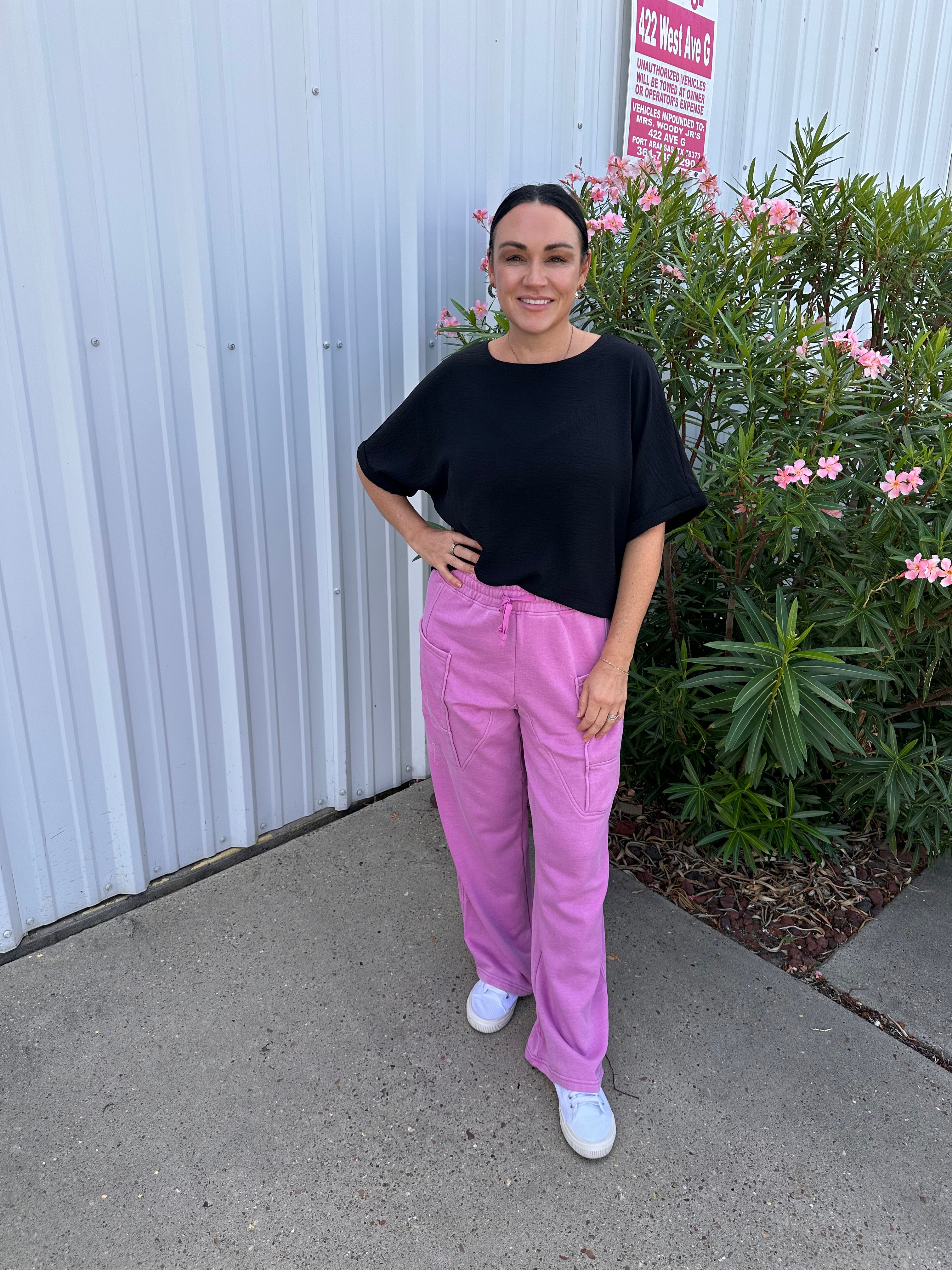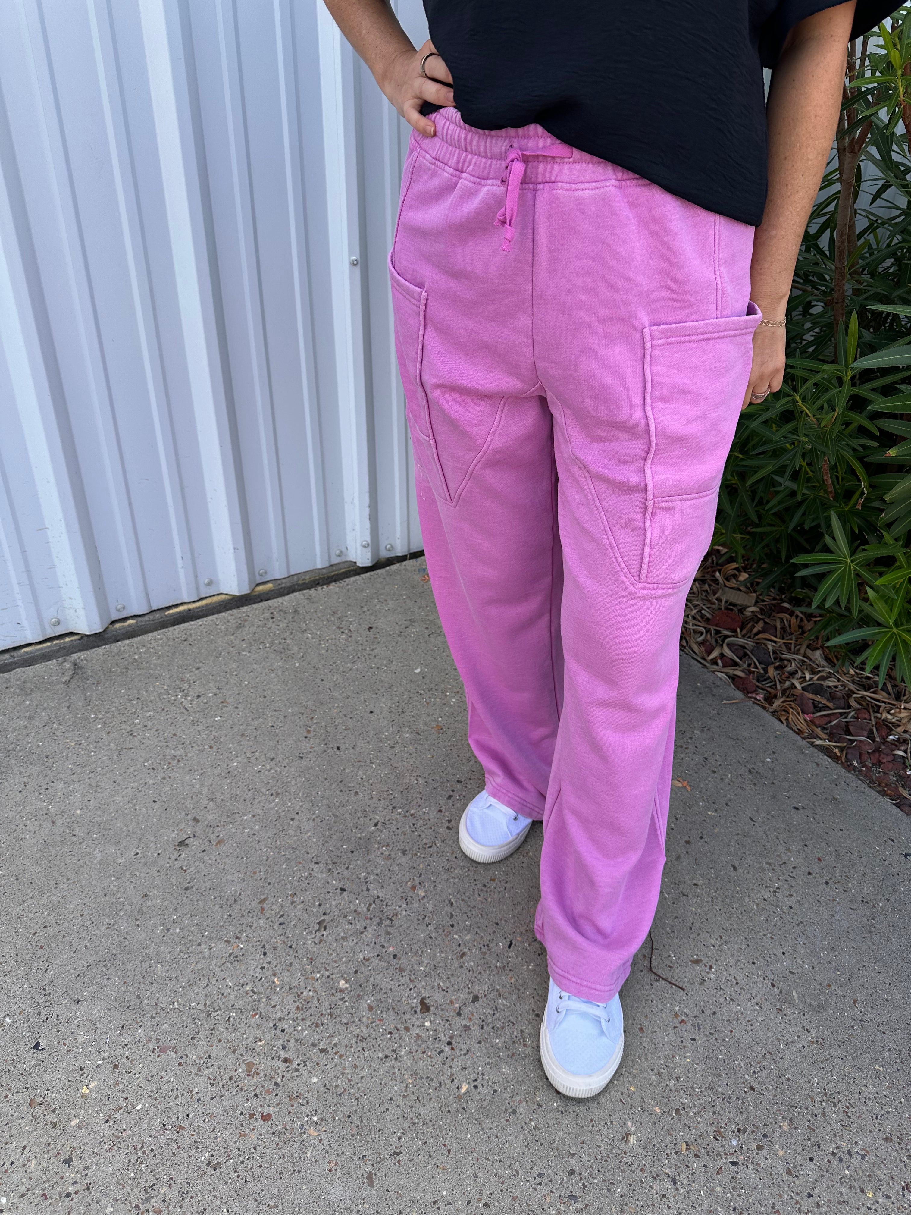 Step into comfort with the Faded Feels Magenta Lounge Pants! These wide leg pants boast a playful high-rise fit and an adjustable drawstring waistband that keeps you cozy all day long. Featuring eye-catching front patch pockets and cool exposed seams, they blend casual ease with a touch of flair. Made from soft washed terry cotton, their vintage vibe and relaxed silhouette make them perfect for lounging or kicking back in style. Don't forget to add the matching pullover top to your cart as well!
