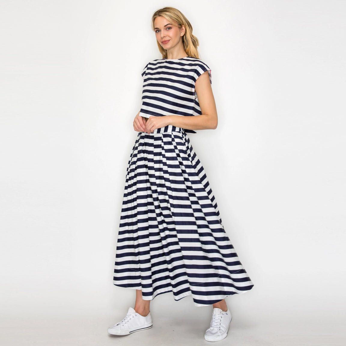 Step into sunshine with the Navy Coastline Set, featuring a playful navy and white striped crop top paired with a breezy box-pleated midi skirt. Fully lined for comfort and easy to wear, the skirt secures with a sleek metal zipper for a polished finish. Perfect for those carefree days when style meets seaside charm.