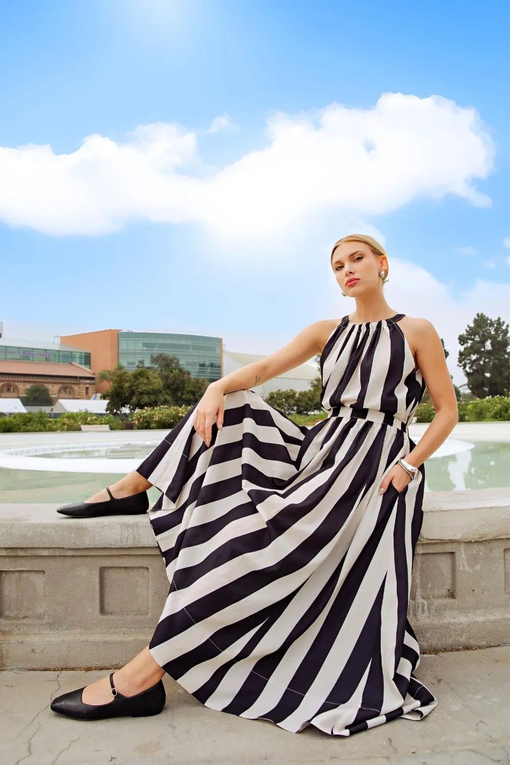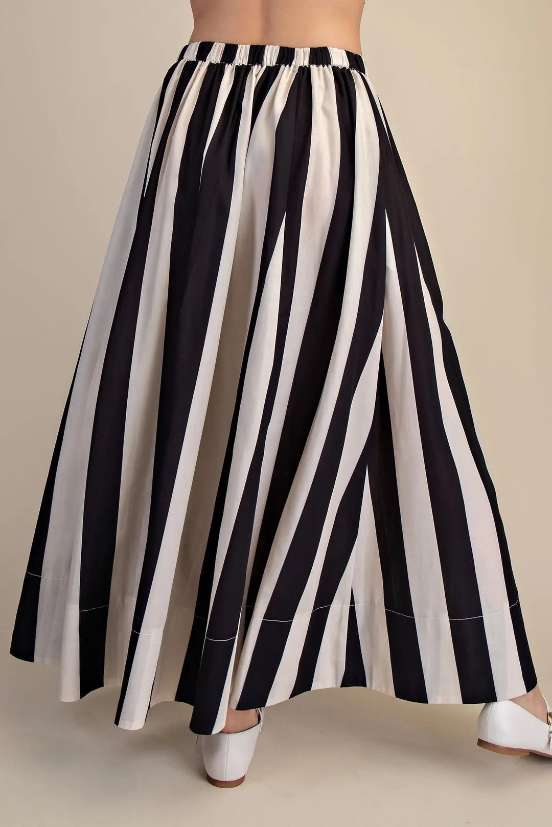 Make a statement with this bold black and white striped maxi skirt that commands attention from every angle. The dramatic flare silhouette creates effortless movement and flattering volume, while the timeless stripe pattern keeps things chic and versatile. Perfect for pairing with fitted tops or oversized blouses, this show stopping piece transitions seamlessly from day to night. Whether you're dancing through the weekend or turning heads at your next event, this skirt delivers major style with zero fuss. Don't forget to add the matching top to your cart as well!
