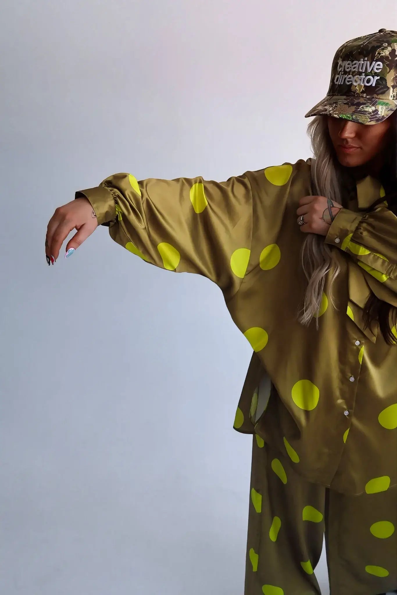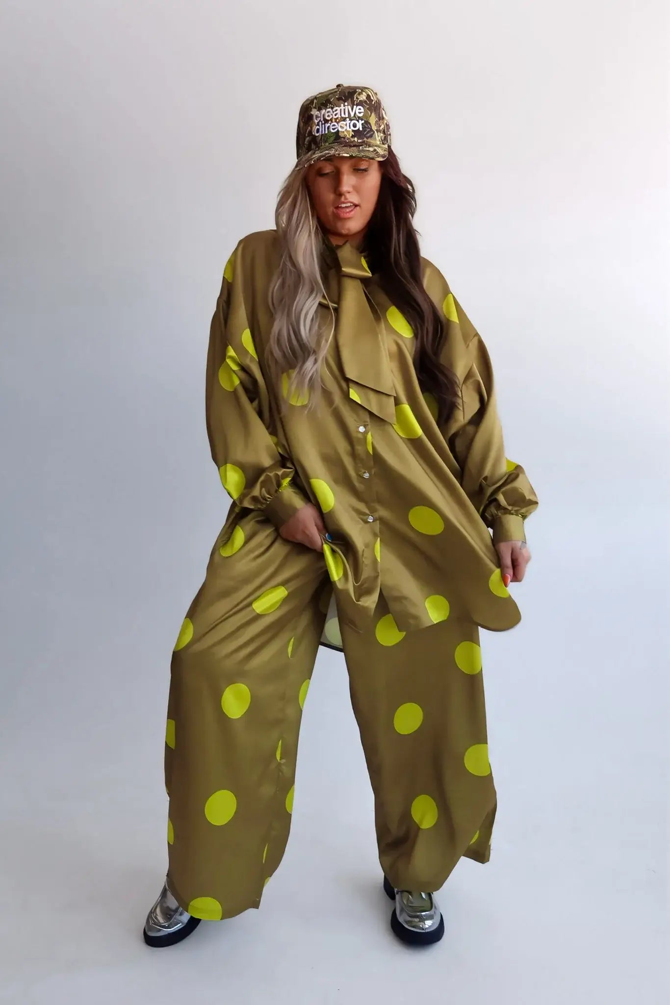 Playful, comfortable, and still put together. The Spot On Bow Satin Set blends green on green polka dots with a flowy satin like fabric that feels as easy as it looks styled. A statement bow at the top balances the relaxed wide- leg trousers, making it the set you can throw on and still look intentional.