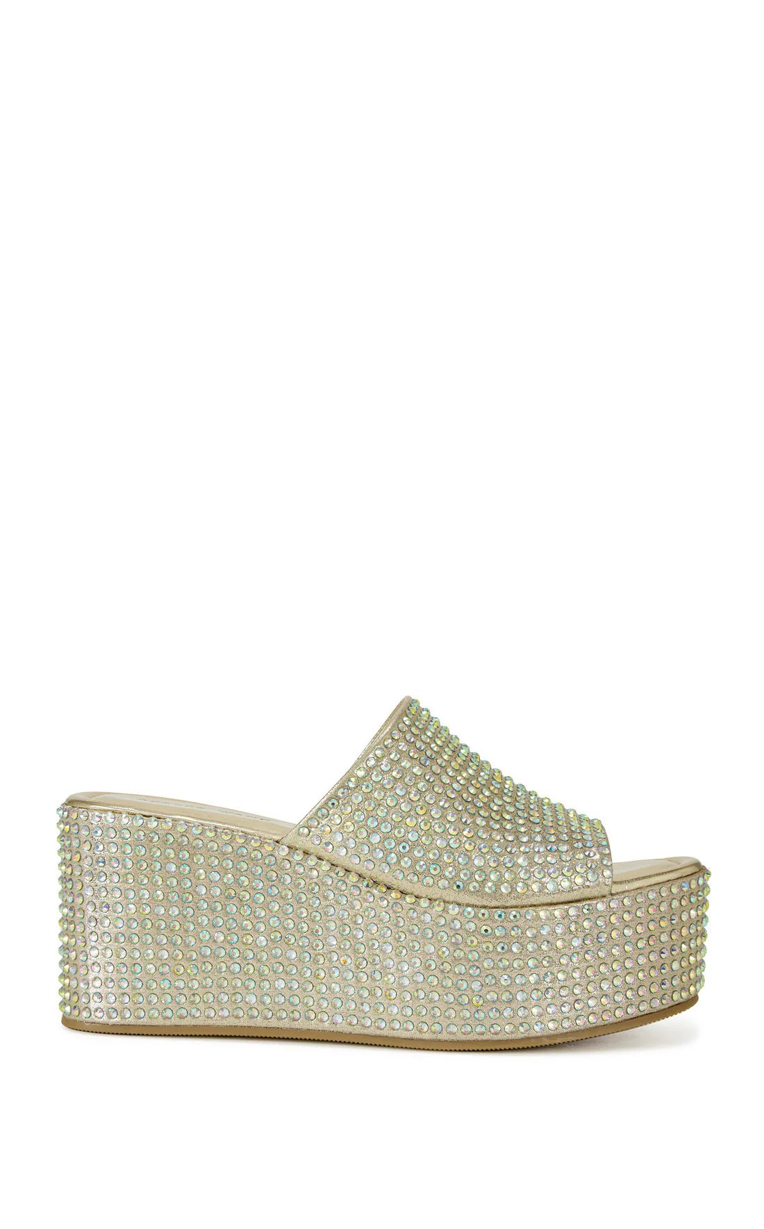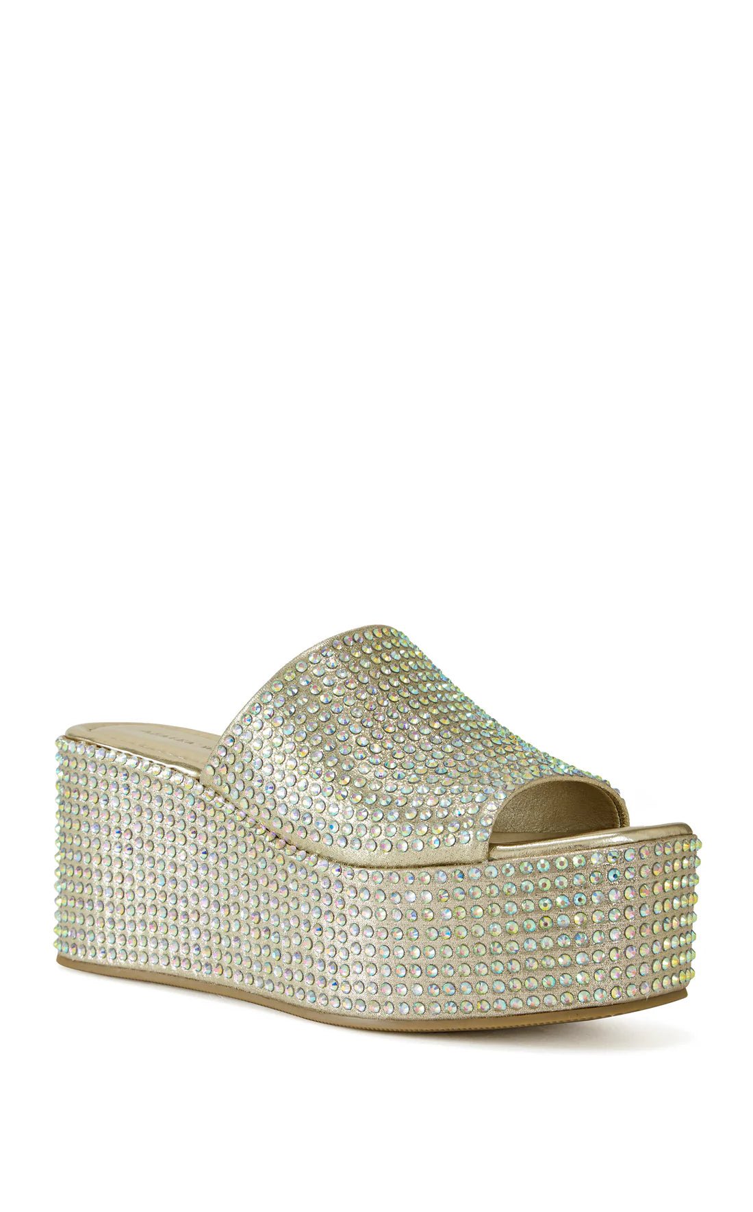 Expertly crafted with a gold platform and open toe design, the ARACHNA-GOLD platform sandal stands out with beautiful rhinestone embellishments on the sole and foot strap. Perfect for any occasion, these slip on sandals provide both style and comfort. Elevate your Summer looks with a touch of glamour.